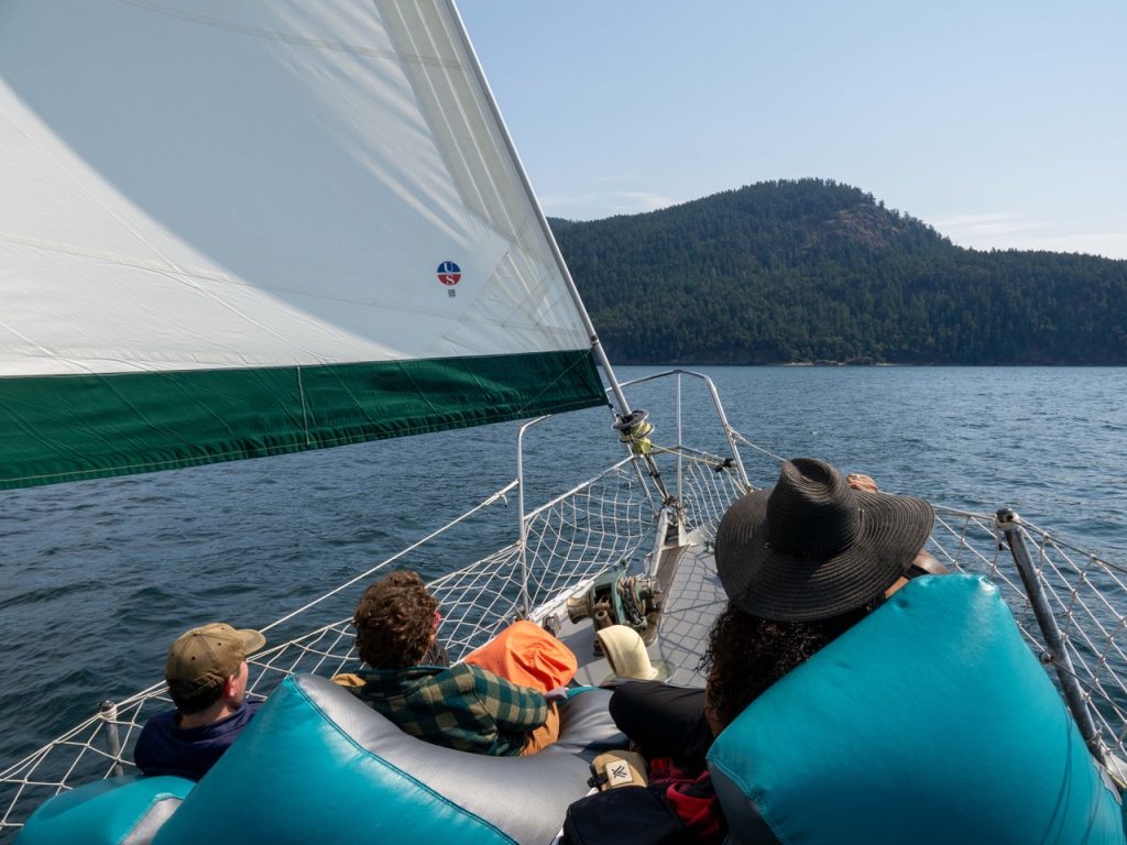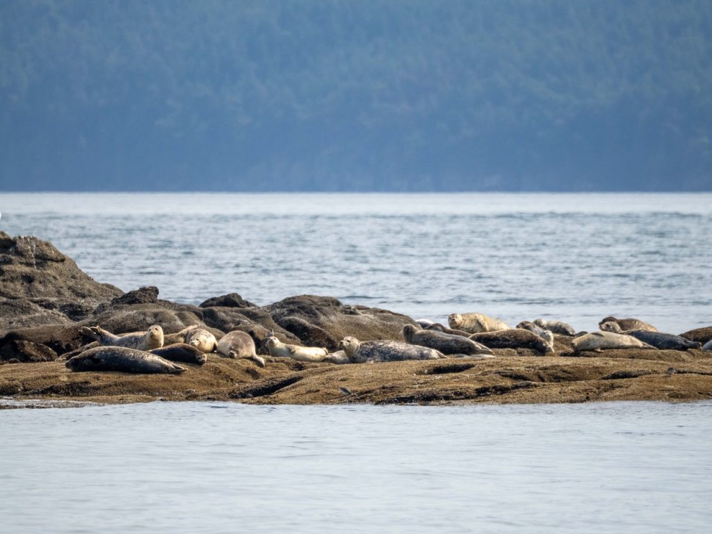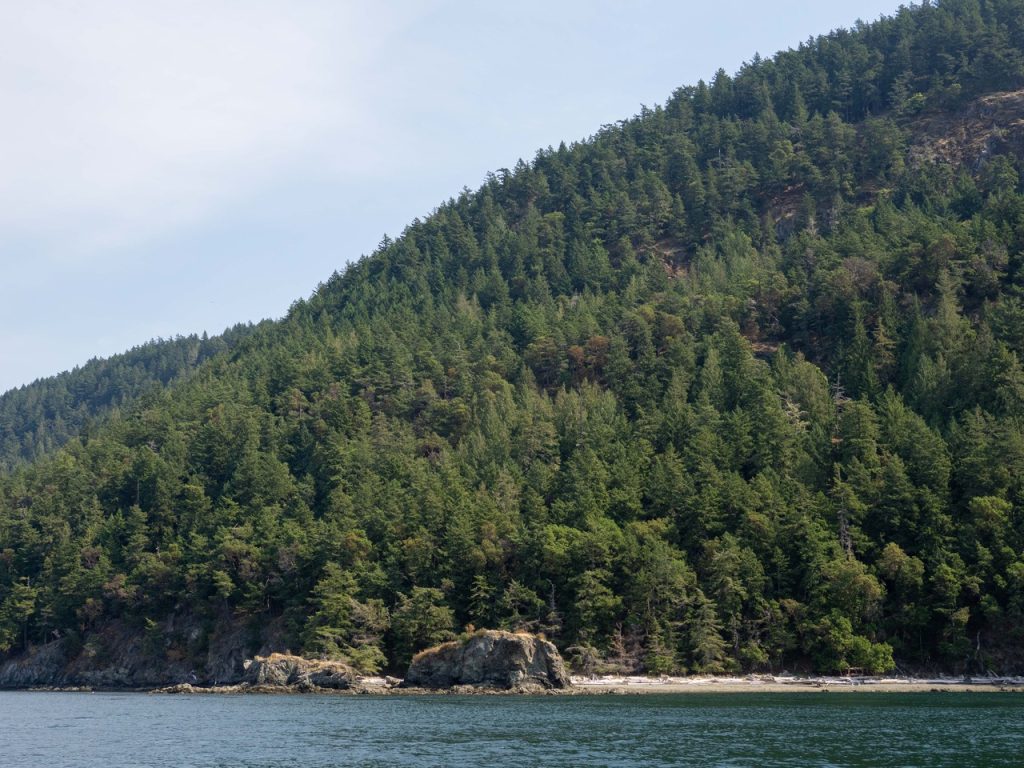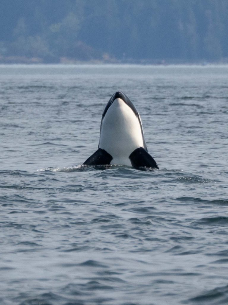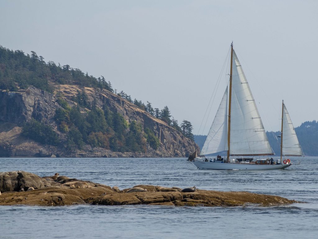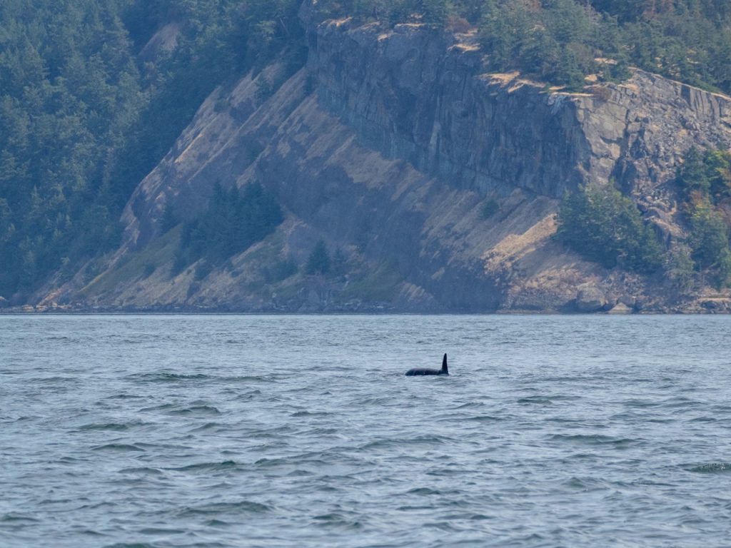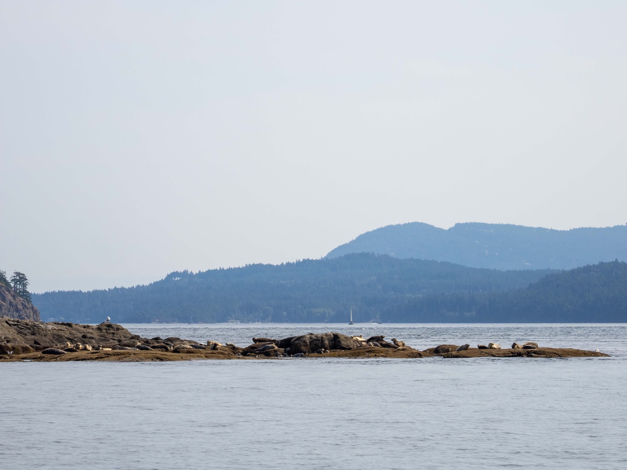 August 27, 2025 – We heard reports of Biggs/Transient orcas T49A’s hunting in New Channel so we sailed north. We cut through the Wasp Islands and Spring Pass seeing harbor seals and bald eagles and continued towards White Rock. The orcas had been sharing a meal west of White Rock and we met them there. As we arrived the orcas traveled at speed to White Rock giving a close pass to the island. They may have grabbed a harbor seal as we witnessed a couple spy hops and more milling before they passed White Rock again and headed north to Sandy Point, Waldron Island. We left them at Sandy Pt and sailed to Pt Disney. Continuing the Waldron coastline we saw a hawk before crossing to Turtleback Mountain on Orcas Island. Hugged the Orcas Island forested coastline and returned via the Wasp Islands to Friday Harbor.