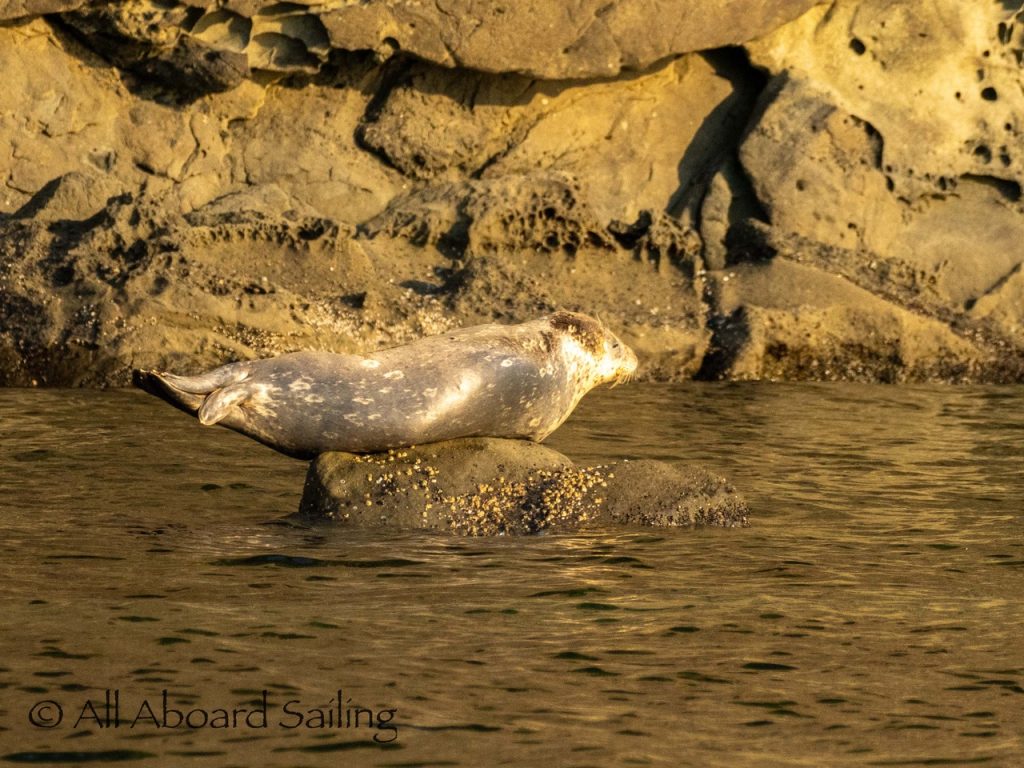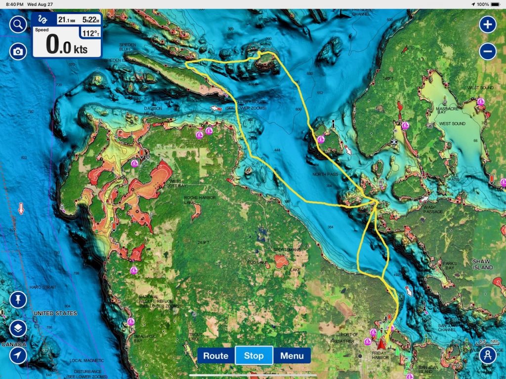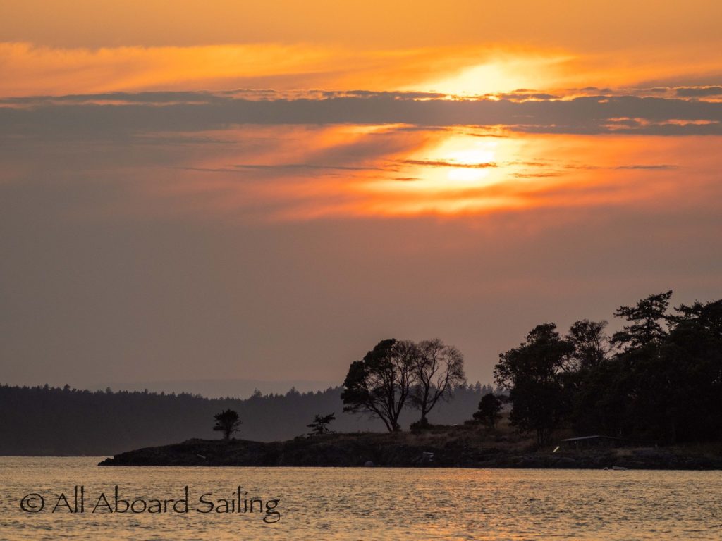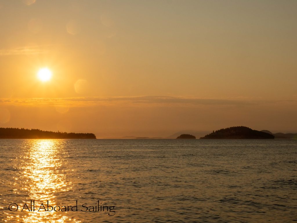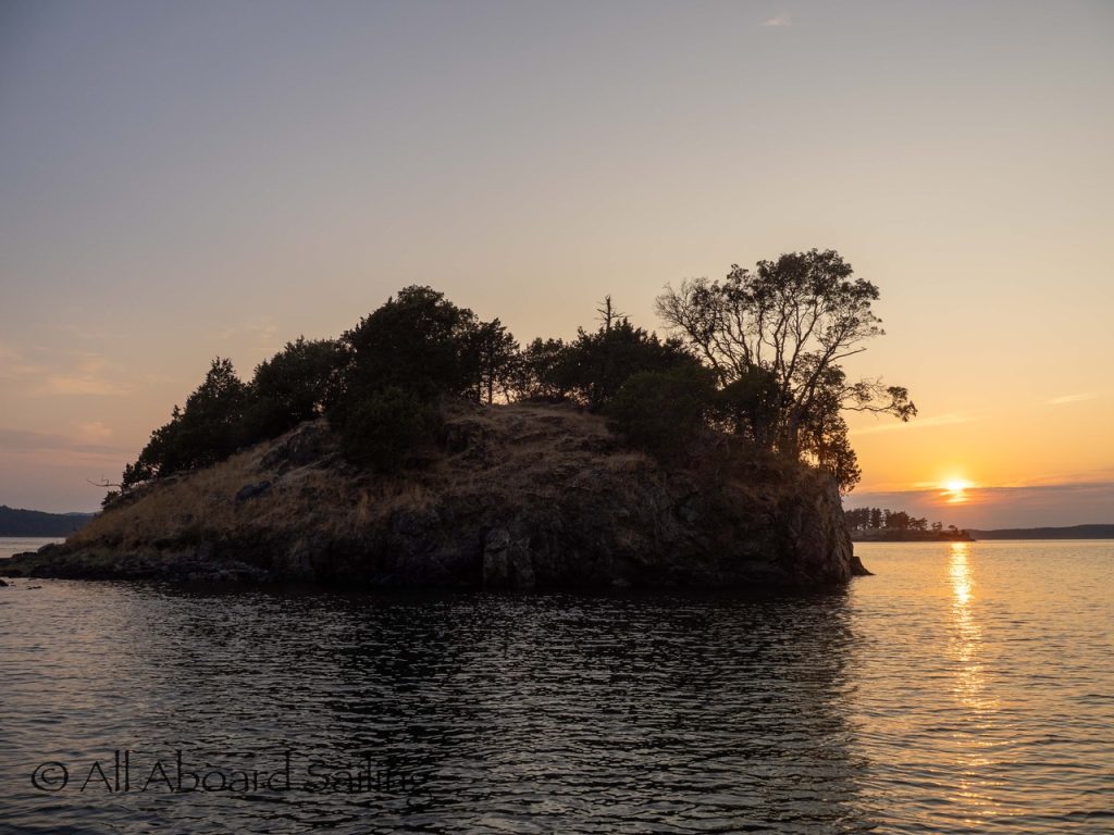 August 27, 2025 – Half day sail north. We explored north of Spieden Island in New Channel and enjoyed BBQ sockeye salmon and veggie supper at Flattop Island. Returned whilst watching a beautiful sunset