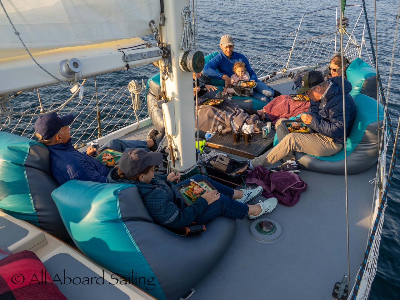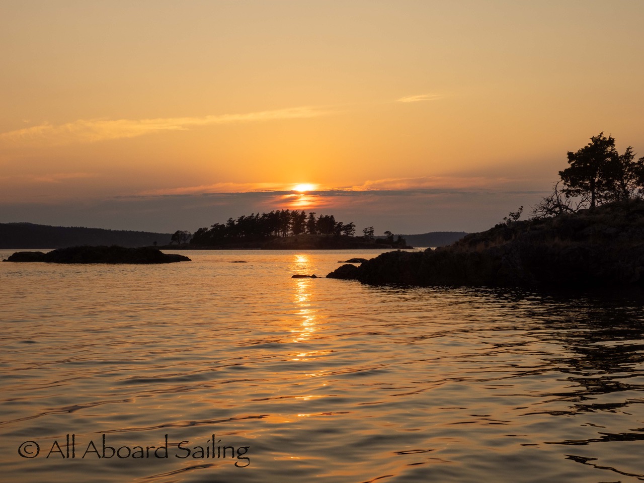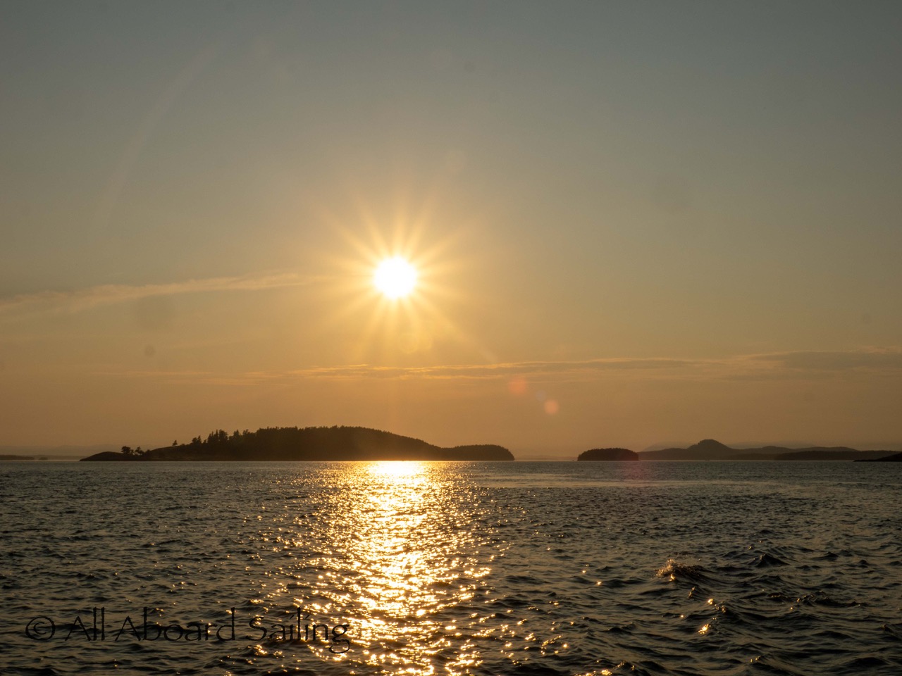 August 27, 2025 – Half day sail north. We explored north of Spieden Island in New Channel and enjoyed BBQ sockeye salmon and veggie supper at Flattop Island. Returned whilst watching a beautiful sunset