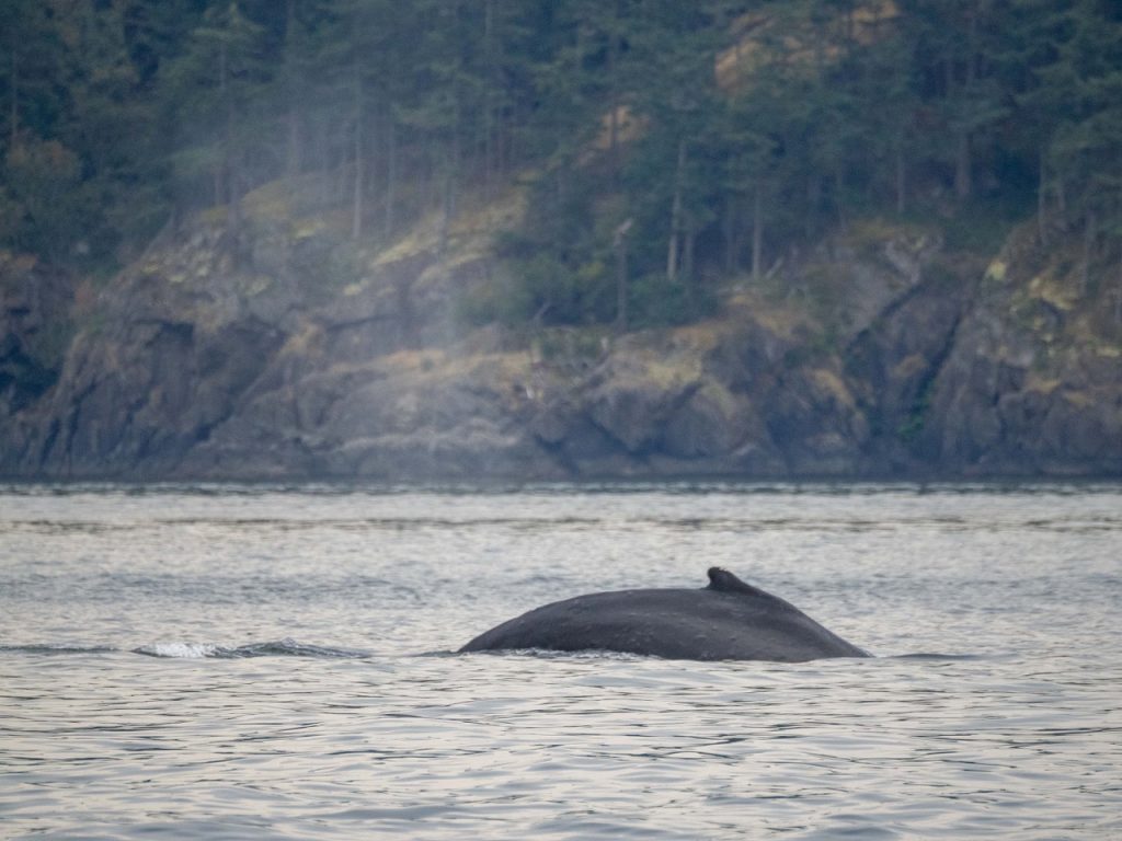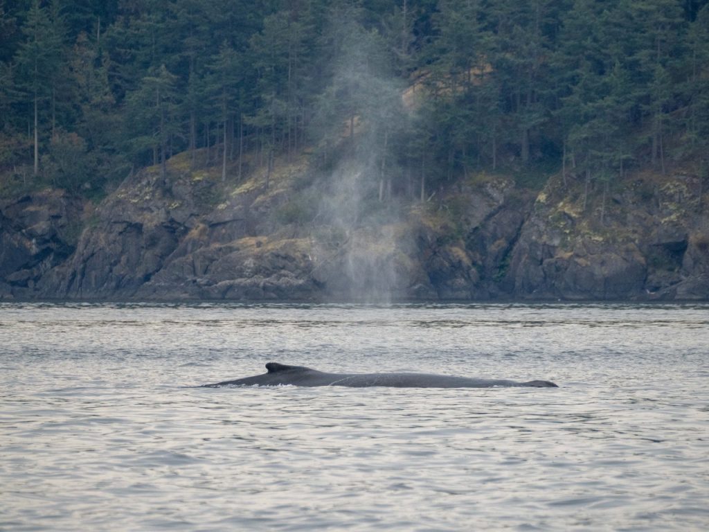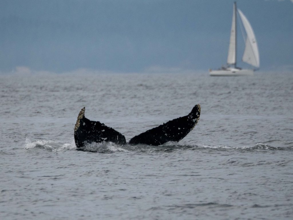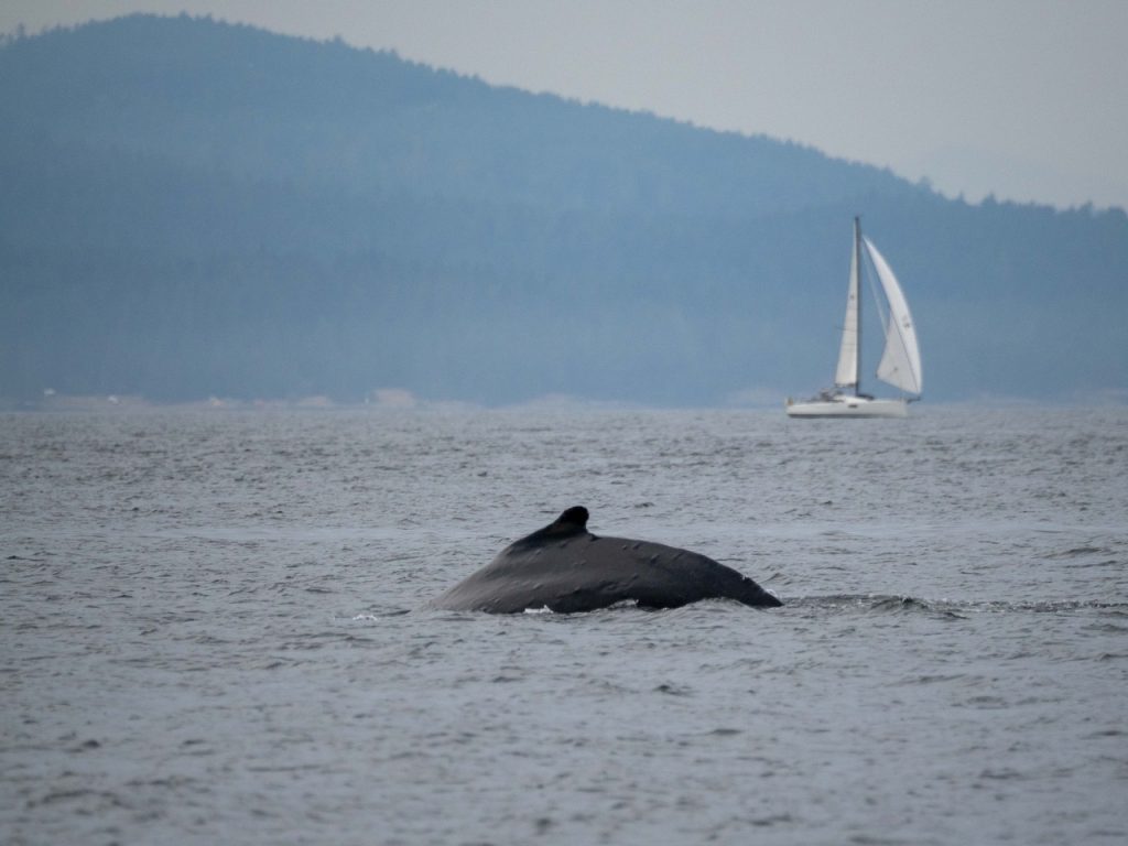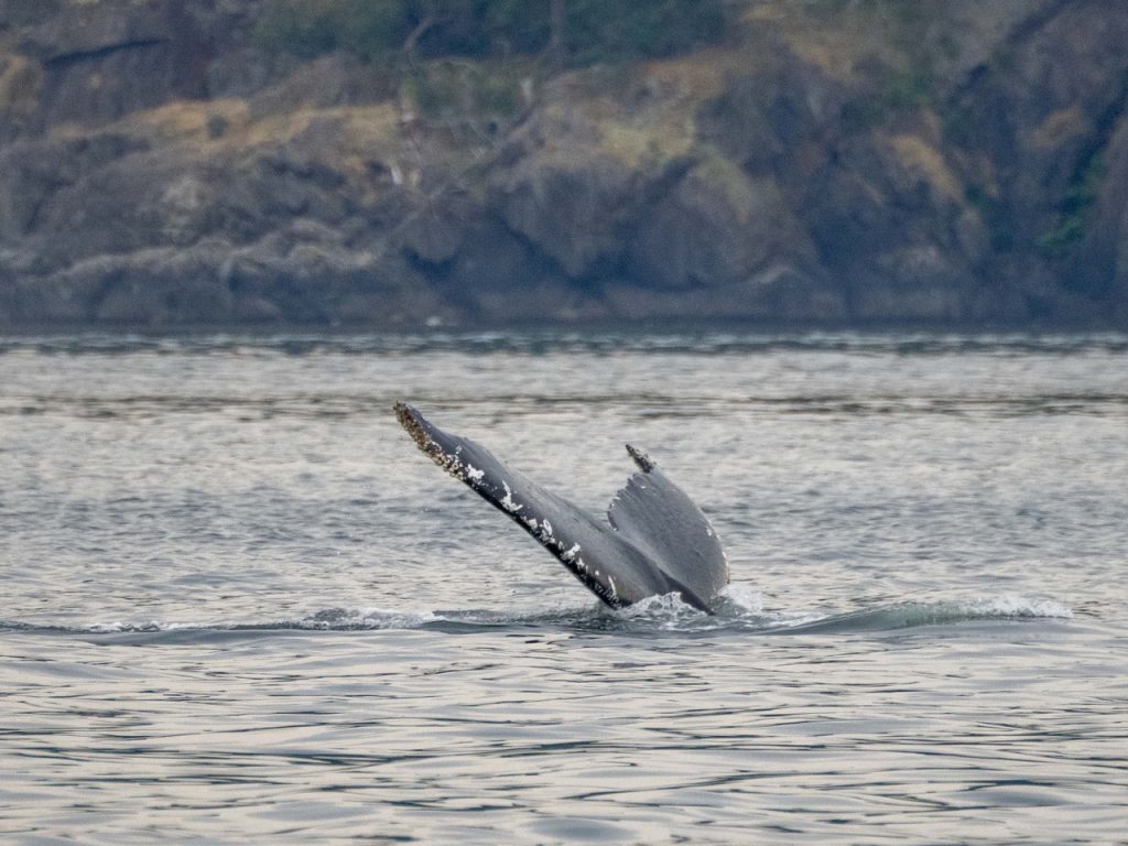 August 28, 2025 – With a report of Biggs/Transient orcas T49A’s (minus T49A1 and T49A2) north San Juan Channel we headed north. We came through the Wasp Islands and heard the orcas were westbound along Stuart Island shoreline headed for Turn Pt. Coming through New Channel having viewed harbor seals hauled out and bald eagles we drifted the Spieden Island shoreline. We decided to cut through Johns Pass and were able to meet the orcas as they headed north in Boundary Pass. After having lovely views we left them at Pender Island. On our return we spotted a humpback whale who had earlier been reported coming down President Channel. The tail flukes helped us to ID the animal as BCX1675 “Strike” a female who goes to Mexico for breeding season and is the mother of 2023 calf known as “Thunderbolt”. We branched off to Turn Pt Lighthouse and Lovers Leap returning by way of south Stuart and south Spieden Island shorelines. Exotic animals on Spieden included fallow deer with an albino or leucistic, sika deer and Mouflon sheep. There was also a bald eagle sitting near it’s nest. A great day on our extended half day sail.
