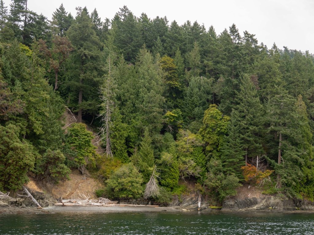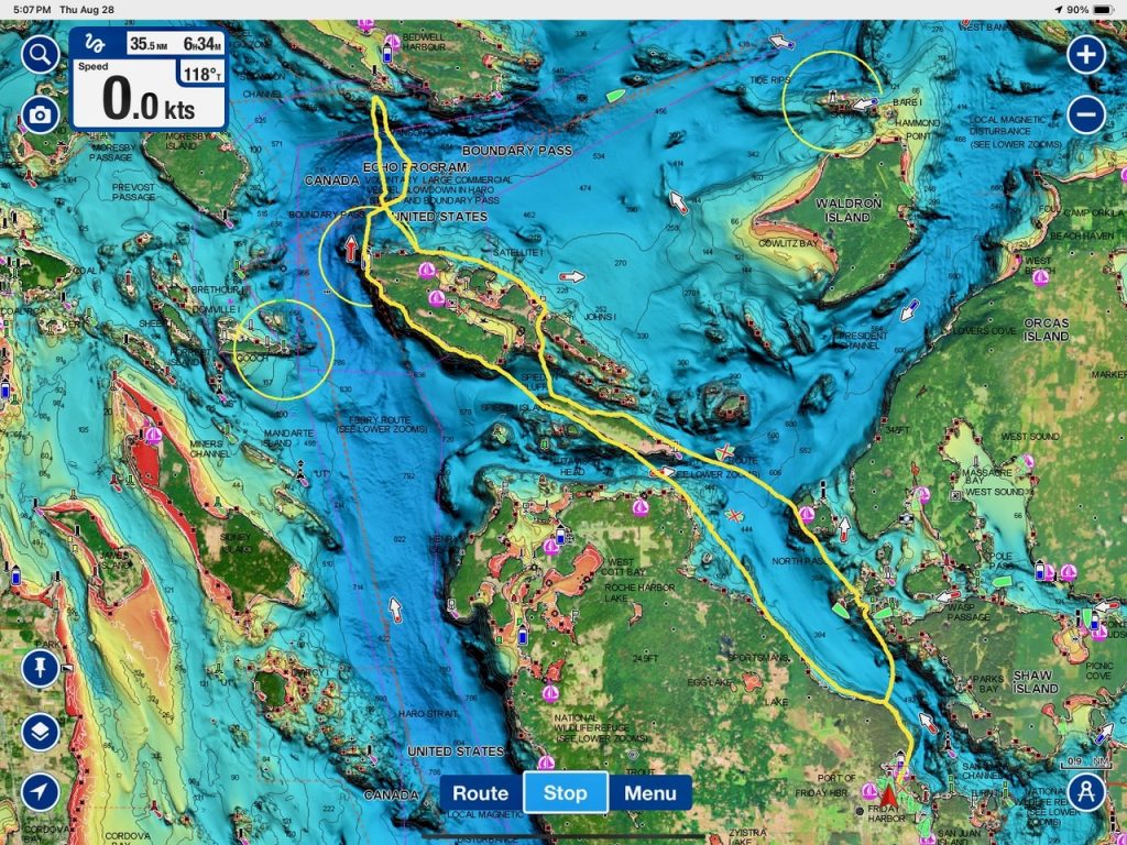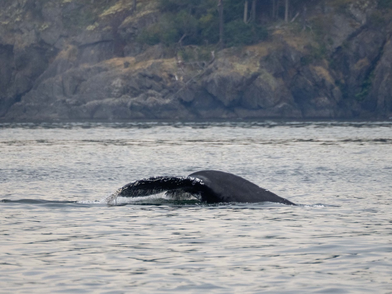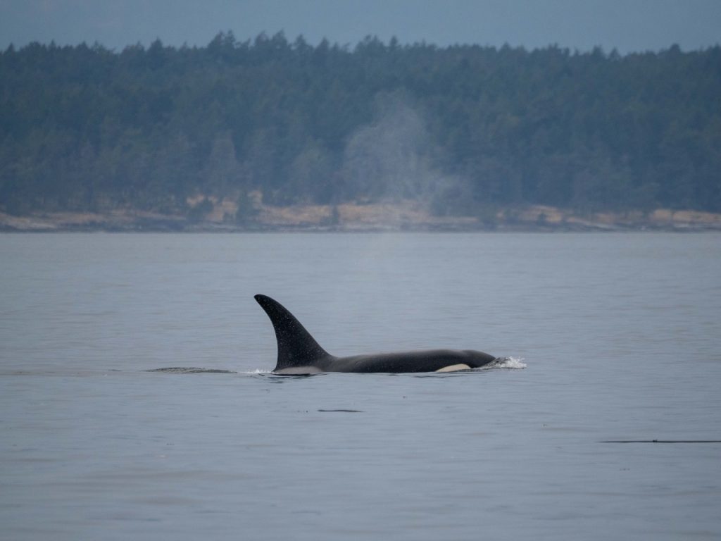 August 28, 2025 – With a report of Biggs/Transient orcas T49A’s (minus T49A1 and T49A2) north San Juan Channel we headed north. We came through the Wasp Islands and heard the orcas were westbound along Stuart Island shoreline headed for Turn Pt. Coming through New Channel having viewed harbor seals hauled out and bald eagles we drifted the Spieden Island shoreline. We decided to cut through Johns Pass and were able to meet the orcas as they headed north in Boundary Pass. After having lovely views we left them at Pender Island. On our return we spotted a humpback whale who had earlier been reported coming down President Channel. The tail flukes helped us to ID the animal as BCX1675 “Strike” a female who goes to Mexico for breeding season and is the mother of 2023 calf known as “Thunderbolt”. We branched off to Turn Pt Lighthouse and Lovers Leap returning by way of south Stuart and south Spieden Island shorelines. Exotic animals on Spieden included fallow deer with an albino or leucistic, sika deer and Mouflon sheep. There was also a bald eagle sitting near it’s nest. A great day on our extended half day sail.