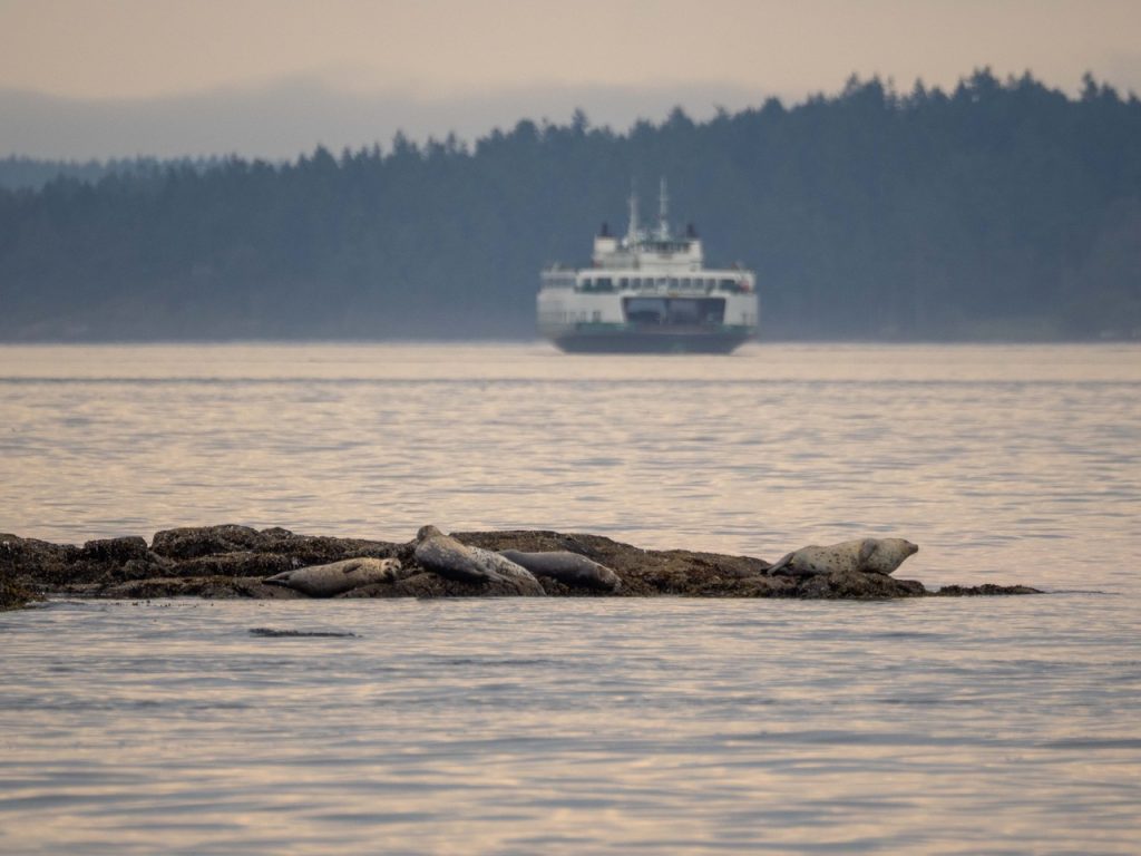 Harbor seals, Low Island, with ferry in distance