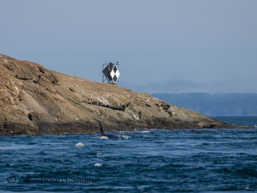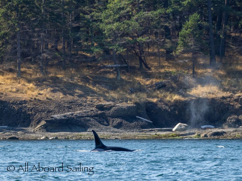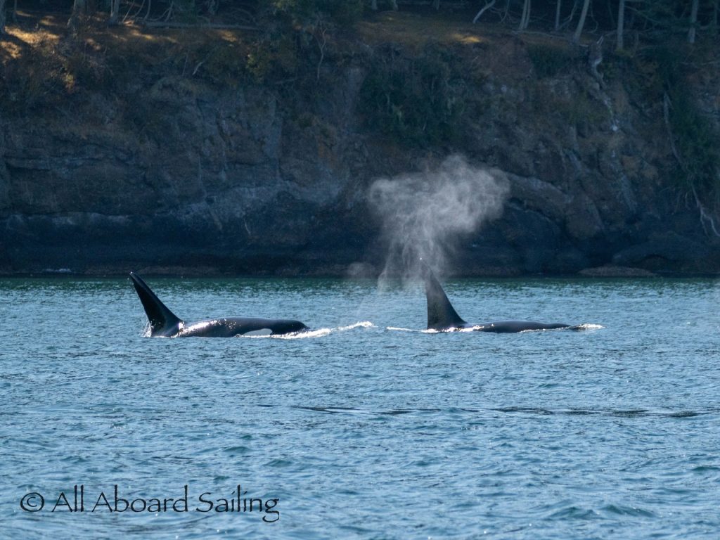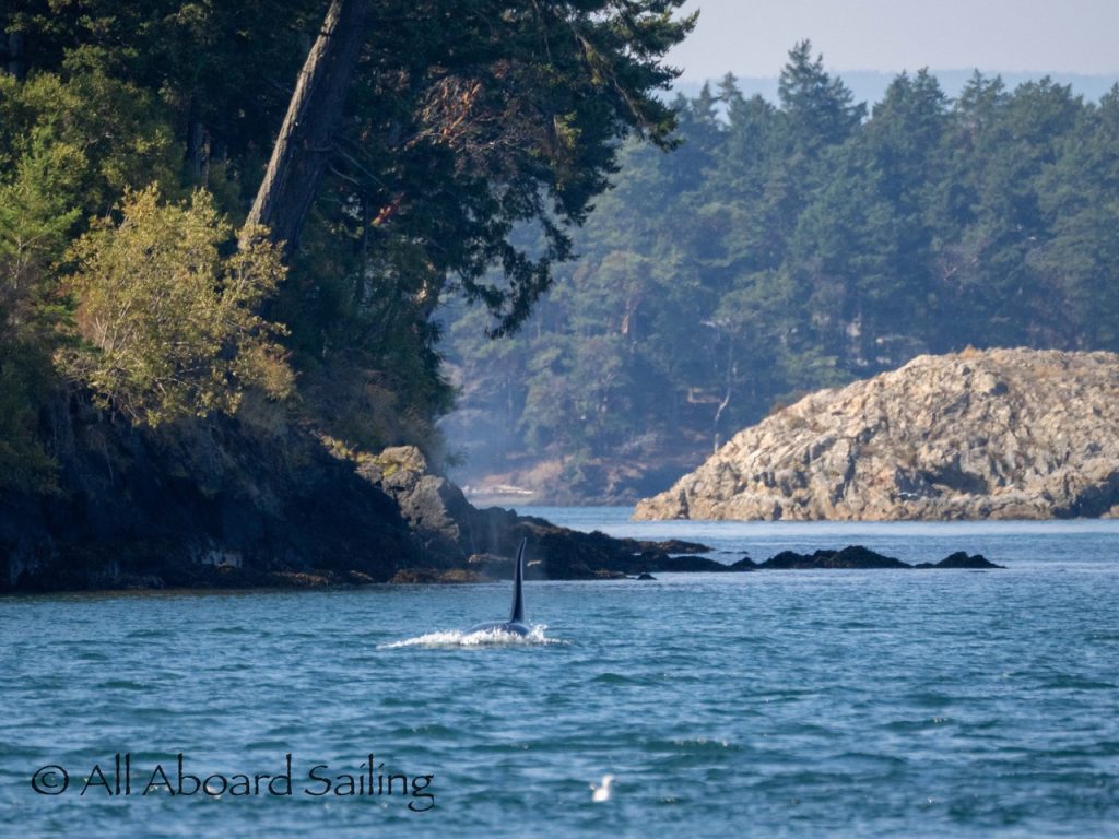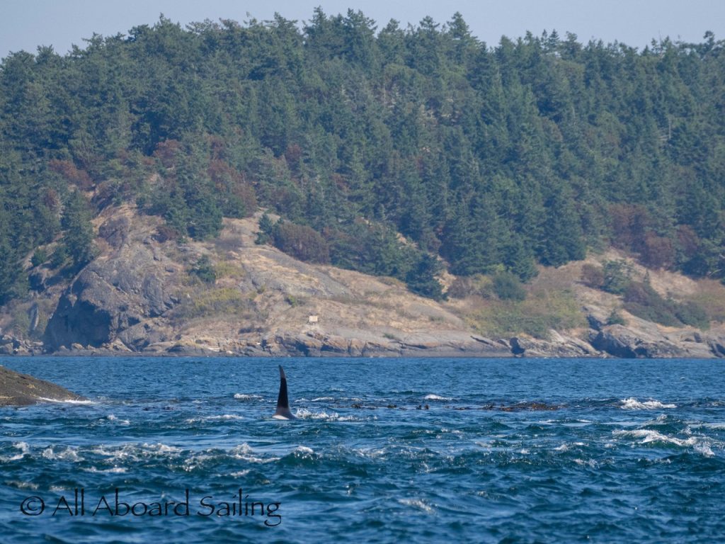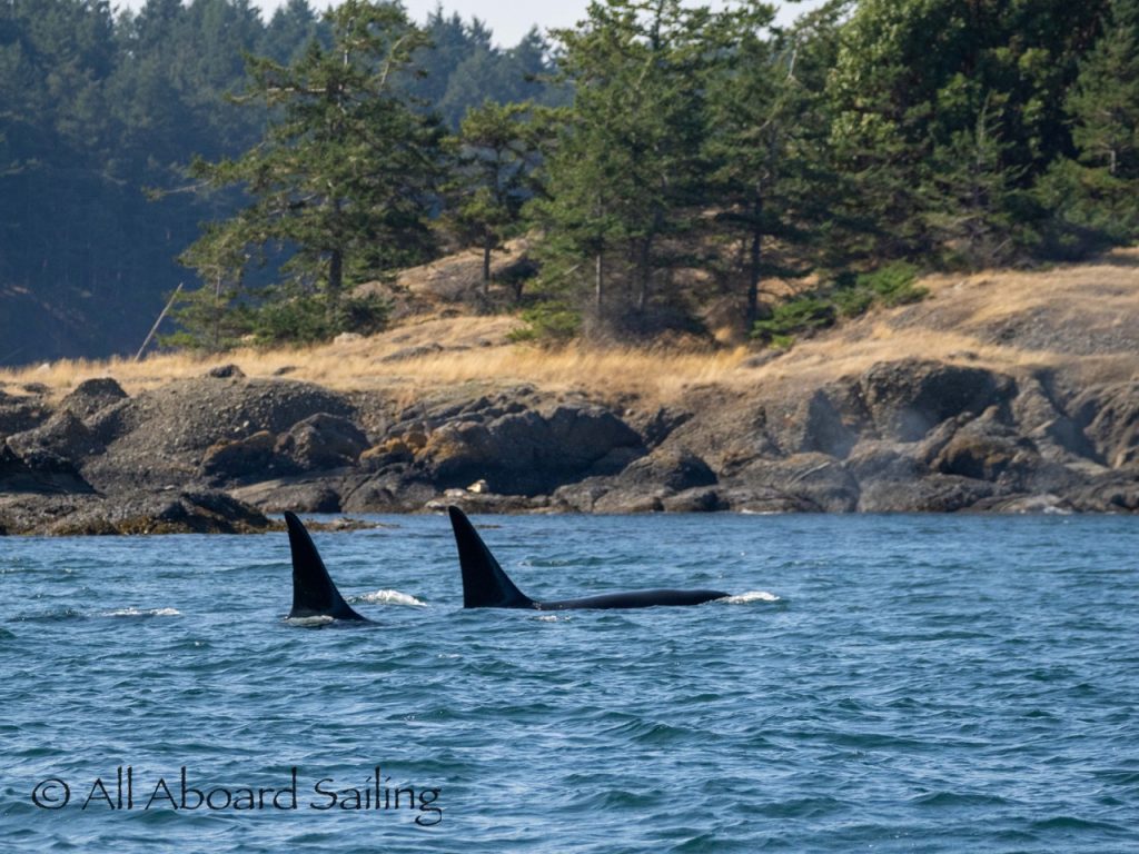 Sept 11, 2025 – With news of the Biggs/Transient orca brothers T60D (born 2004) and T60E (born 2008) northbound in Haro Strait we headed north. Along the San Juan Island shoreline near Pt Caution we saw a great blue heron in a tree. The sea mist was lifting to the north with ribbons of fog on the coastline to the south. We crossed to the Wasp Islands and to Jones Island catching the ebb out to Spieden Channel. The orcas approached from Davidson Head and crossed to Spieden Island and Green Pt against the strong ebb. They circled the Cactus Island and explored the kelp forest before continuing west. We left them and met a humpback whale, BCY1463 “Malachite” (2021 calf of BCX1210 “Slate”) who had come down President Channel and was headed north. Coming back via Flattop Island and picked up strong winds for a close-hauled sail to Mineral Pt. Kept to the San Juan Island shoreline headed south to return to Friday Harbor.