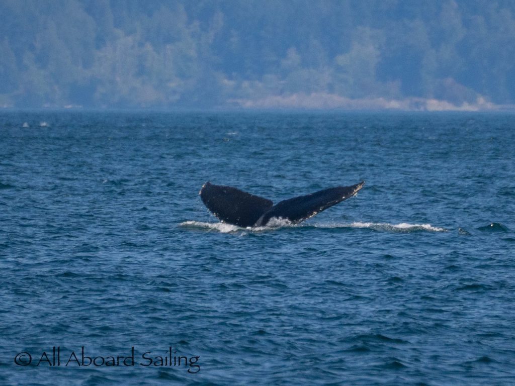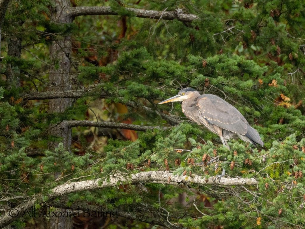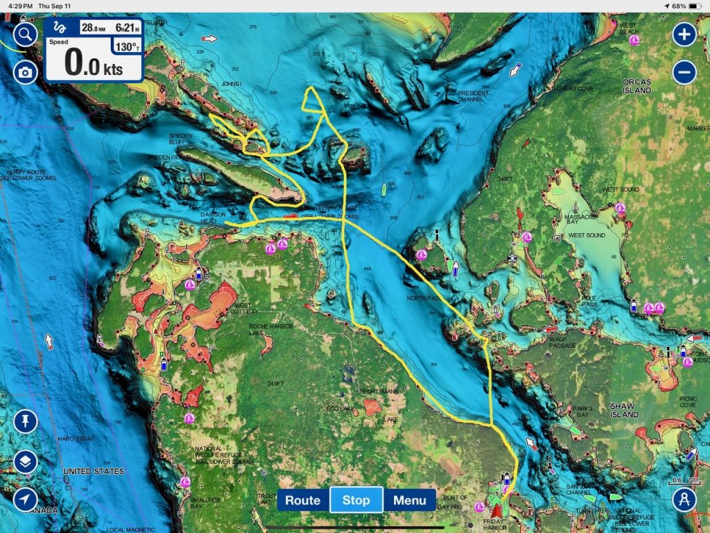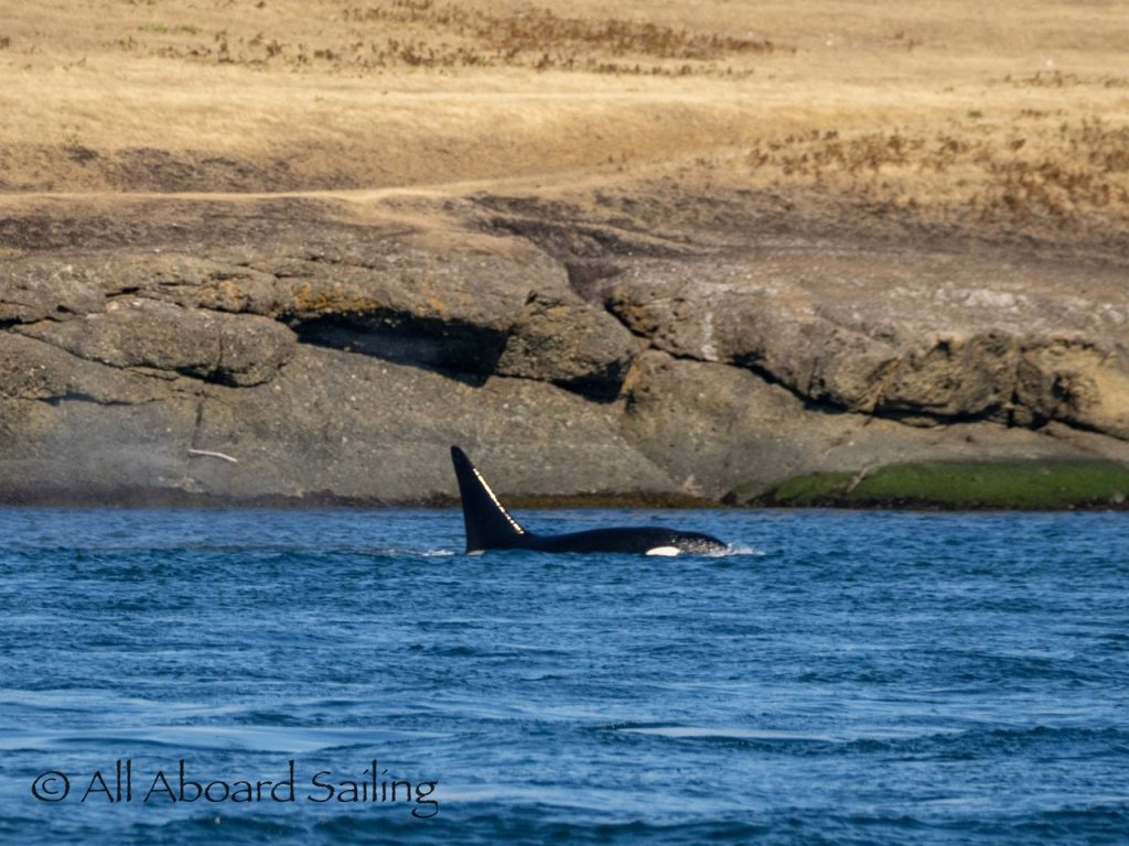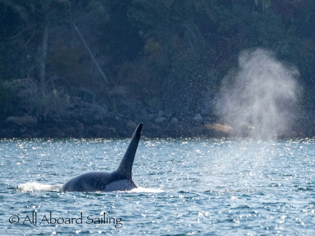 Sept 11, 2025 – With news of the Biggs/Transient orca brothers T60D (born 2004) and T60E (born 2008) northbound in Haro Strait we headed north. Along the San Juan Island shoreline near Pt Caution we saw a great blue heron in a tree. The sea mist was lifting to the north with ribbons of fog on the coastline to the south. We crossed to the Wasp Islands and to Jones Island catching the ebb out to Spieden Channel. The orcas approached from Davidson Head and crossed to Spieden Island and Green Pt against the strong ebb. They circled the Cactus Island and explored the kelp forest before continuing west. We left them and met a humpback whale, BCY1463 “Malachite” (2021 calf of BCX1210 “Slate”) who had come down President Channel and was headed north. Coming back via Flattop Island and picked up strong winds for a close-hauled sail to Mineral Pt. Kept to the San Juan Island shoreline headed south to return to Friday Harbor.