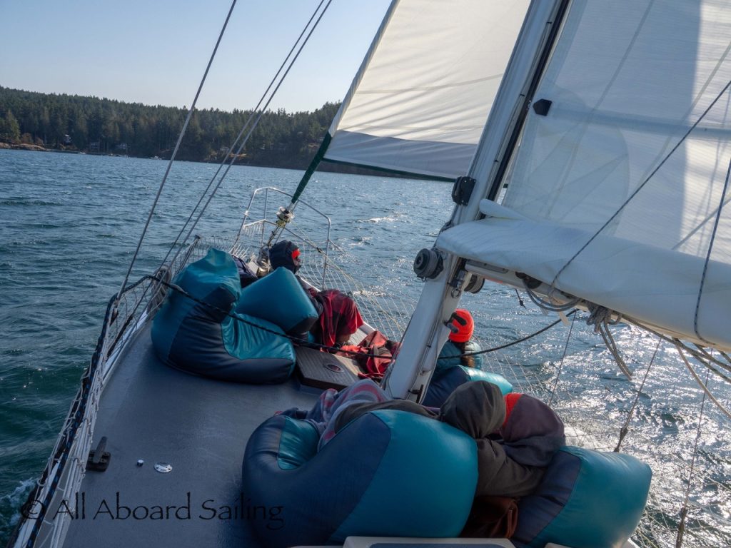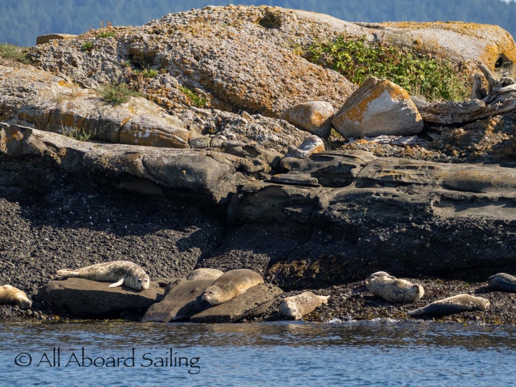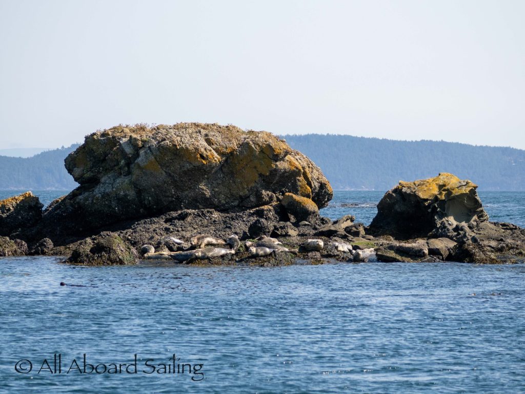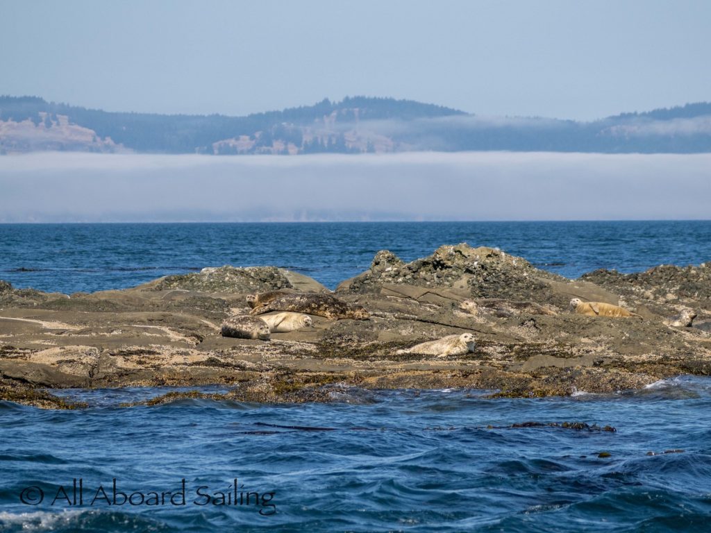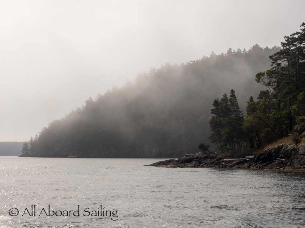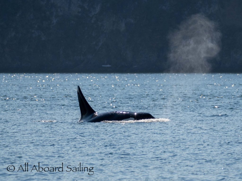 Sept 11, 2025 – With news of the Biggs/Transient orca brothers T60D (born 2004) and T60E (born 2008) northbound in Haro Strait we headed north. Along the San Juan Island shoreline near Pt Caution we saw a great blue heron in a tree. The sea mist was lifting to the north with ribbons of fog on the coastline to the south. We crossed to the Wasp Islands and to Jones Island catching the ebb out to Spieden Channel. The orcas approached from Davidson Head and crossed to Spieden Island and Green Pt against the strong ebb. They circled the Cactus Island and explored the kelp forest before continuing west. We left them and met a humpback whale, BCY1463 “Malachite” (2021 calf of BCX1210 “Slate”) who had come down President Channel and was headed north. Coming back via Flattop Island and picked up strong winds for a close-hauled sail to Mineral Pt. Kept to the San Juan Island shoreline headed south to return to Friday Harbor.