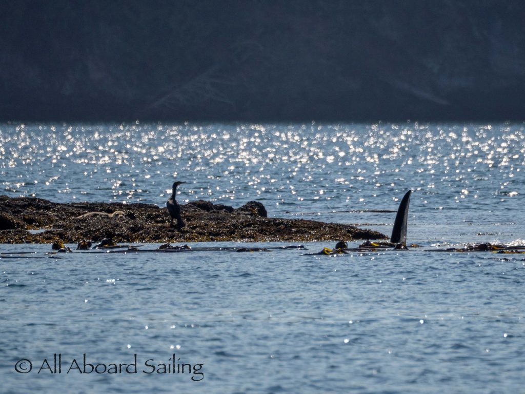 Biggs/Transient orca T60D draped in bull kelp while watched by a cormorant