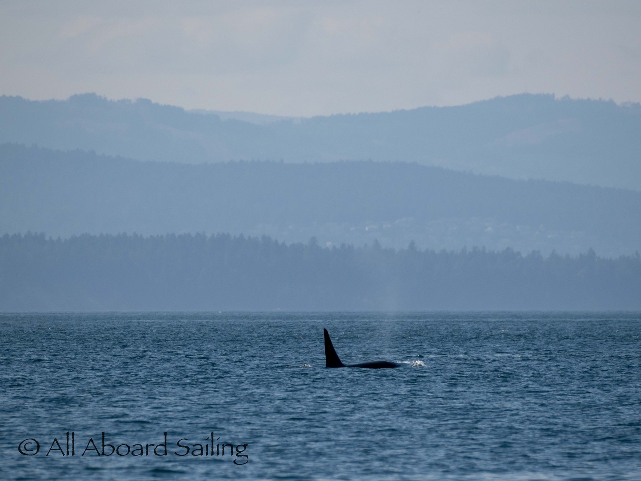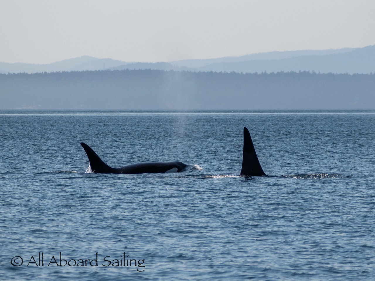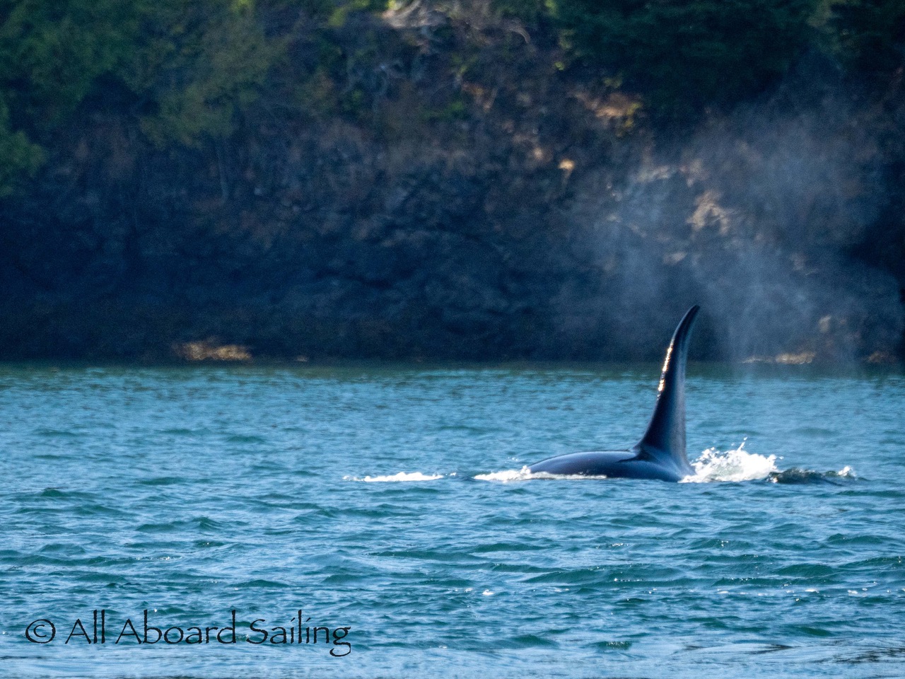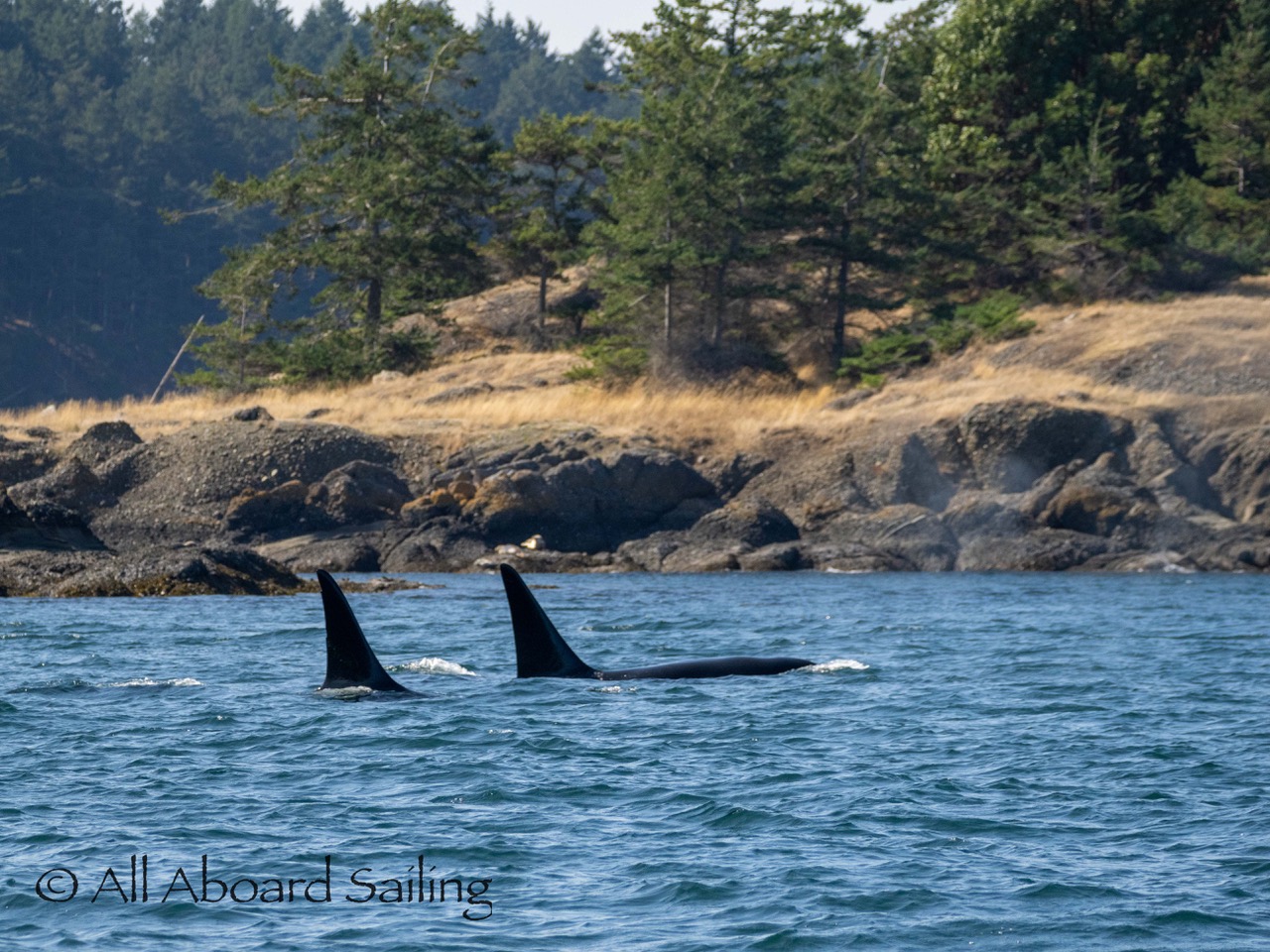 Sept 11, 2025 – With news of the Biggs/Transient orca brothers T60D (born 2004) and T60E (born 2008) northbound in Haro Strait we headed north. Along the San Juan Island shoreline near Pt Caution we saw a great blue heron in a tree. The sea mist was lifting to the north with ribbons of fog on the coastline to the south. We crossed to the Wasp Islands and to Jones Island catching the ebb out to Spieden Channel. The orcas approached from Davidson Head and crossed to Spieden Island and Green Pt against the strong ebb. They circled the Cactus Island and explored the kelp forest before continuing west. We left them and met a humpback whale, BCY1463 “Malachite” (2021 calf of BCX1210 “Slate”) who had come down President Channel and was headed north. Coming back via Flattop Island and picked up strong winds for a close-hauled sail to Mineral Pt. Kept to the San Juan Island shoreline headed south to return to Friday Harbor.