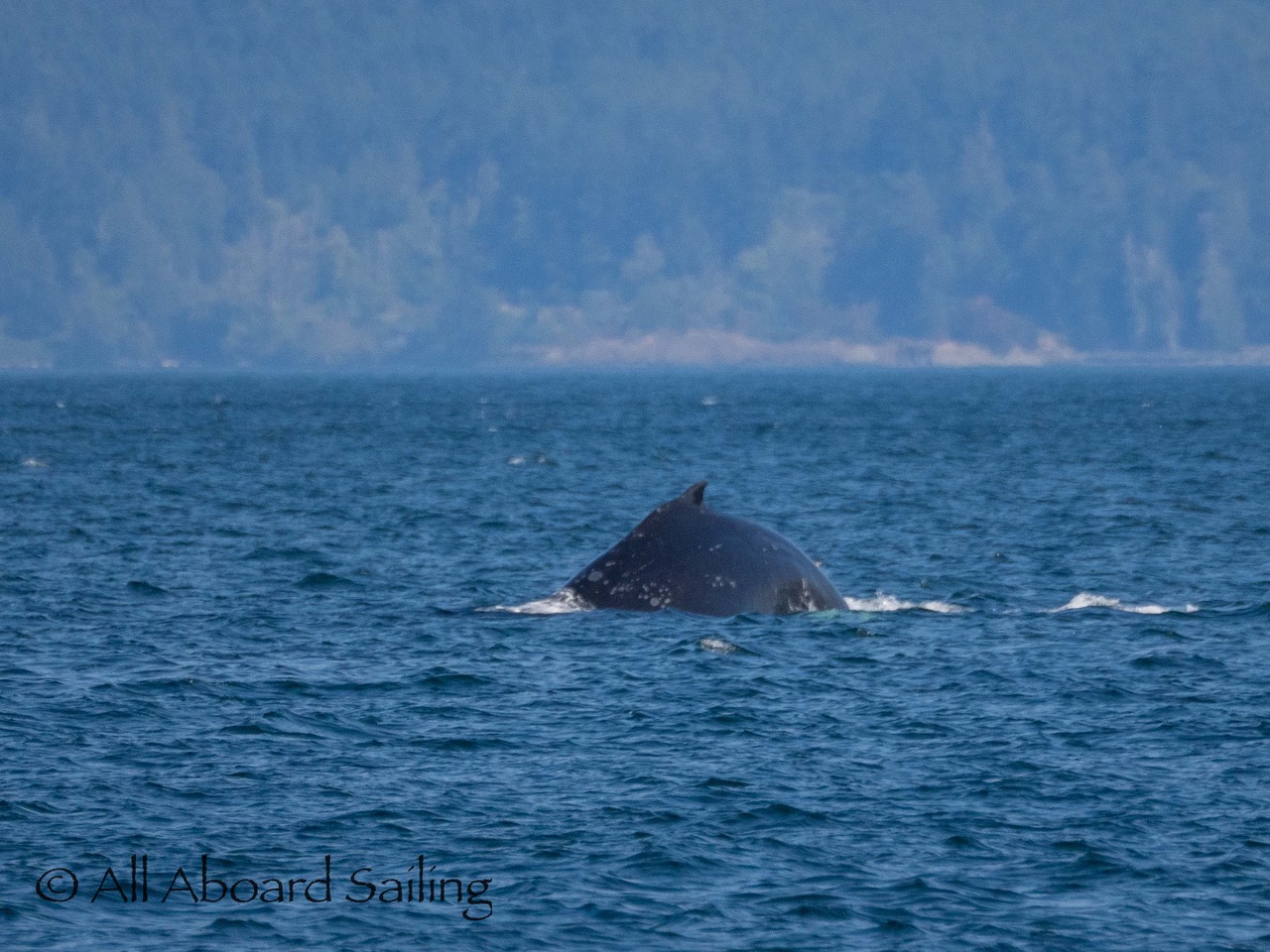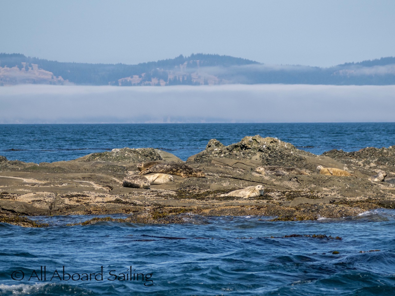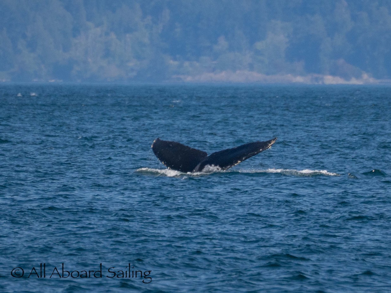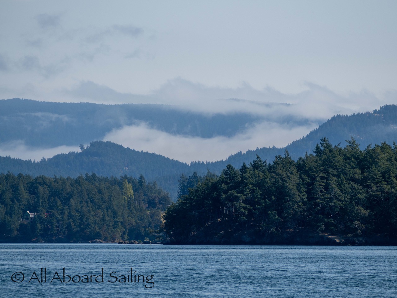 Sept 11, 2025 – With news of the Biggs/Transient orca brothers T60D (born 2004) and T60E (born 2008) northbound in Haro Strait we headed north. Along the San Juan Island shoreline near Pt Caution we saw a great blue heron in a tree. The sea mist was lifting to the north with ribbons of fog on the coastline to the south. We crossed to the Wasp Islands and to Jones Island catching the ebb out to Spieden Channel. The orcas approached from Davidson Head and crossed to Spieden Island and Green Pt against the strong ebb. They circled the Cactus Island and explored the kelp forest before continuing west. We left them and met a humpback whale, BCY1463 “Malachite” (2021 calf of BCX1210 “Slate”) who had come down President Channel and was headed north. Coming back via Flattop Island and picked up strong winds for a close-hauled sail to Mineral Pt. Kept to the San Juan Island shoreline headed south to return to Friday Harbor.