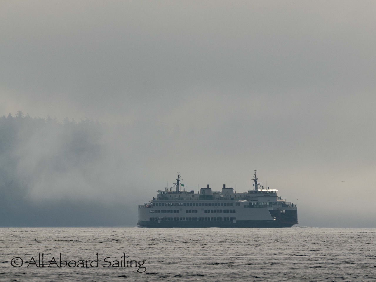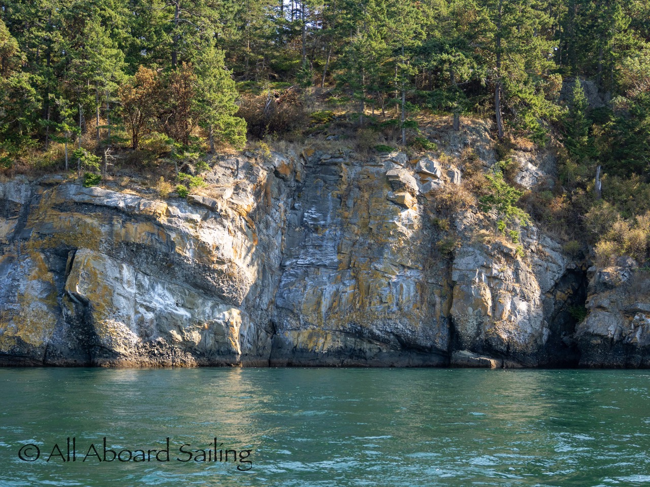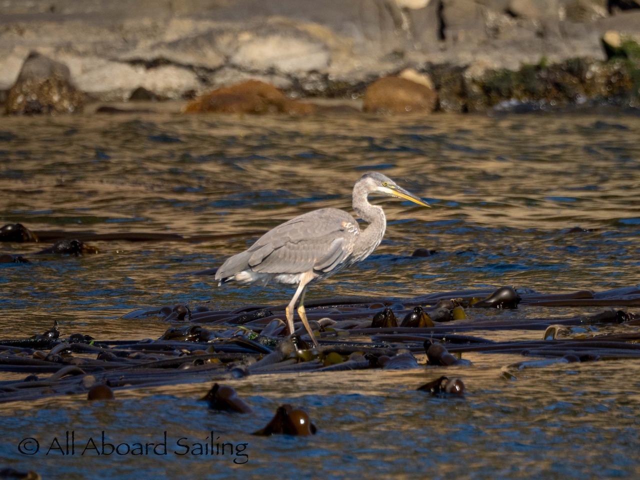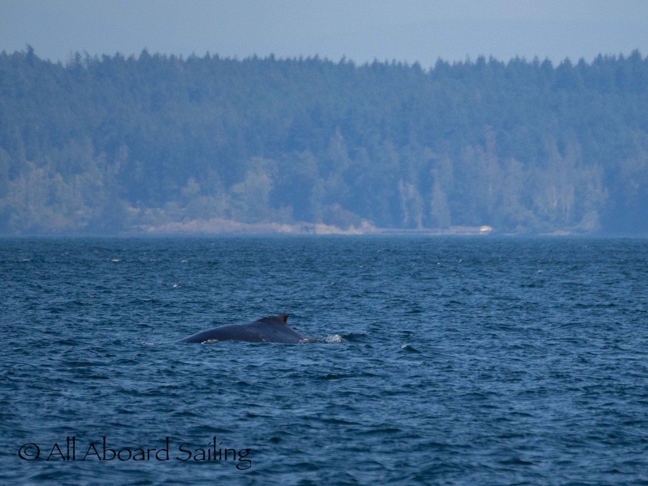 Sept 11, 2025 – With news of the Biggs/Transient orca brothers T60D (born 2004) and T60E (born 2008) northbound in Haro Strait we headed north. Along the San Juan Island shoreline near Pt Caution we saw a great blue heron in a tree. The sea mist was lifting to the north with ribbons of fog on the coastline to the south. We crossed to the Wasp Islands and to Jones Island catching the ebb out to Spieden Channel. The orcas approached from Davidson Head and crossed to Spieden Island and Green Pt against the strong ebb. They circled the Cactus Island and explored the kelp forest before continuing west. We left them and met a humpback whale, BCY1463 “Malachite” (2021 calf of BCX1210 “Slate”) who had come down President Channel and was headed north. Coming back via Flattop Island and picked up strong winds for a close-hauled sail to Mineral Pt. Kept to the San Juan Island shoreline headed south to return to Friday Harbor.