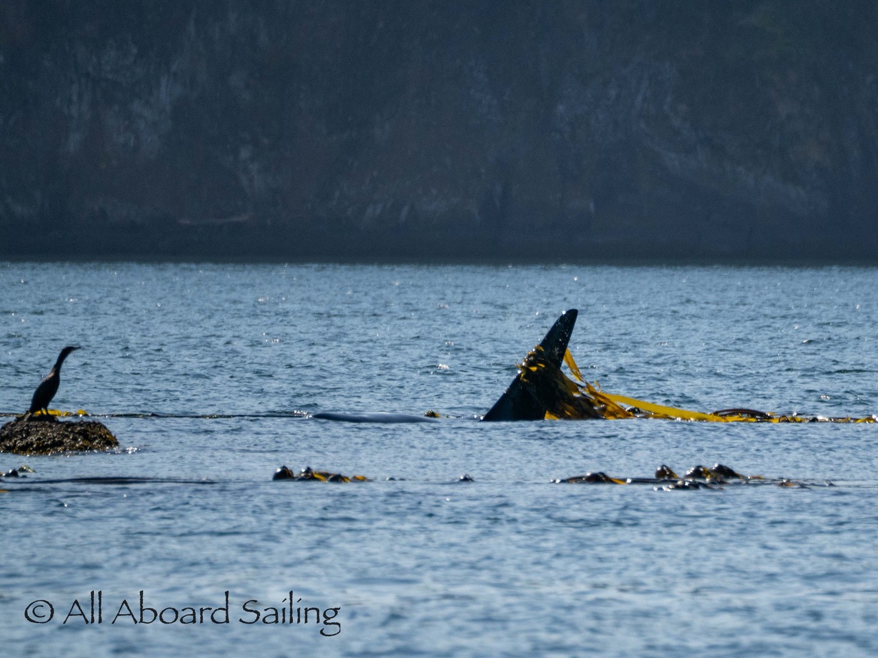 Biggs/Transient orca T60D draped in bull kelp while watched by a cormorant
