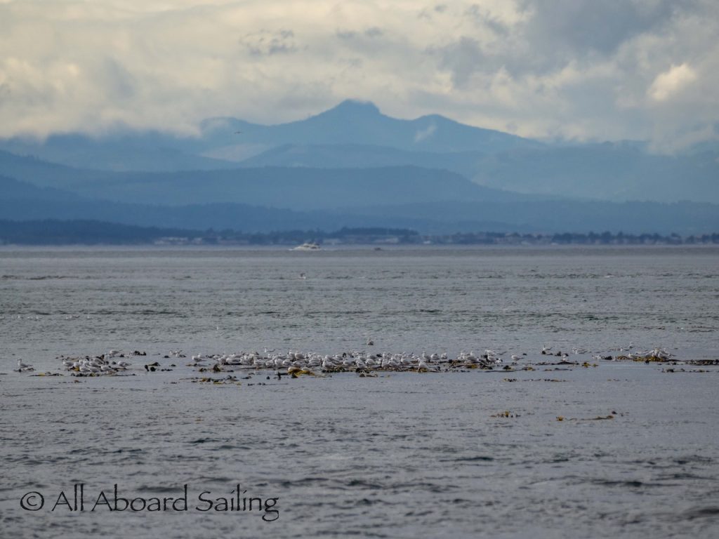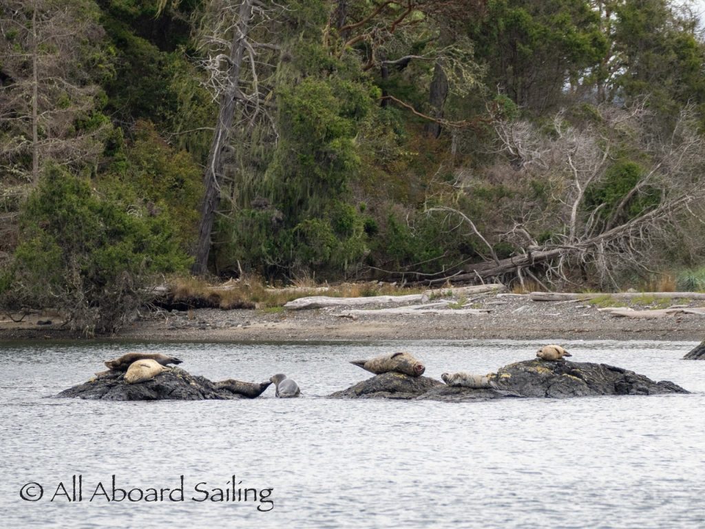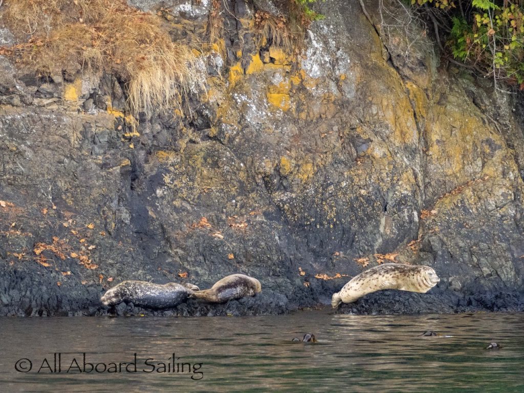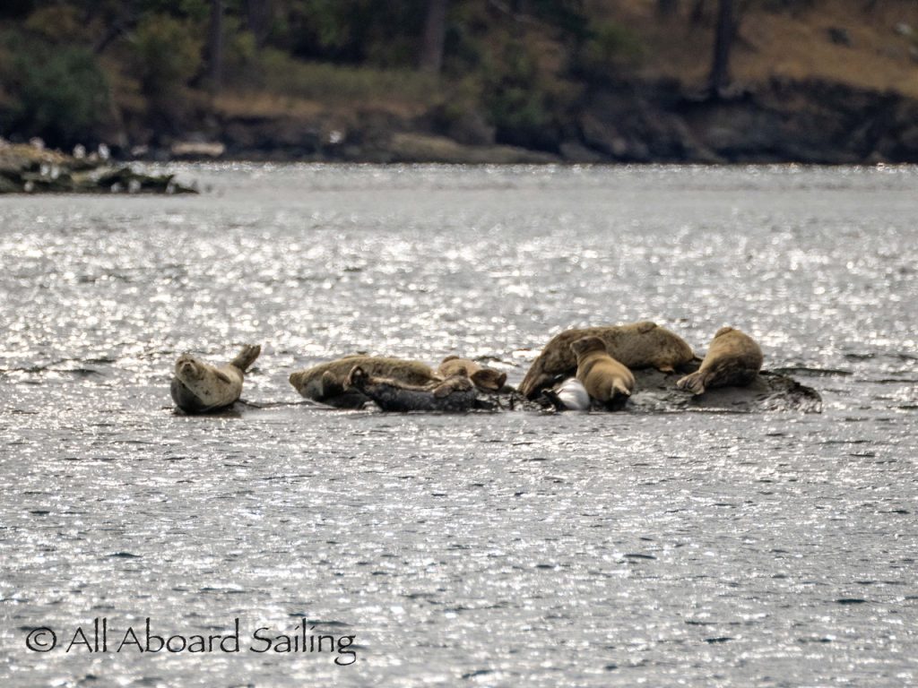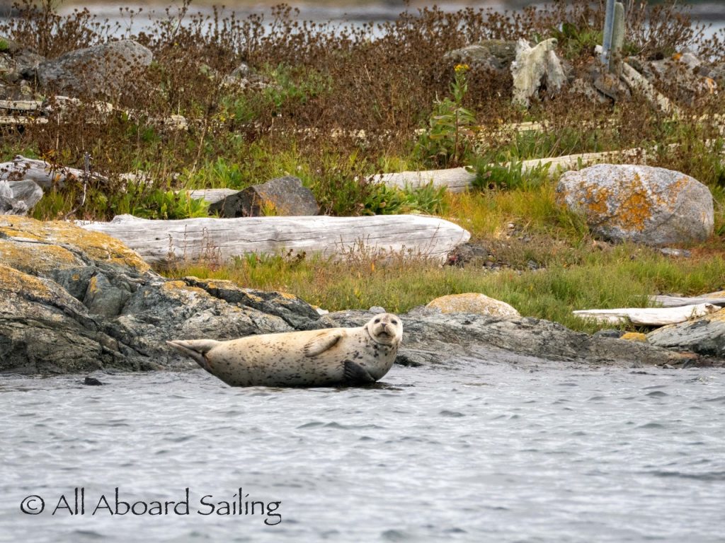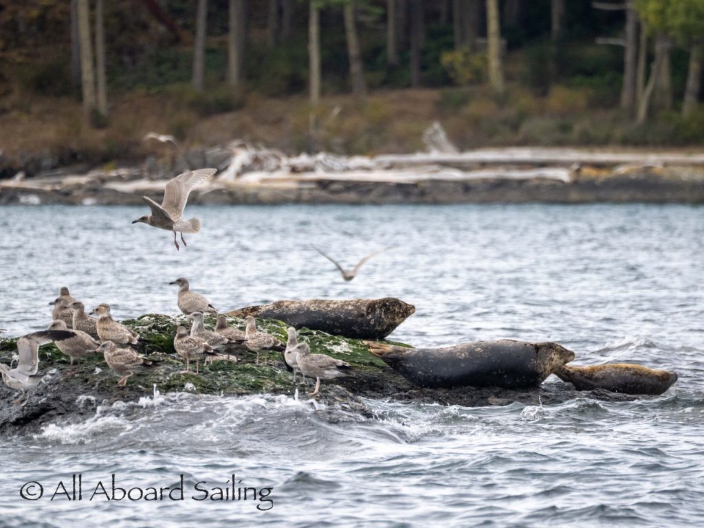 Sept 14, 2025 – Moderate winds for sailing on what felt like an autumn day. Clouds came and went with occasional sprinkles. We were temped to go south but being against the current and the wind we sailed north. Hugged the Shaw Island coastline before cutting through the Wasp Islands. Had a great sail up to Spieden Island and enjoyed drifting through New Channel. Harbor seals were resting, Steller sea lions patrolled the shoreline foraging, Bonaparte’s gulls stood on the bull kelp forest, belted kingfishers called out. Next we cut through the pass by Ripple Island and scanned into Boundary Pass before coming about to sail to Flattop Island. Had a great sail down to Jones Island and enjoyed cups of tea with lighter winds before returning to Friday Harbor. Other wildlife sightings included great blue herons, harlequin ducks, and cormorants. A fabulous full day sailing