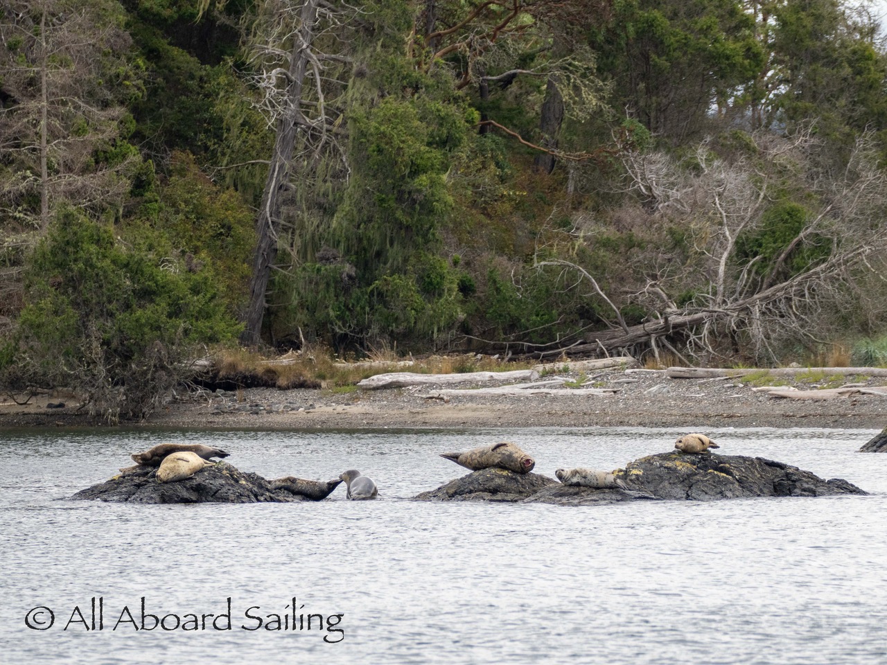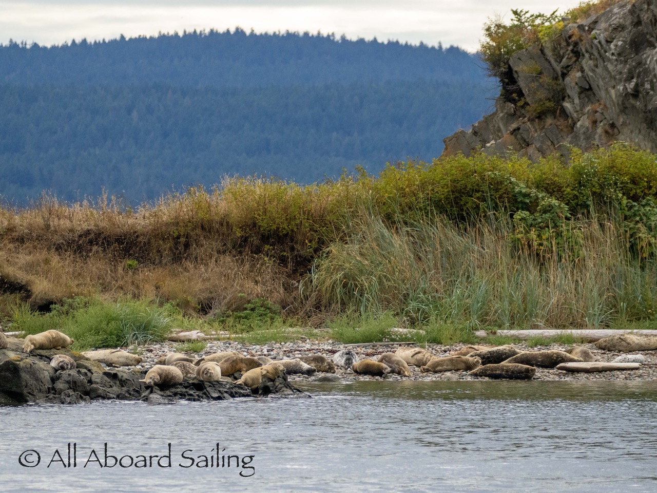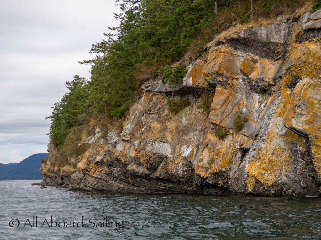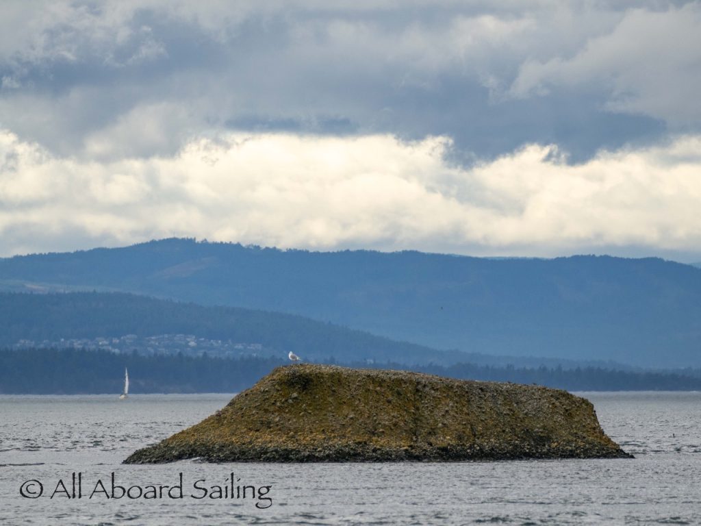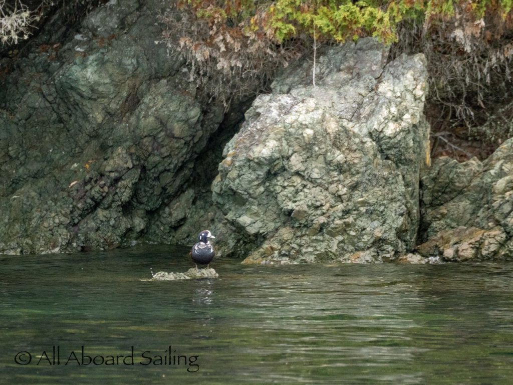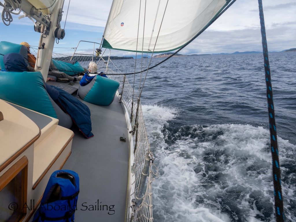 Sept 14, 2025 – Moderate winds for sailing on what felt like an autumn day. Clouds came and went with occasional sprinkles. We were temped to go south but being against the current and the wind we sailed north. Hugged the Shaw Island coastline before cutting through the Wasp Islands. Had a great sail up to Spieden Island and enjoyed drifting through New Channel. Harbor seals were resting, Steller sea lions patrolled the shoreline foraging, Bonaparte’s gulls stood on the bull kelp forest, belted kingfishers called out. Next we cut through the pass by Ripple Island and scanned into Boundary Pass before coming about to sail to Flattop Island. Had a great sail down to Jones Island and enjoyed cups of tea with lighter winds before returning to Friday Harbor. Other wildlife sightings included great blue herons, harlequin ducks, and cormorants. A fabulous full day sailing
