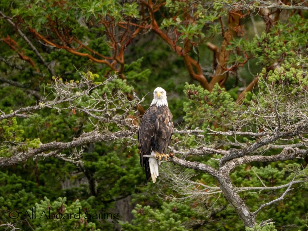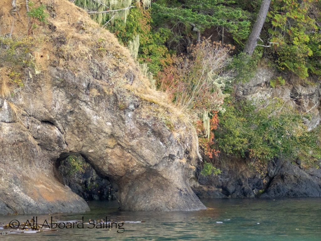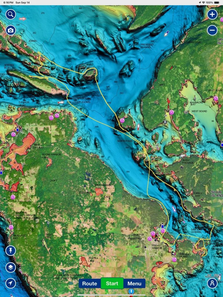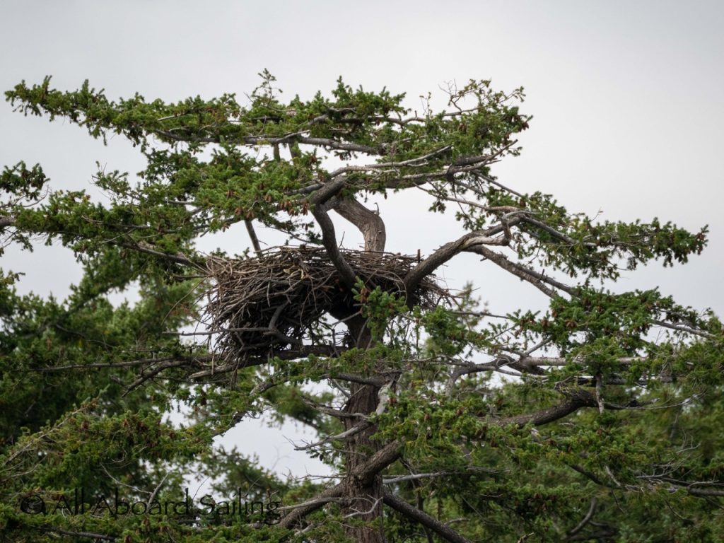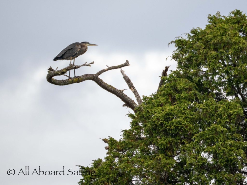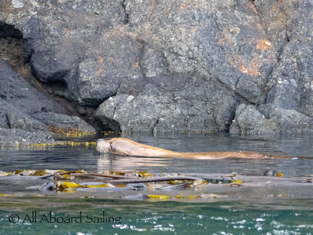 Sept 14, 2025 – Moderate winds for sailing on what felt like an autumn day. Clouds came and went with occasional sprinkles. We were temped to go south but being against the current and the wind we sailed north. Hugged the Shaw Island coastline before cutting through the Wasp Islands. Had a great sail up to Spieden Island and enjoyed drifting through New Channel. Harbor seals were resting, Steller sea lions patrolled the shoreline foraging, Bonaparte’s gulls stood on the bull kelp forest, belted kingfishers called out. Next we cut through the pass by Ripple Island and scanned into Boundary Pass before coming about to sail to Flattop Island. Had a great sail down to Jones Island and enjoyed cups of tea with lighter winds before returning to Friday Harbor. Other wildlife sightings included great blue herons, harlequin ducks, and cormorants. A fabulous full day sailing