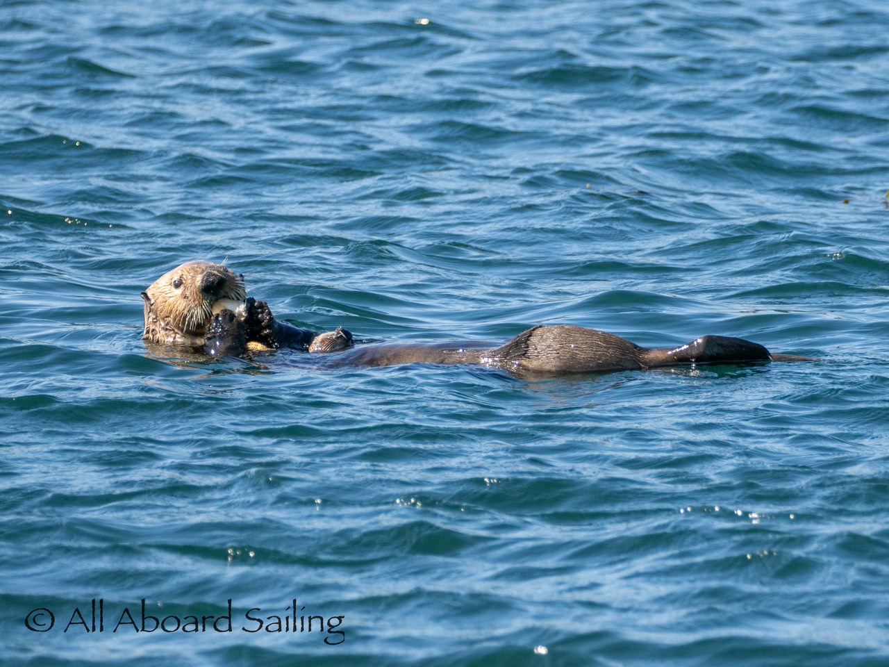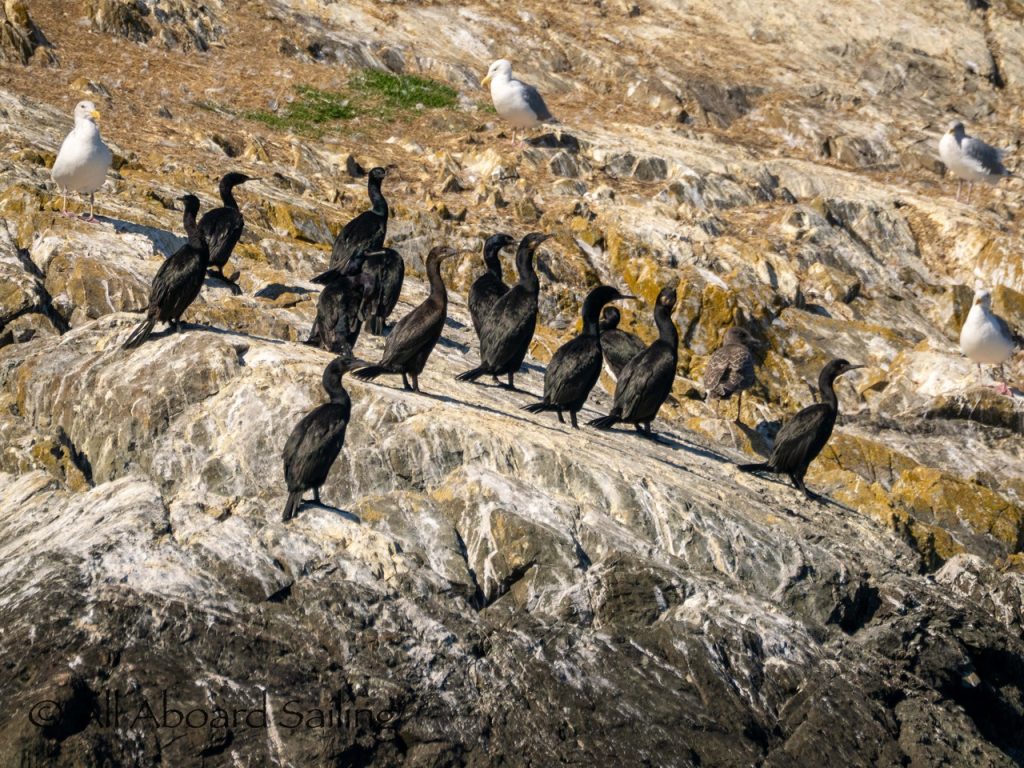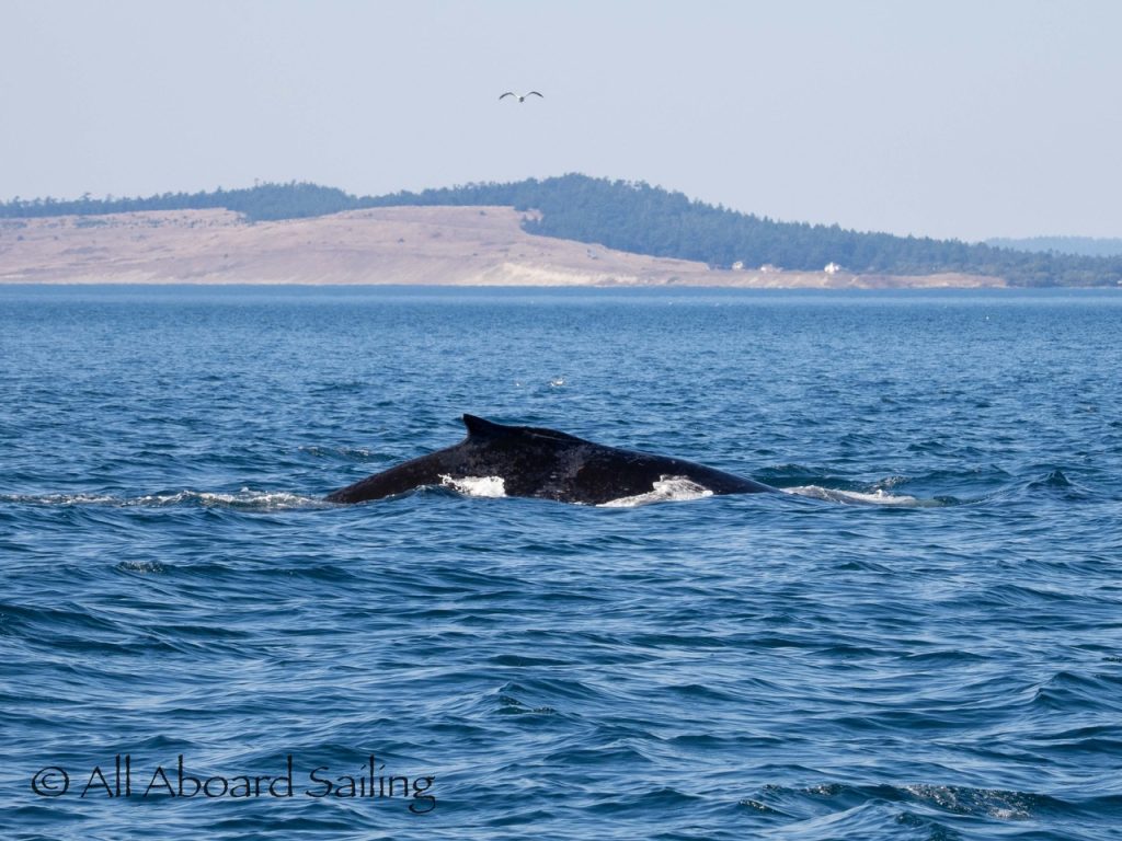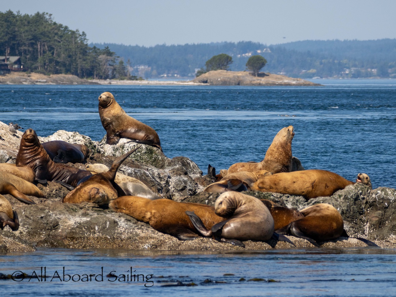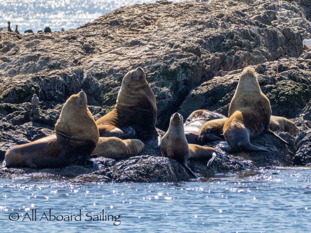 Sept 16, 2025 – A great trip sailing south today. We found the sea otter by Danger Rock eating clams. Viewed the cormorant rookery at Goose Island before checking out the rowdy Steller sea lion colony at Whale Rocks. A bald eagle with lunch in its talons and a large group of black oystercatchers were hanging out on Long Island. Great blue herons were fishing on bull kelp forests. On MacArthur Bank we had amazing views of humpback whale BCZ0345 “Victory” as she was lunge feeding on bait fish. We also saw a minke whale, too. Harbor seals were resting by Deadman Island as we came up through Cattle Pass. A really fun full day sail.