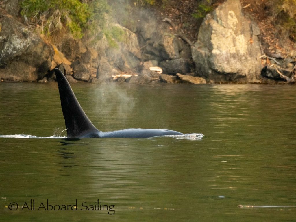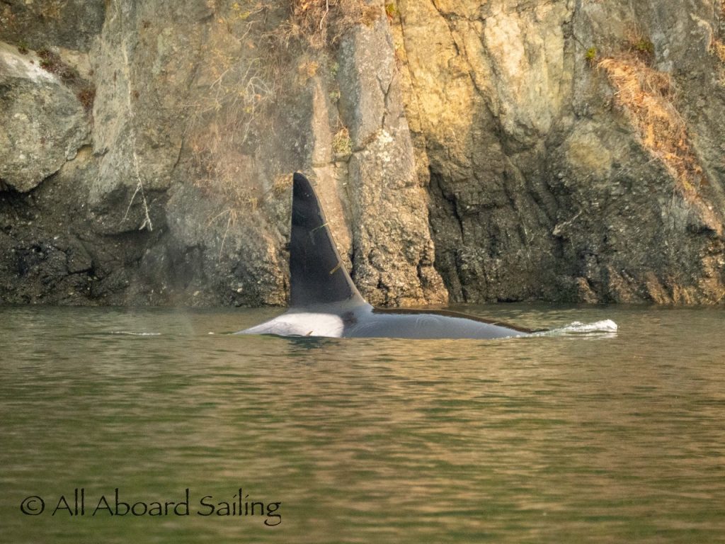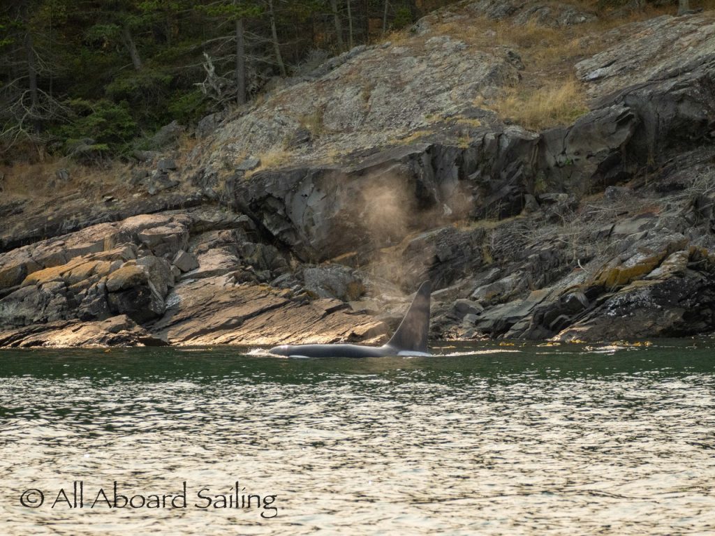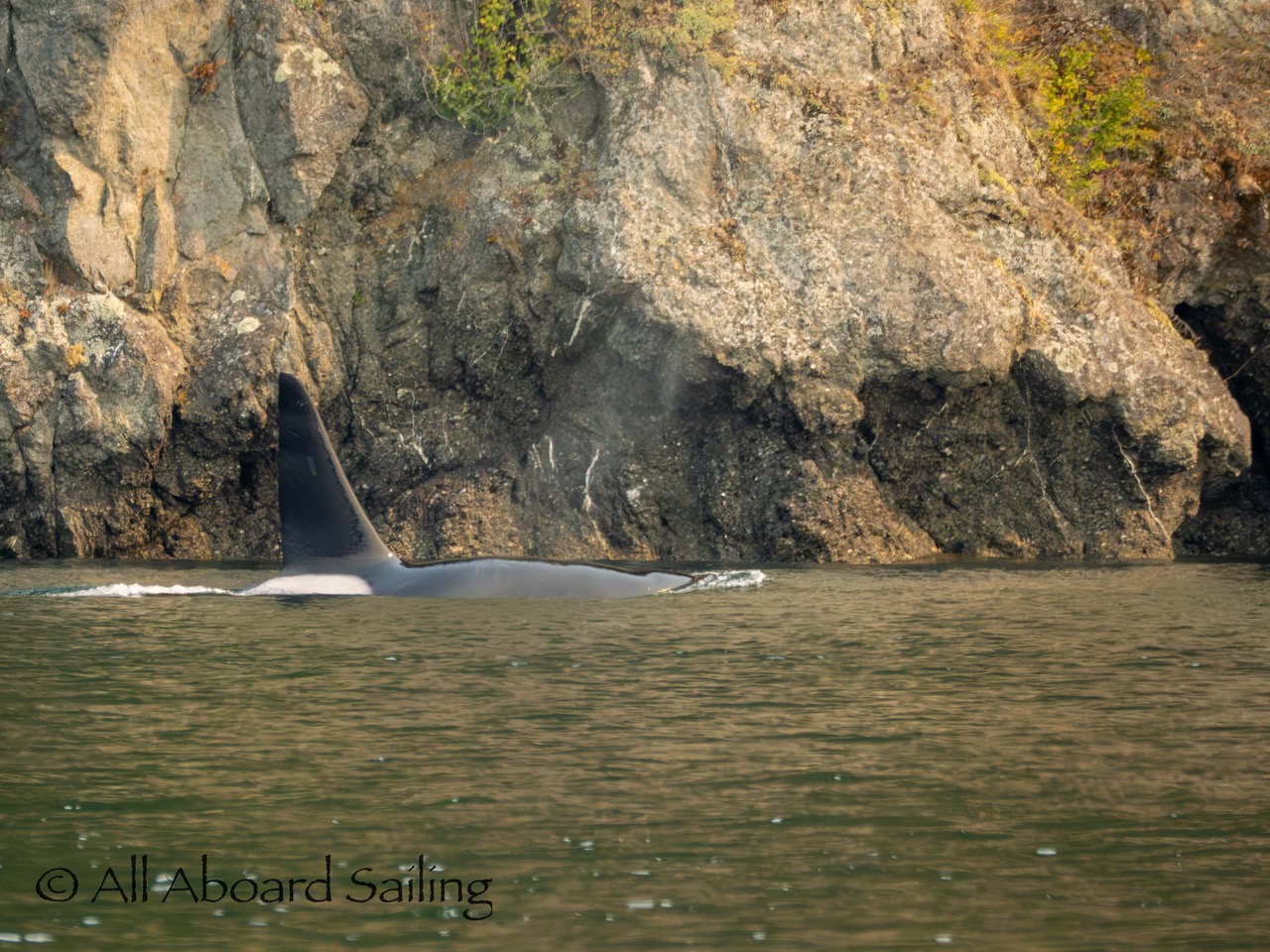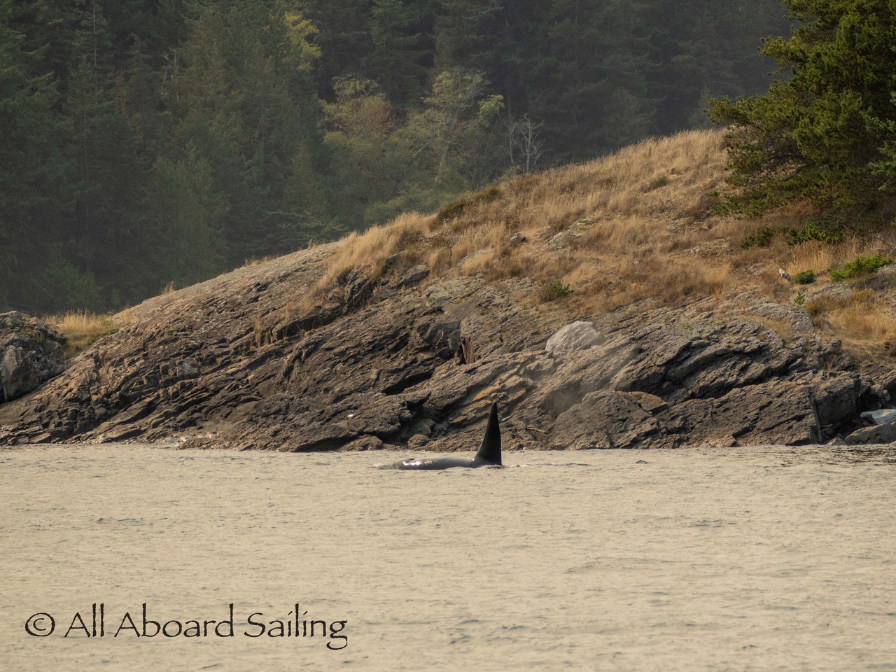 Sept 17, 2025 – Today’s adventure began with fantastic views of an adorable sea otter resting in a kelp bed by Turn Rock. This little animal couldn’t be any cuter if he/she tried! After hearing a report of a lone male orca southbound on the east side of Orcas Island we picked a route inter-island with hopes to meet him. After hugging the coastline near Upright Head, Lopez Island, we crossed towards Peavine Pass. The male orca had been identified as T49A1 (born 2001) and he was southbound after milling near Pea Pod Rocks for awhile. Soon after we got on scene and had some great views as we sailed alongside. He decided to take the pass by Obstruction Island and travel inter-island back in the direction where we just came from conveniently taking us back towards Friday Harbor. At the bottom of Upright Channel he decided to go south and we decided to go north and cruse the coastline by Shaw Island spotting bald eagles, harbor seals, a great blue heron, common murres, and turkey vultures before crossing the channel back to the harbor.
