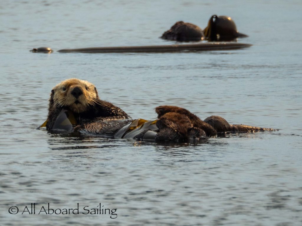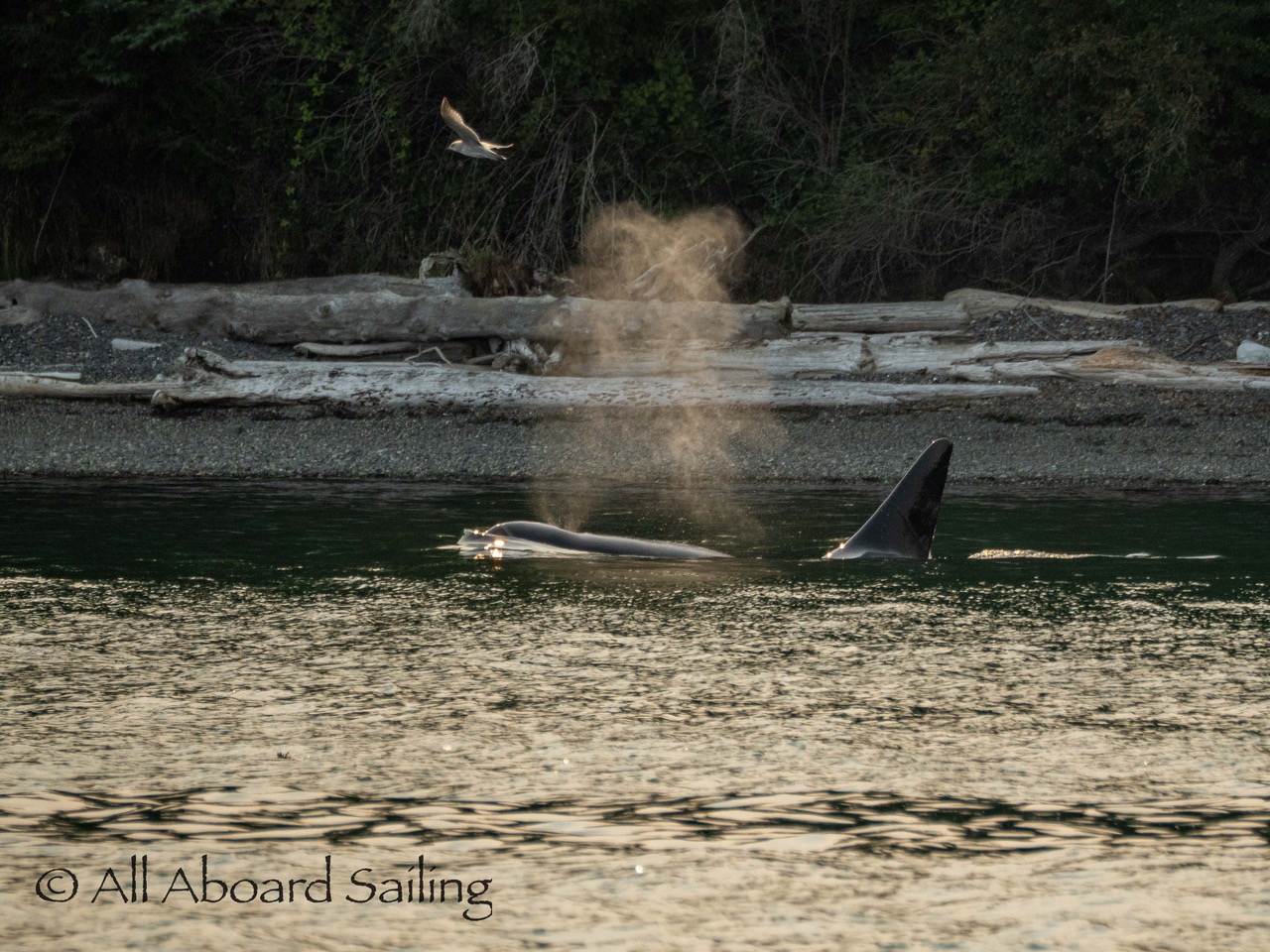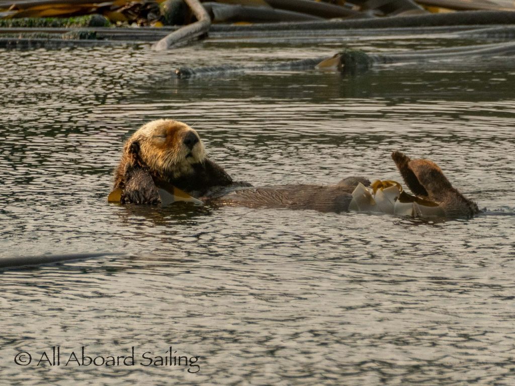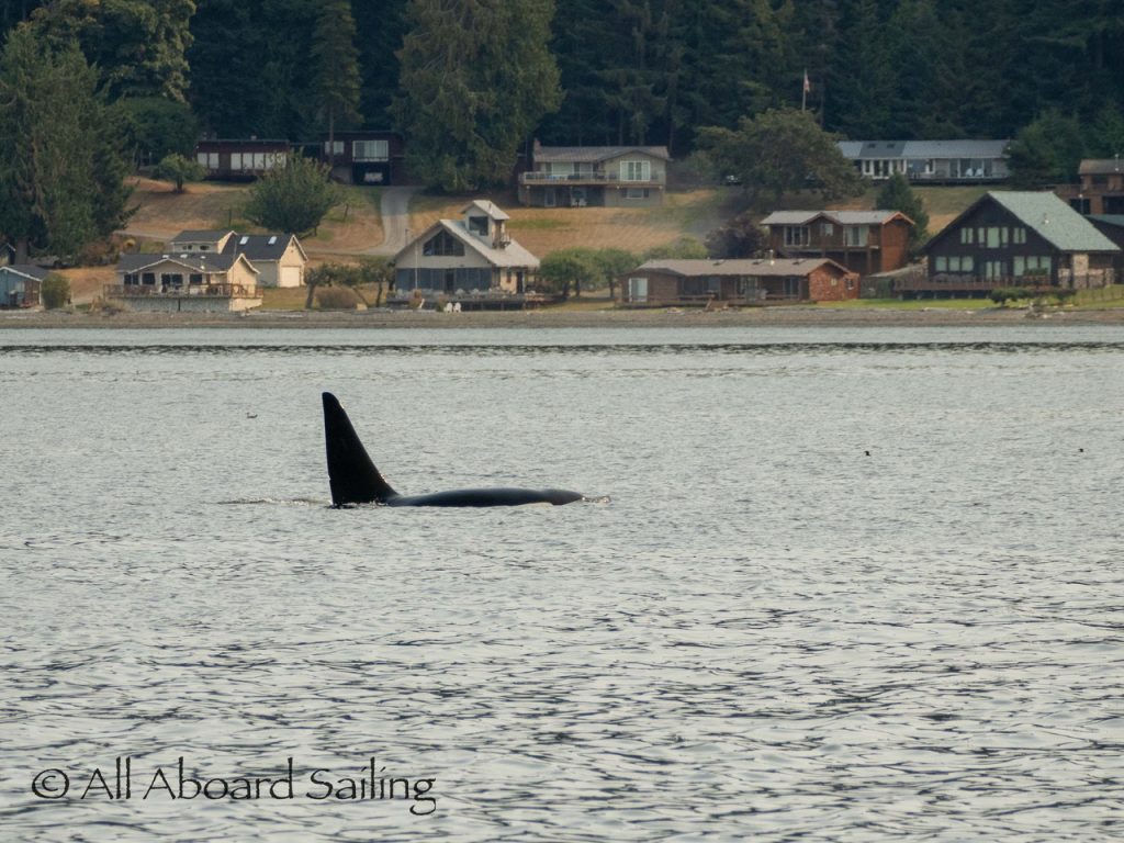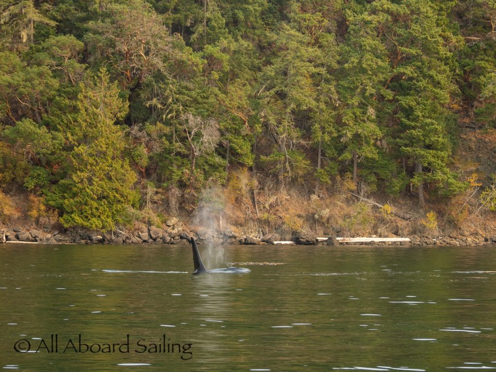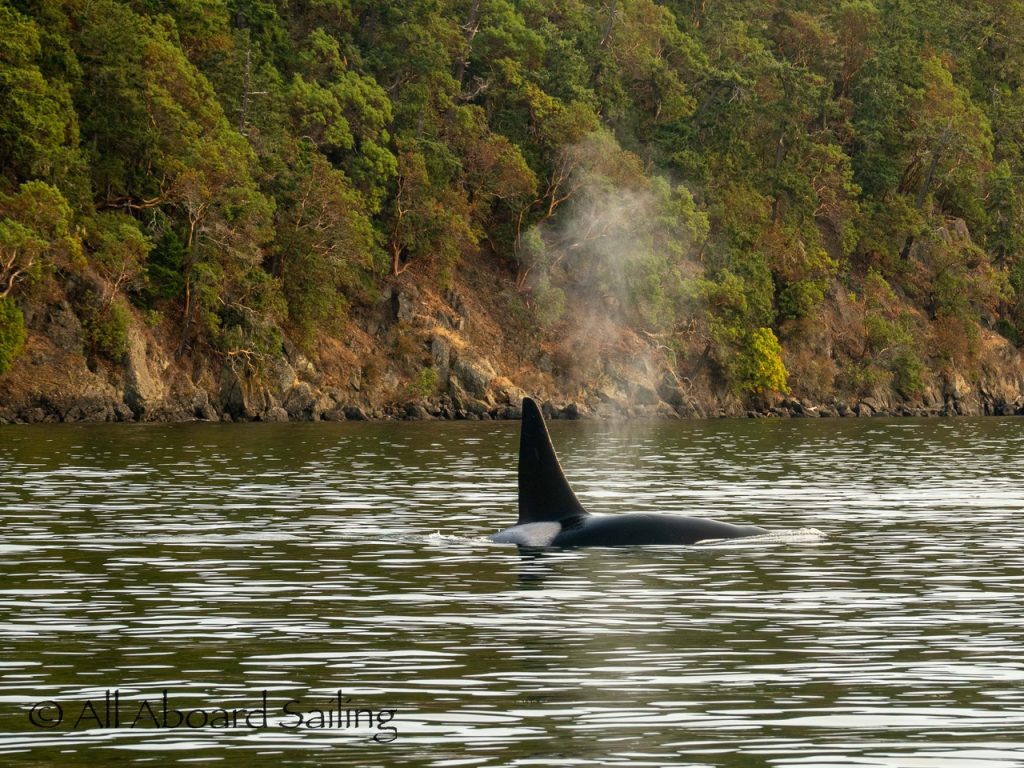 Sept 17, 2025 – Today’s adventure began with fantastic views of an adorable sea otter resting in a kelp bed by Turn Rock. This little animal couldn’t be any cuter if he/she tried! After hearing a report of a lone male orca southbound on the east side of Orcas Island we picked a route inter-island with hopes to meet him. After hugging the coastline near Upright Head, Lopez Island, we crossed towards Peavine Pass. The male orca had been identified as T49A1 (born 2001) and he was southbound after milling near Pea Pod Rocks for awhile. Soon after we got on scene and had some great views as we sailed alongside. He decided to take the pass by Obstruction Island and travel inter-island back in the direction where we just came from conveniently taking us back towards Friday Harbor. At the bottom of Upright Channel he decided to go south and we decided to go north and cruse the coastline by Shaw Island spotting bald eagles, harbor seals, a great blue heron, common murres, and turkey vultures before crossing the channel back to the harbor.