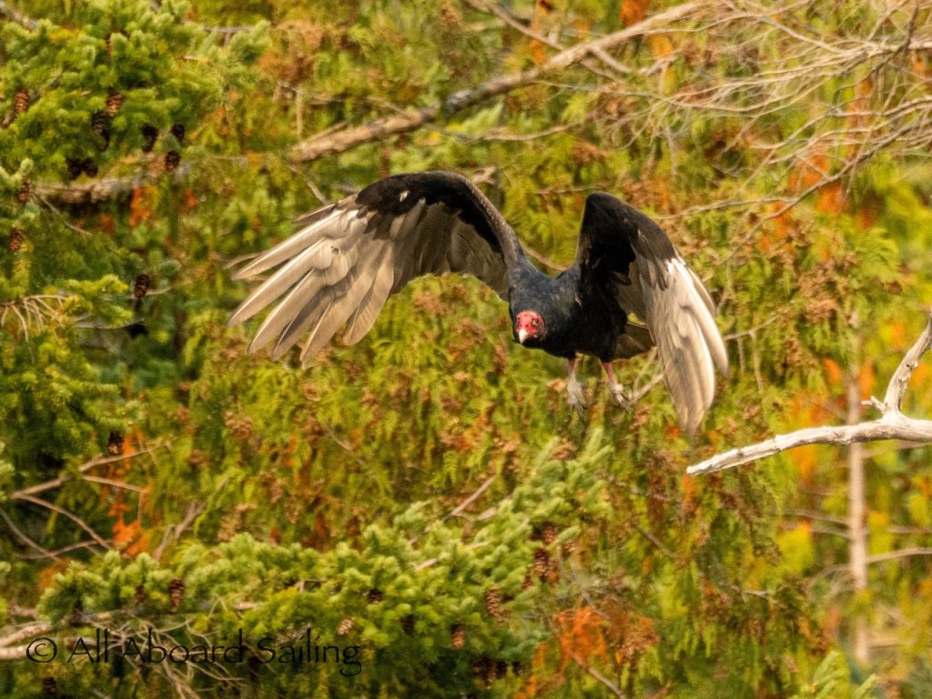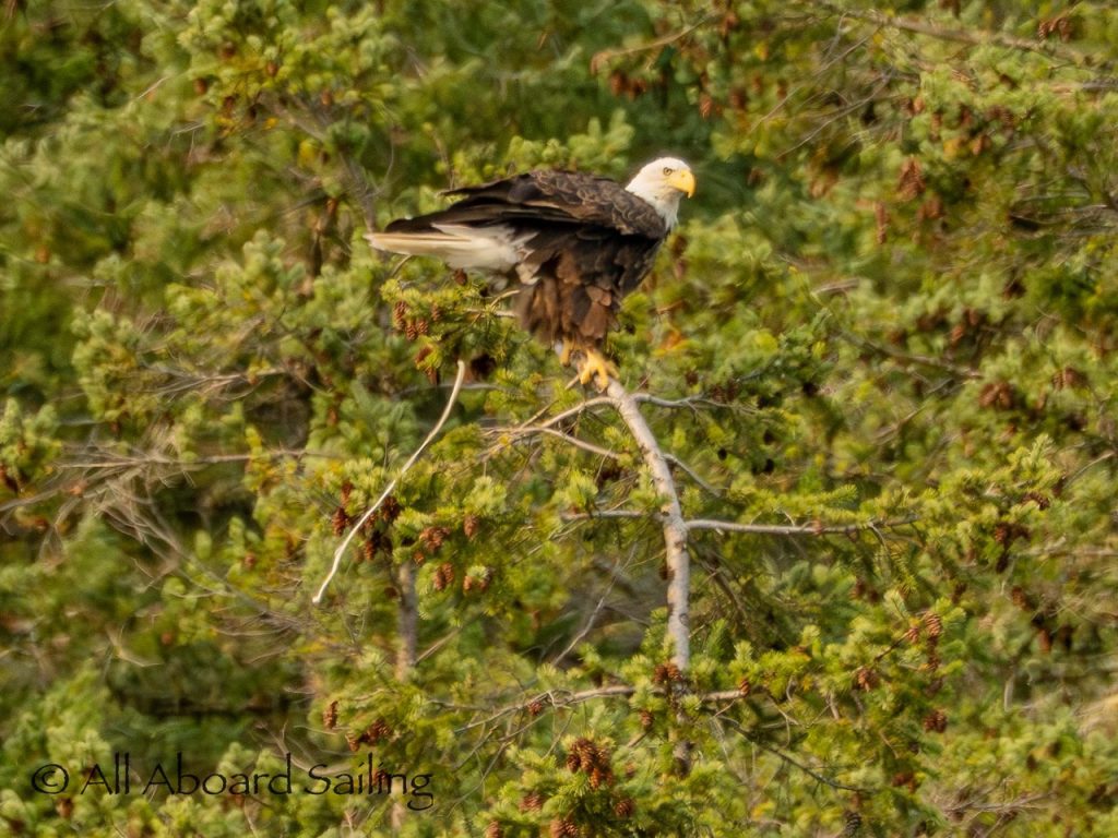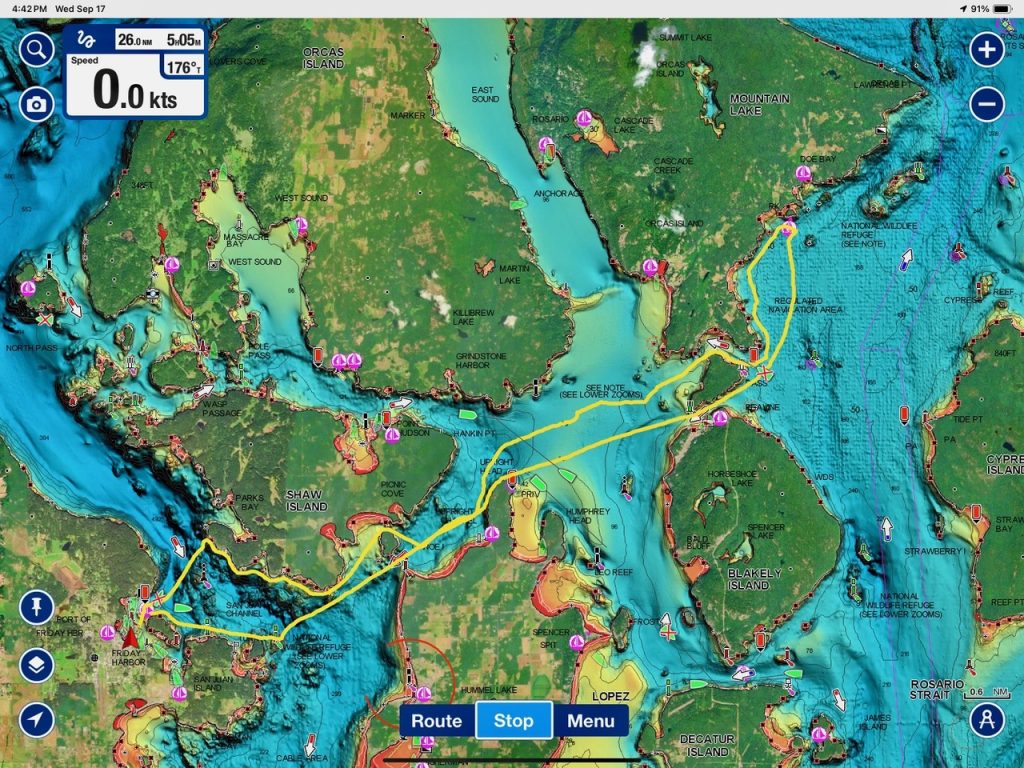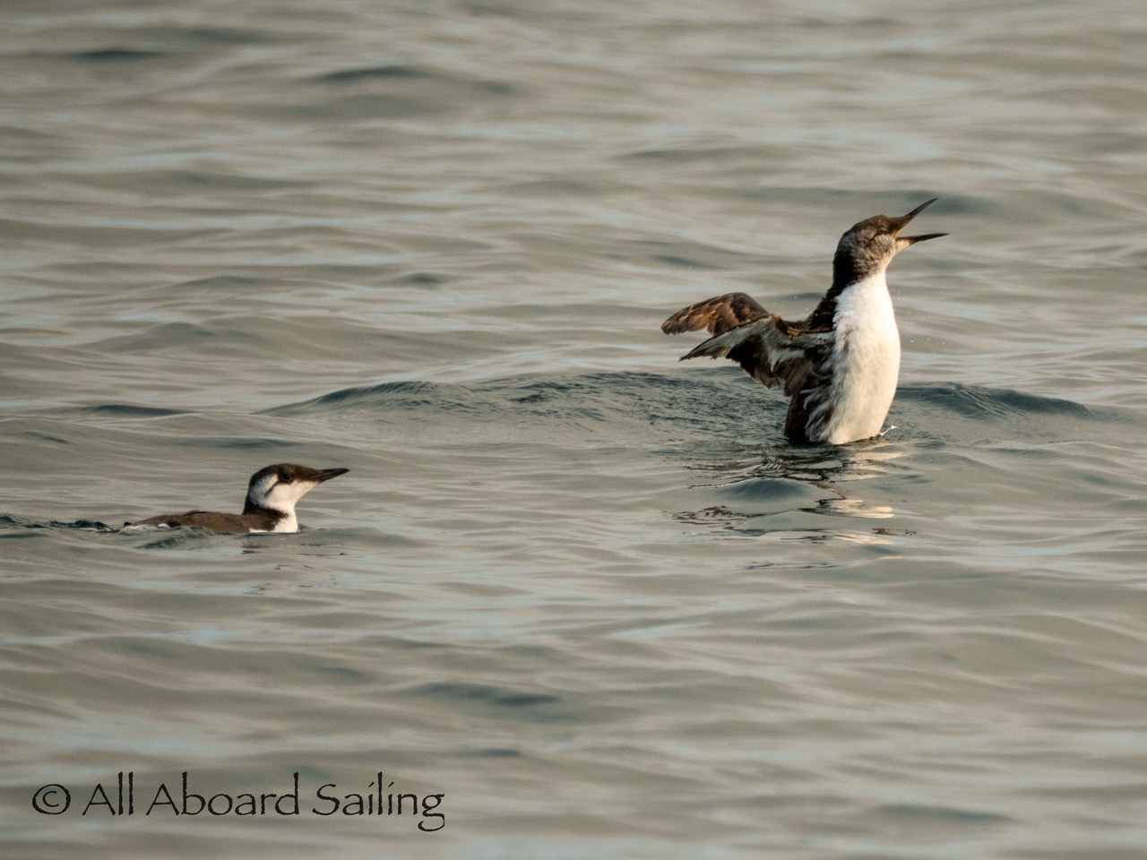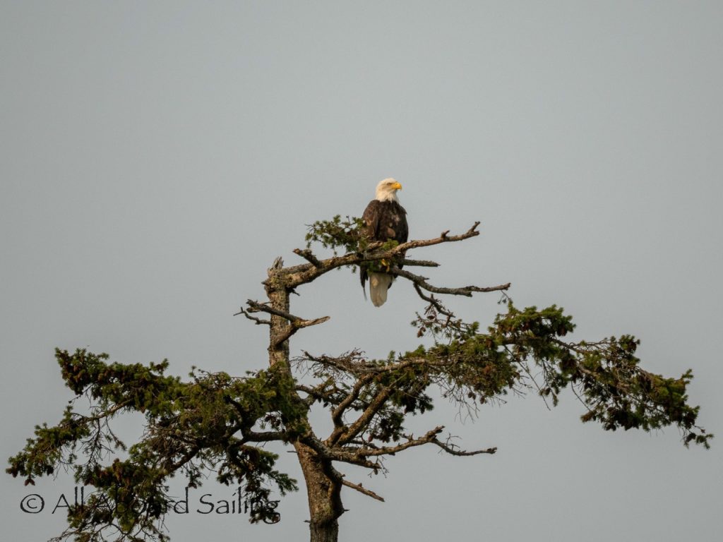 Sept 17, 2025 – Today’s adventure began with fantastic views of an adorable sea otter resting in a kelp bed by Turn Rock. This little animal couldn’t be any cuter if he/she tried! After hearing a report of a lone male orca southbound on the east side of Orcas Island we picked a route inter-island with hopes to meet him. After hugging the coastline near Upright Head, Lopez Island, we crossed towards Peavine Pass. The male orca had been identified as T49A1 (born 2001) and he was southbound after milling near Pea Pod Rocks for awhile. Soon after we got on scene and had some great views as we sailed alongside. He decided to take the pass by Obstruction Island and travel inter-island back in the direction where we just came from conveniently taking us back towards Friday Harbor. At the bottom of Upright Channel he decided to go south and we decided to go north and cruse the coastline by Shaw Island spotting bald eagles, harbor seals, a great blue heron, common murres, and turkey vultures before crossing the channel back to the harbor.