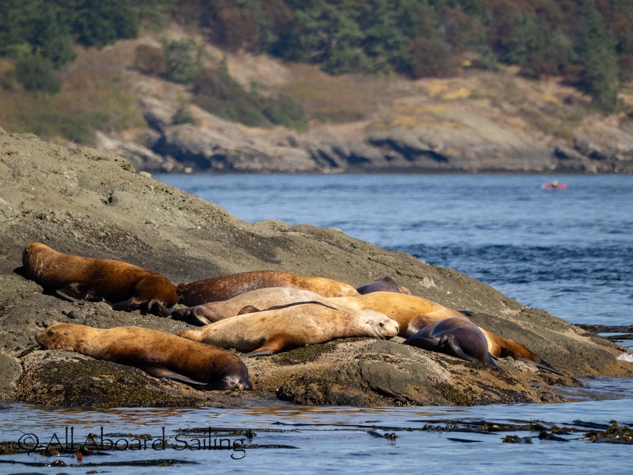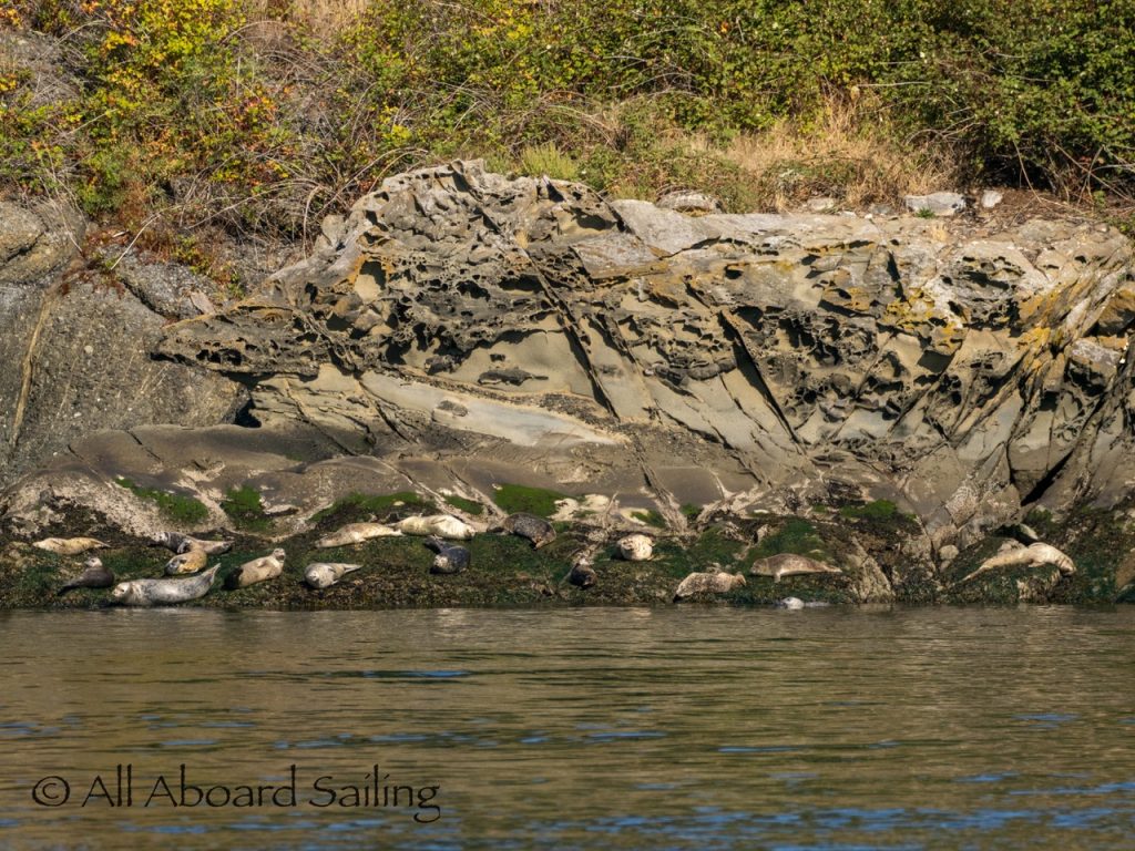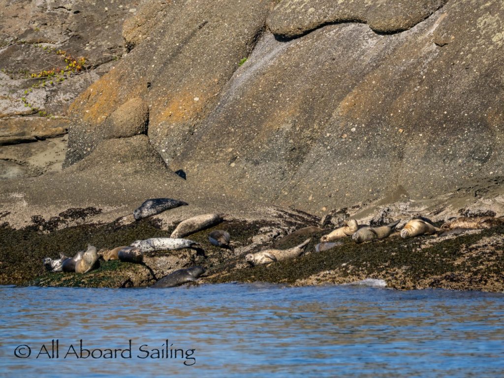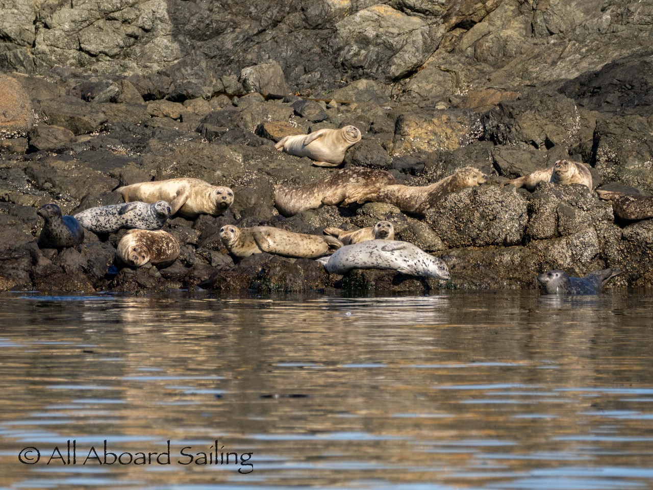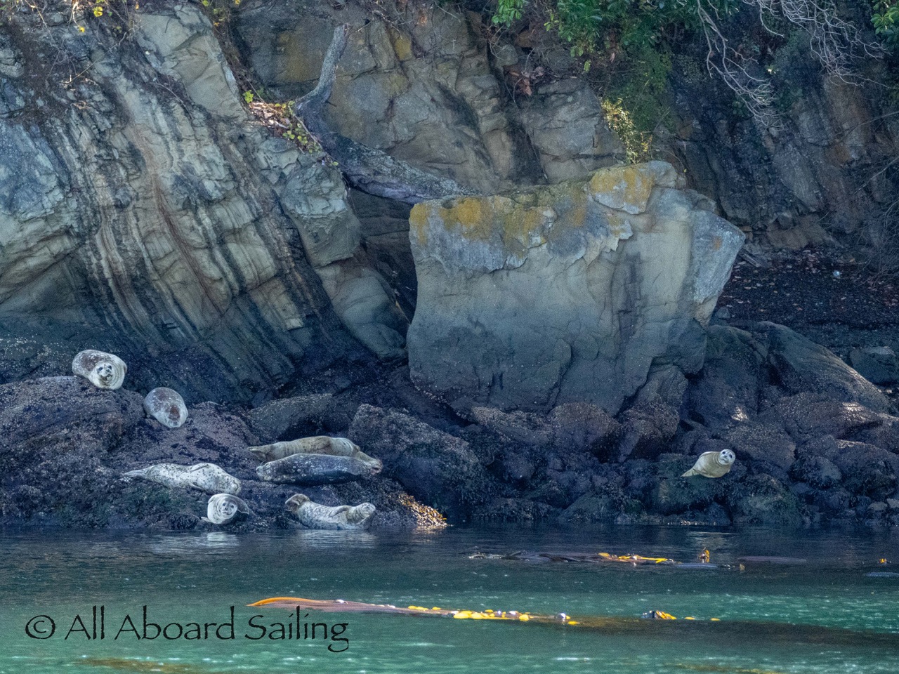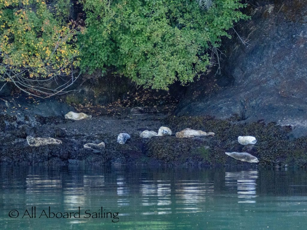 Sept 21, 2025 – Half day sail north. Harbor seals, harbor porpoise, bald eagles, great blue herons, a hawk, Mouflon sheep, fallow deer, Steller sea lions. Mirror calm waters in New Channel. Harbor porpoise exhales. Bald eagle and Peregrine falcon calls. Birthday cake. A gorgeous day.