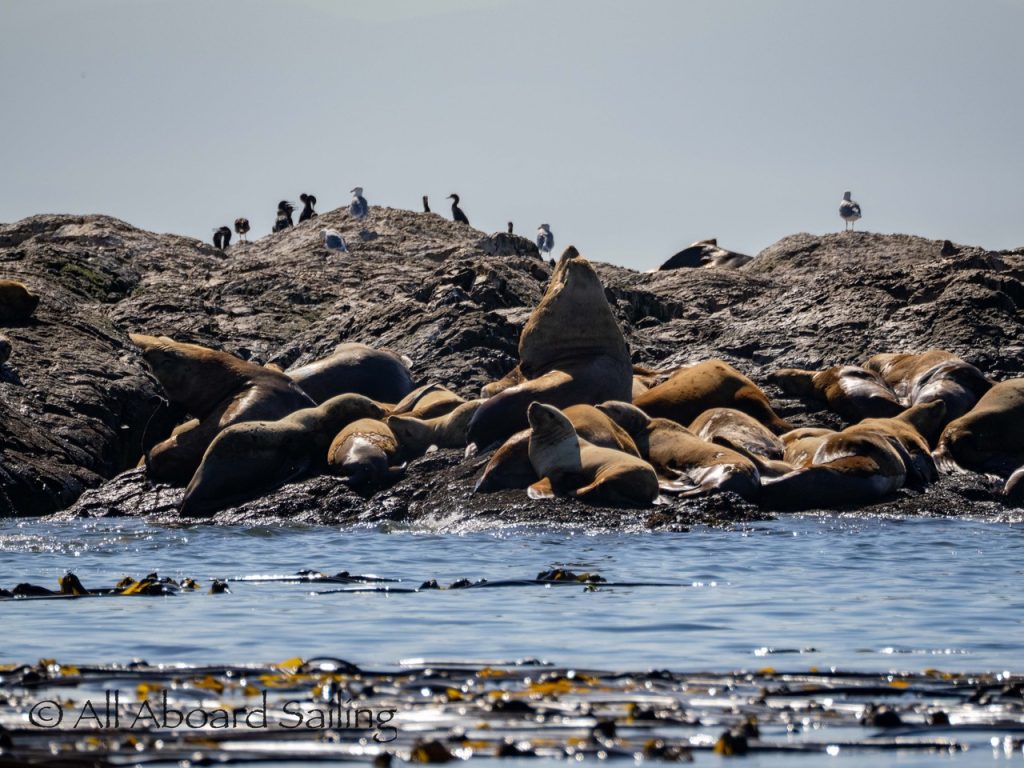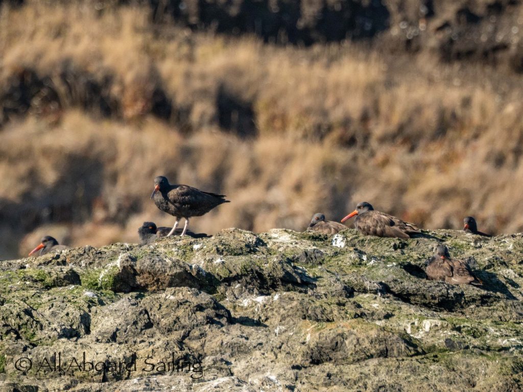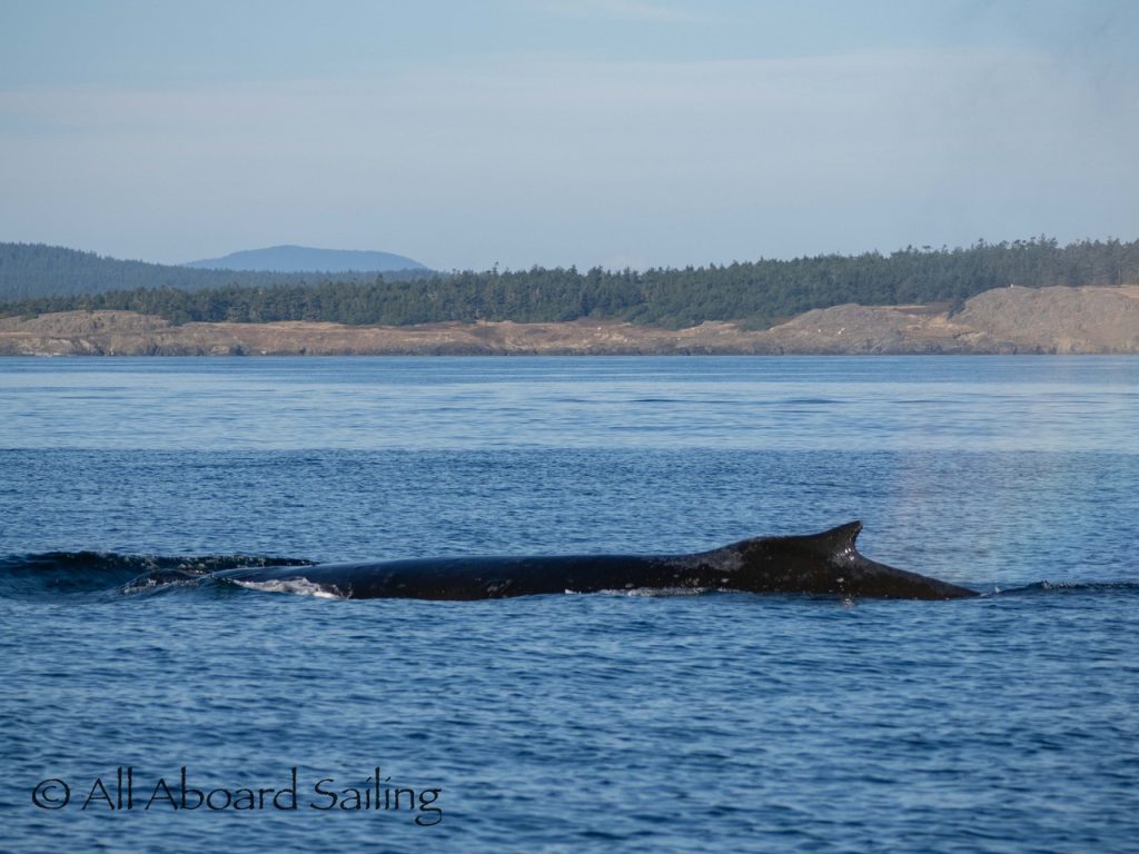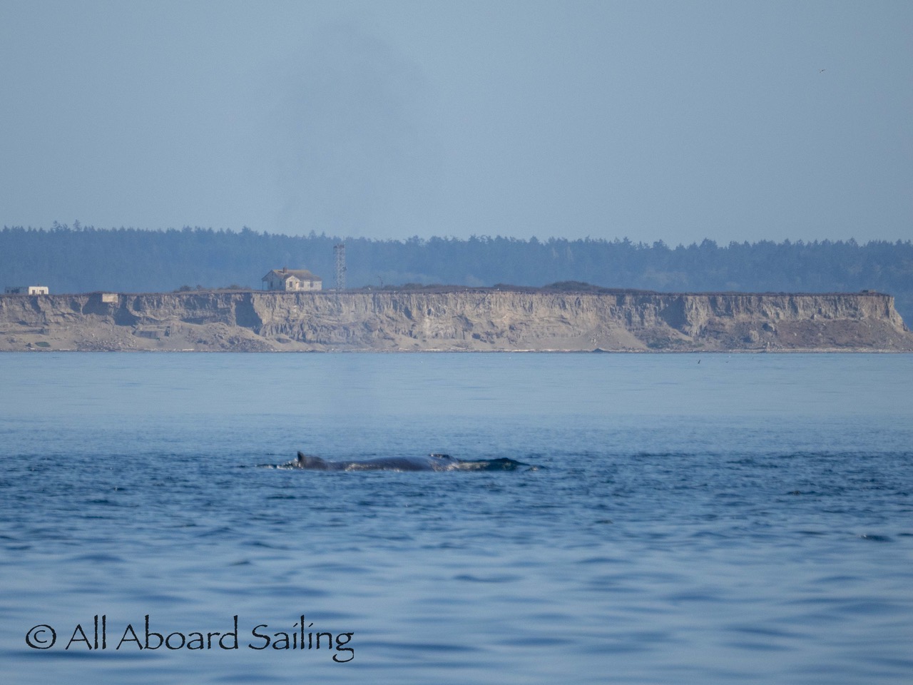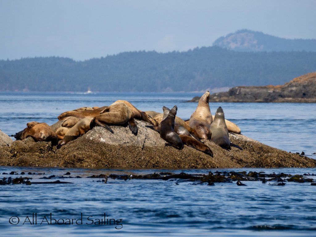 Sept 22, 2025 – We sailed south today and with a decent breeze and an ebb current were able to tack our way down to Cattle Pass for some nice sailing. After viewing the harbor seals and a bald eagle at Deadman Island we came out to Whale Rocks to view the Steller sea lions. The sea lions were quite playful and we noted a tiny pup in with the large animals. Coming out to Salmon Bank we had some views of a minke whale (aka “Dent”) near the southern tip of the bank. We moved south to MacArthur Bank seeing a humpback whale, BCZ0345 “Victory” who was heading north looking for bait balls as the current passed maximum flood. We continued north coming in the east side of Long Island seeing many black oystercatchers both adults and this year’s chicks. Came in quickly on the flood current stopping to see the sea otter at Turn Rock with quite a number of Bonaparte’s gulls.