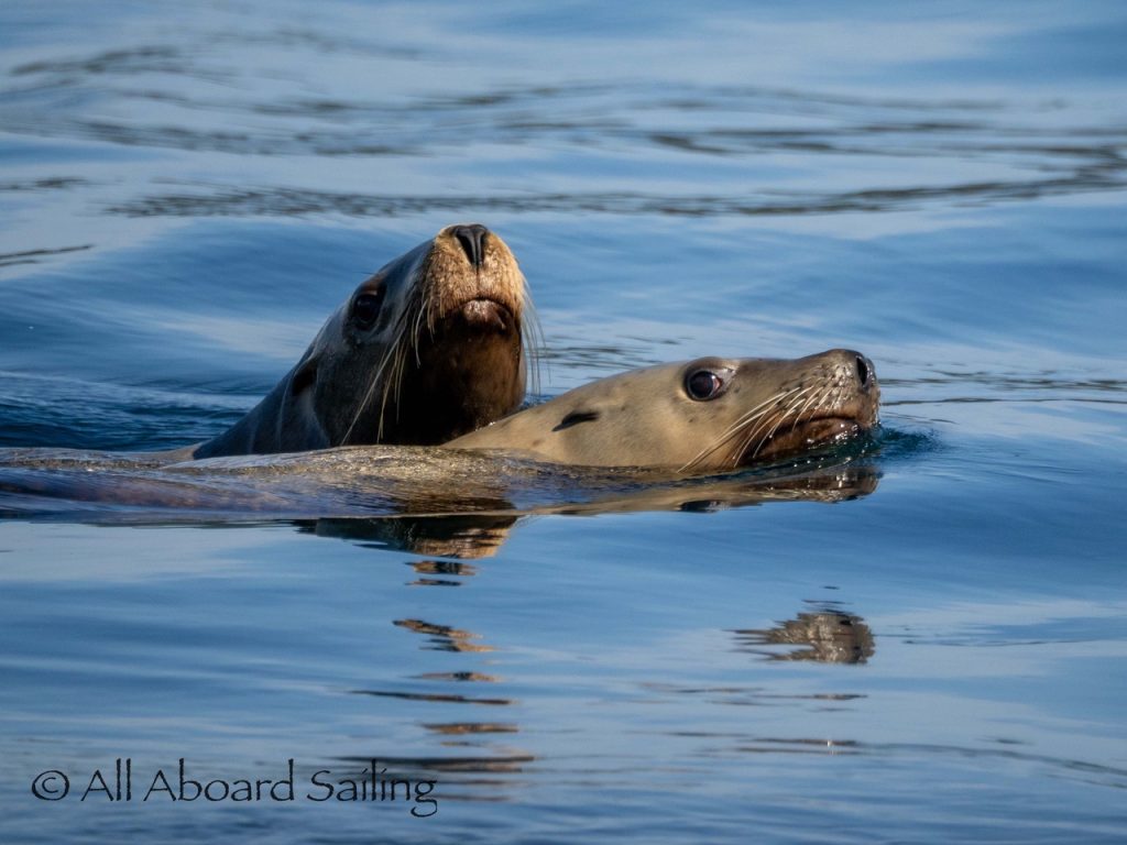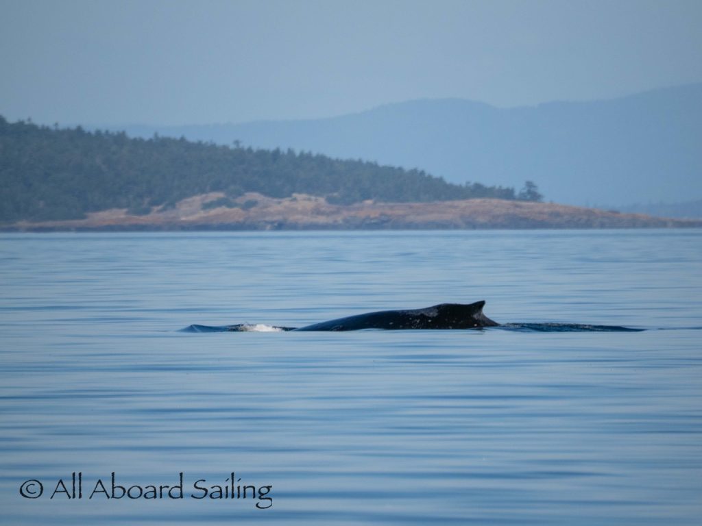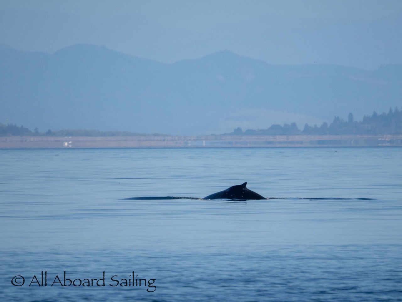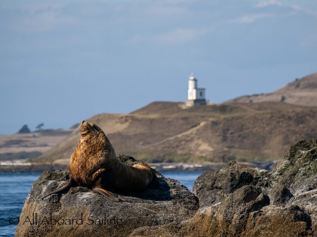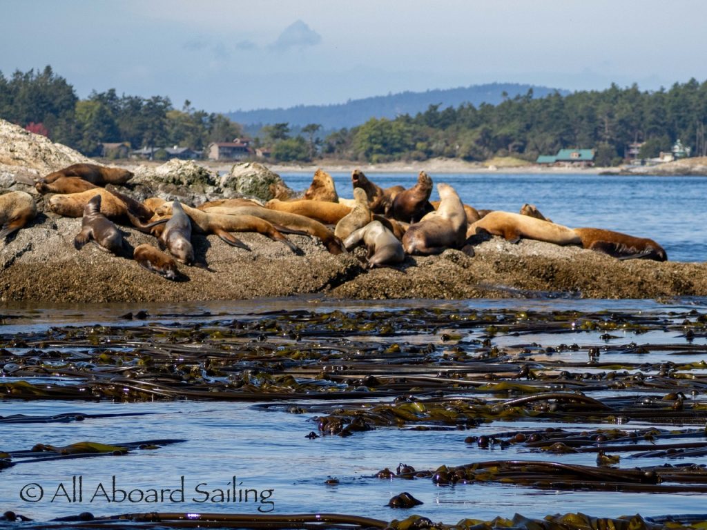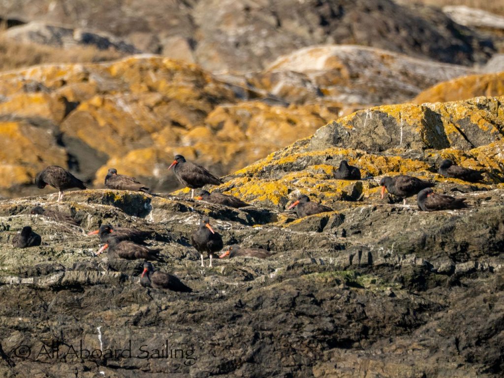 Sept 22, 2025 – We sailed south today and with a decent breeze and an ebb current were able to tack our way down to Cattle Pass for some nice sailing. After viewing the harbor seals and a bald eagle at Deadman Island we came out to Whale Rocks to view the Steller sea lions. The sea lions were quite playful and we noted a tiny pup in with the large animals. Coming out to Salmon Bank we had some views of a minke whale (aka “Dent”) near the southern tip of the bank. We moved south to MacArthur Bank seeing a humpback whale, BCZ0345 “Victory” who was heading north looking for bait balls as the current passed maximum flood. We continued north coming in the east side of Long Island seeing many black oystercatchers both adults and this year’s chicks. Came in quickly on the flood current stopping to see the sea otter at Turn Rock with quite a number of Bonaparte’s gulls.