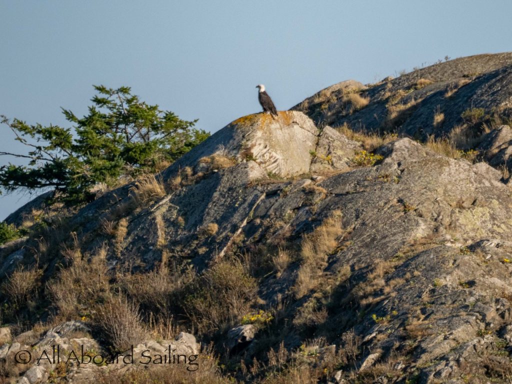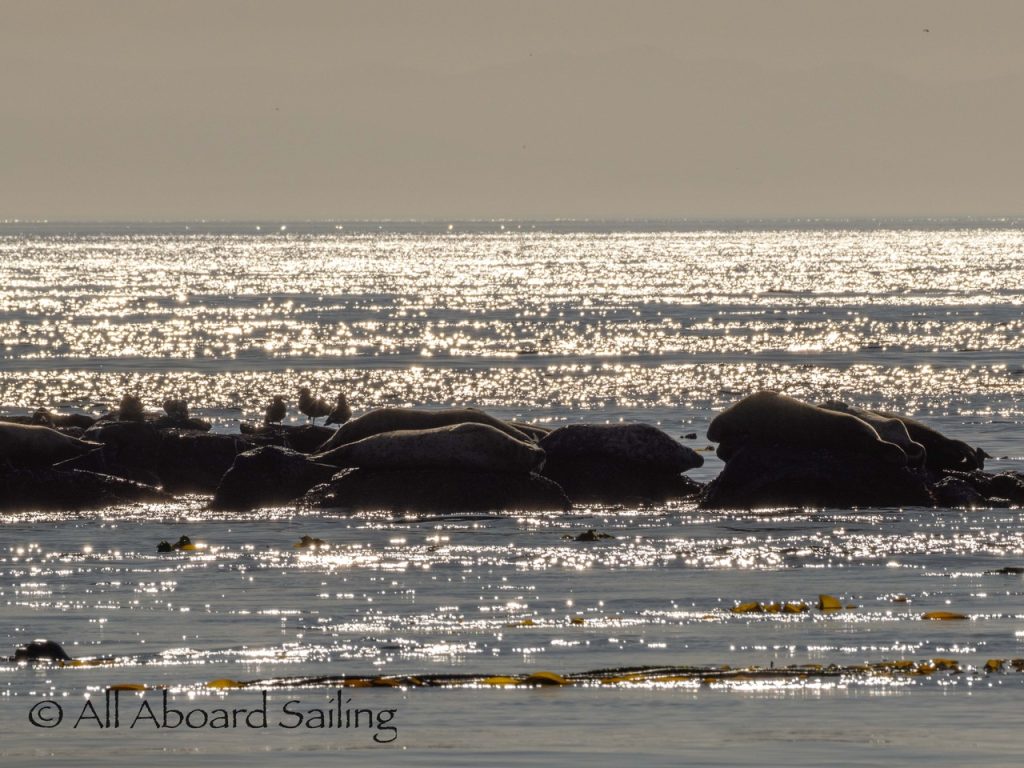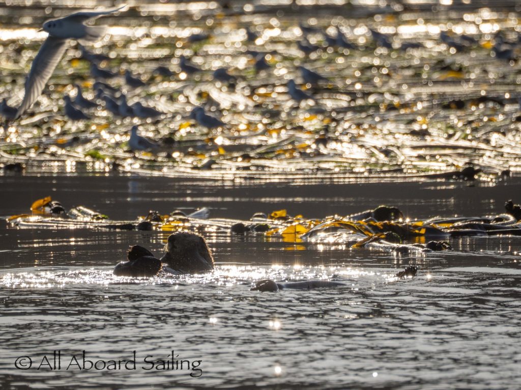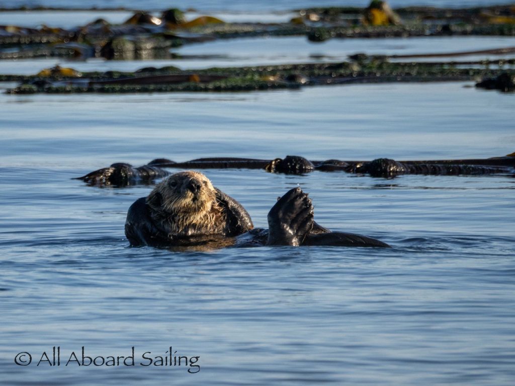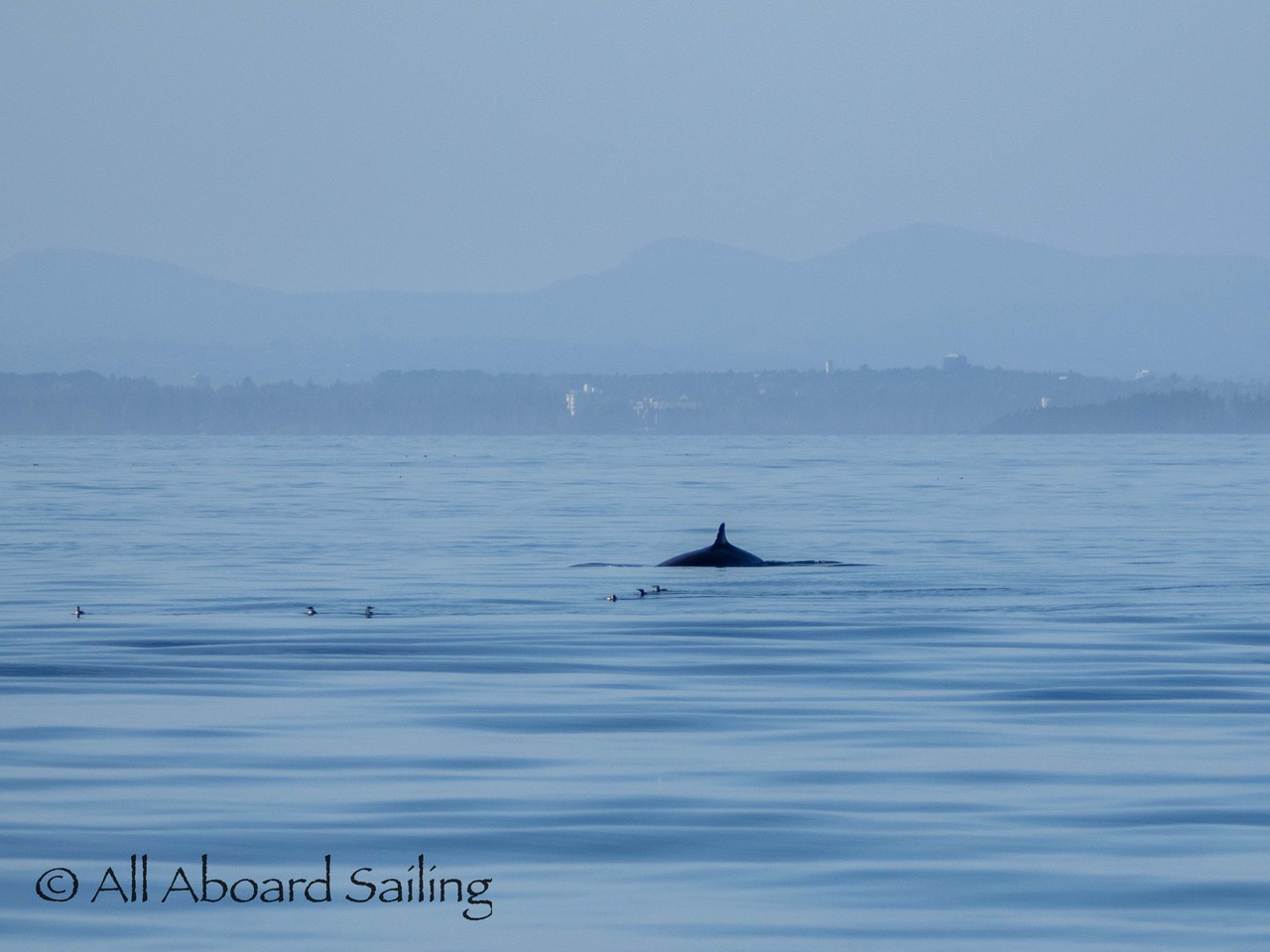 Sept 22, 2025 – We sailed south today and with a decent breeze and an ebb current were able to tack our way down to Cattle Pass for some nice sailing. After viewing the harbor seals and a bald eagle at Deadman Island we came out to Whale Rocks to view the Steller sea lions. The sea lions were quite playful and we noted a tiny pup in with the large animals. Coming out to Salmon Bank we had some views of a minke whale (aka “Dent”) near the southern tip of the bank. We moved south to MacArthur Bank seeing a humpback whale, BCZ0345 “Victory” who was heading north looking for bait balls as the current passed maximum flood. We continued north coming in the east side of Long Island seeing many black oystercatchers both adults and this year’s chicks. Came in quickly on the flood current stopping to see the sea otter at Turn Rock with quite a number of Bonaparte’s gulls.