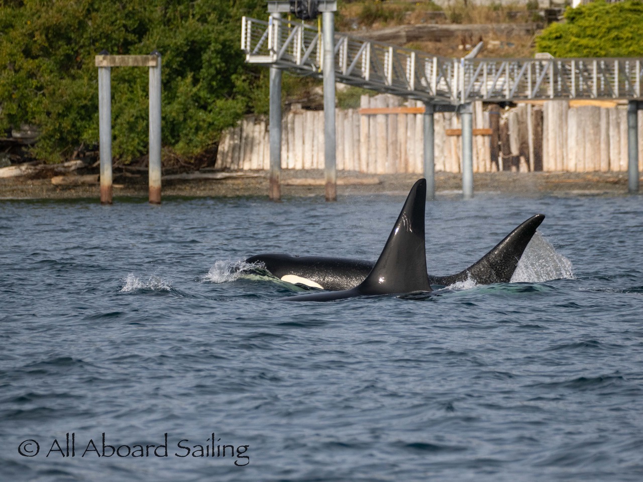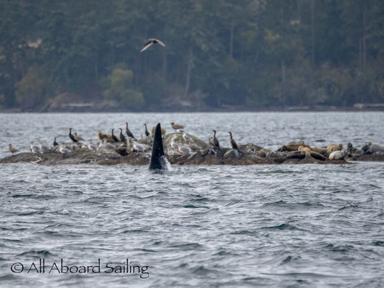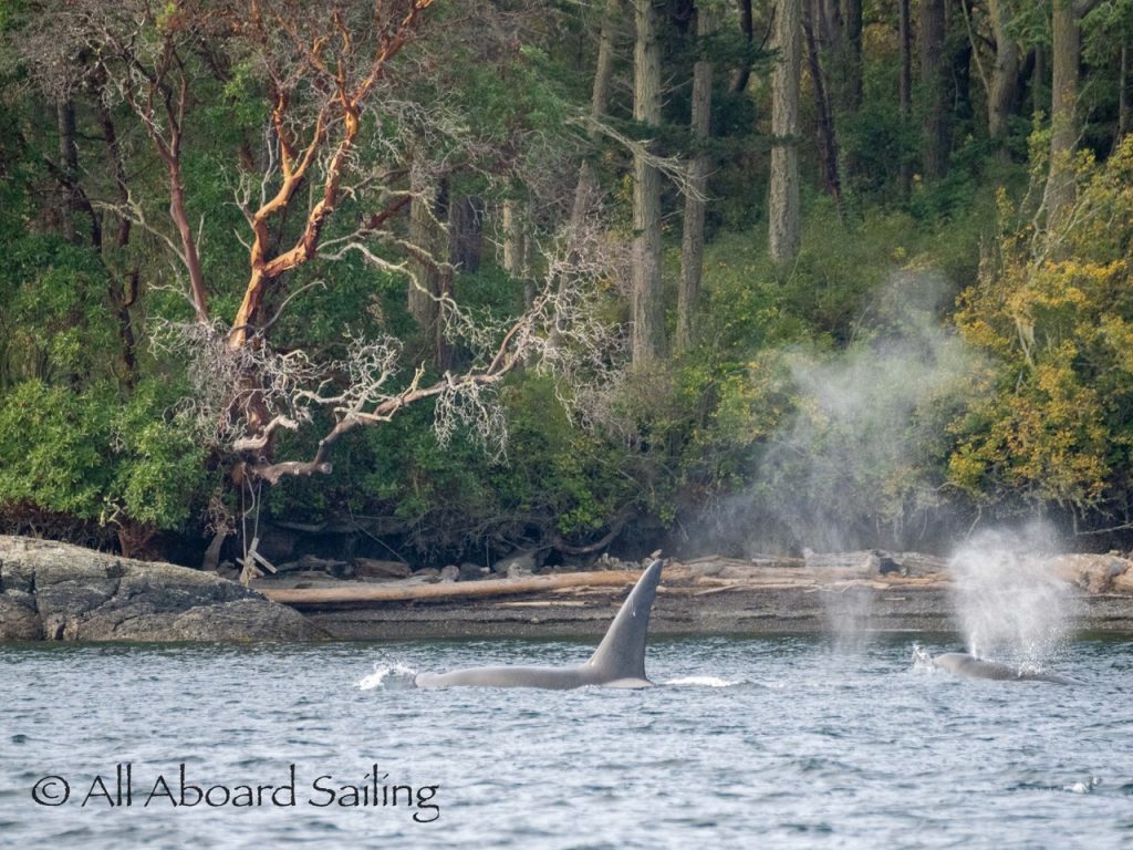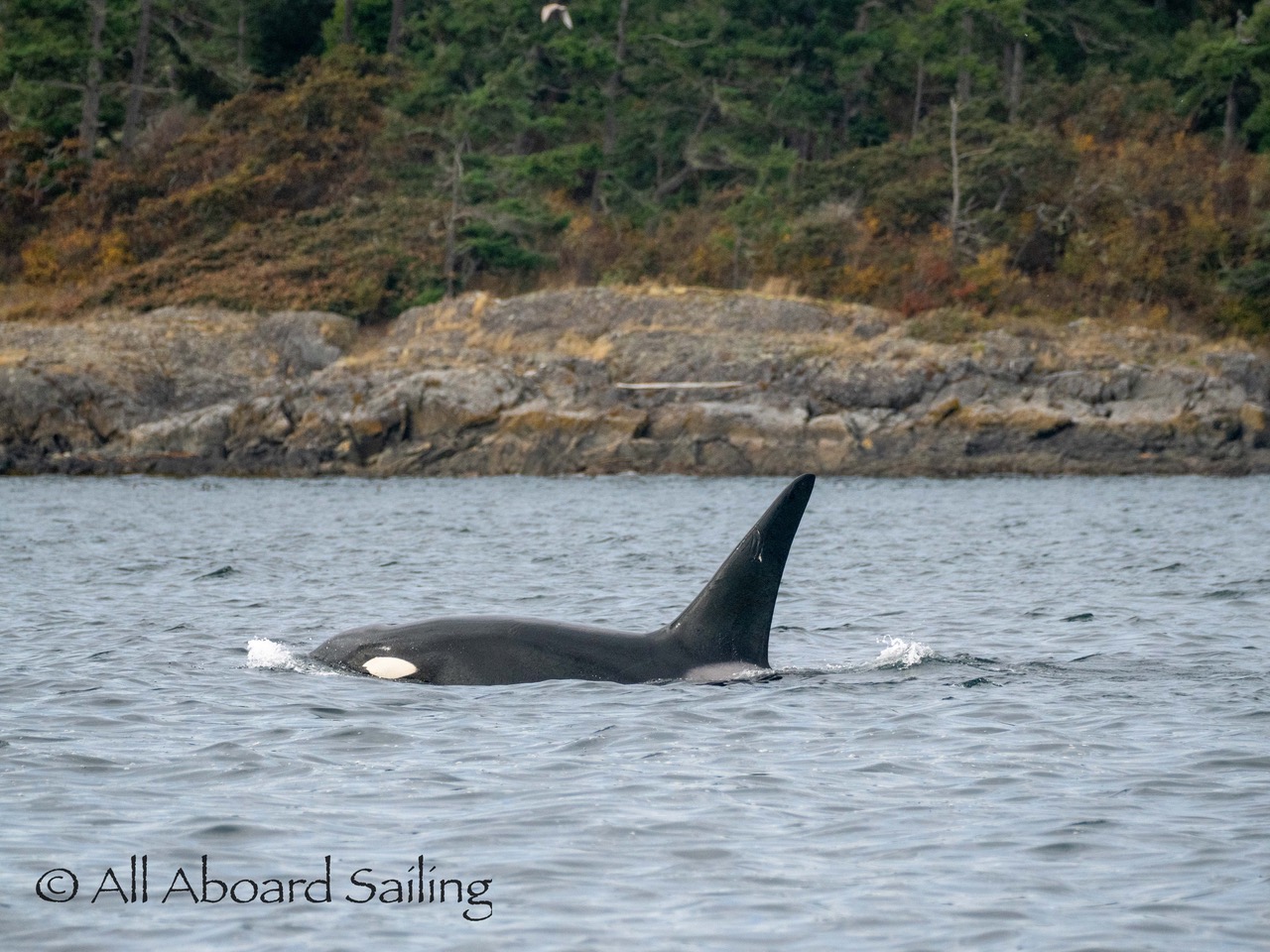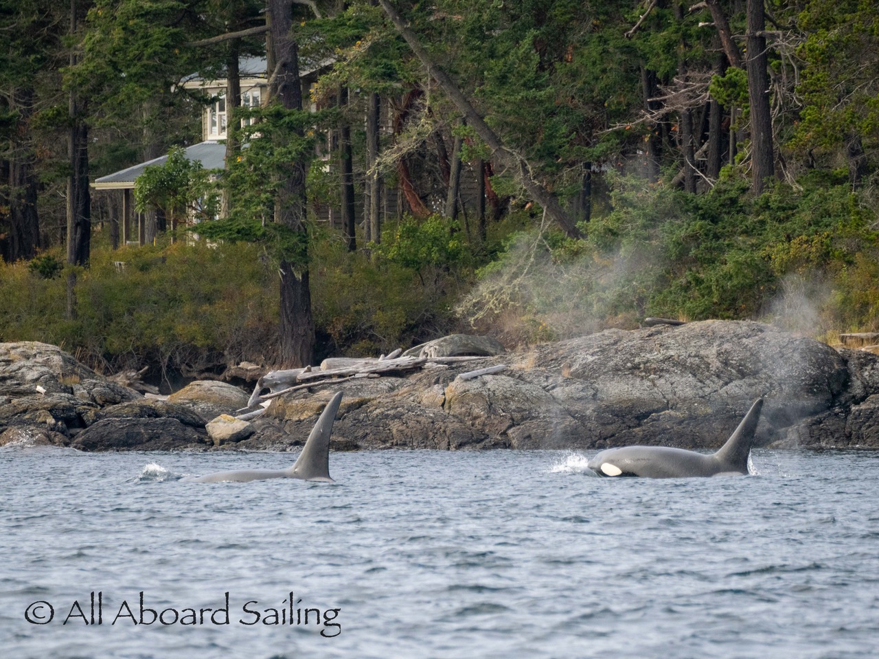 Sept 26, 2025 – We had a report Biggs/Transient orca brothers, T60D and T60E, passing Friday Harbor heading north and then again heading south. Sailing through Turn Island Pass we met them at Danger Rock and sailed alongside as they followed the coastline to Pear Pt and Dinner Island. Winds picked up and we reefed the main sail as we continued around Griffin Bay to Cattle Pass. Hunting just north of Goose Island included spy hops, tail lobs and breaches. We left them as they cleared Cattle Pt Lighthouse and we headed to Whale Rocks to view the Steller sea lions. From Long Island we sailed back to Deadman Island seeing a bald eagle and harbor seals. Wing on wing sailing back up the channel while cooking BBQ salmon with a salad lunch. A lovely day on the water.
