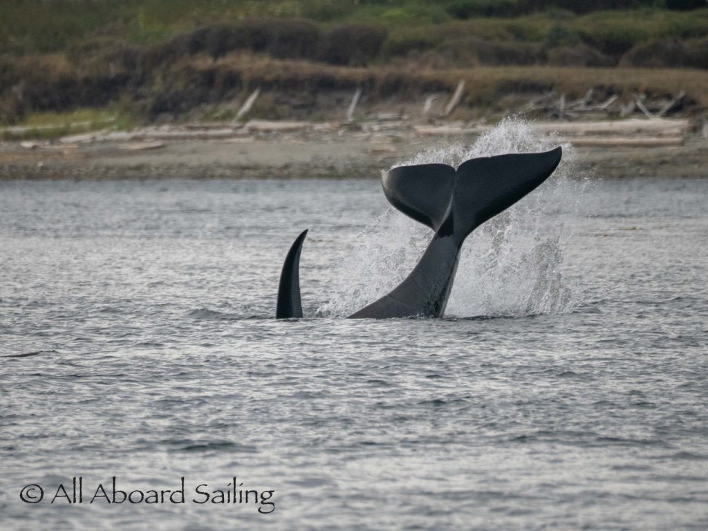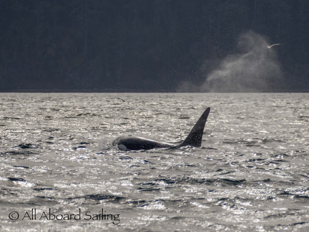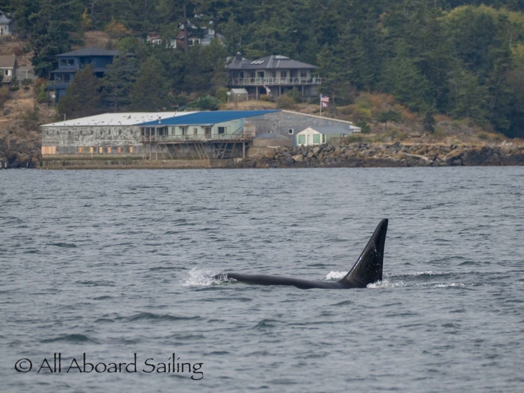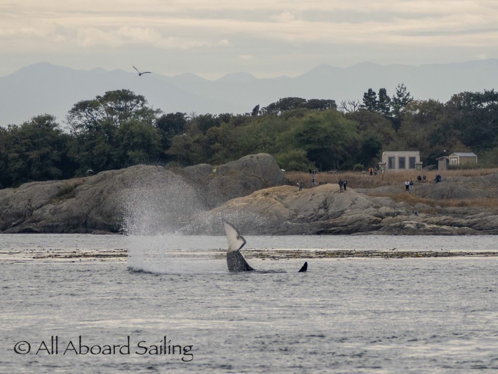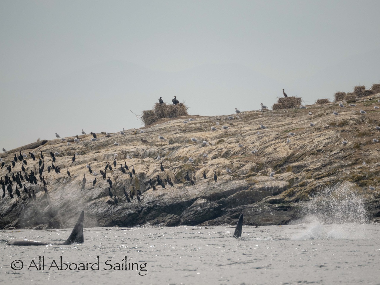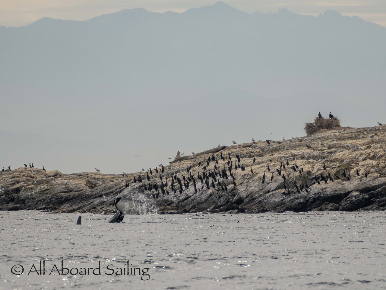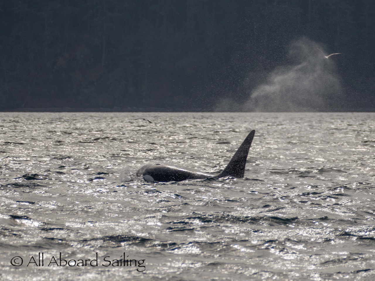 Sept 26, 2025 – We had a report Biggs/Transient orca brothers, T60D and T60E, passing Friday Harbor heading north and then again heading south. Sailing through Turn Island Pass we met them at Danger Rock and sailed alongside as they followed the coastline to Pear Pt and Dinner Island. Winds picked up and we reefed the main sail as we continued around Griffin Bay to Cattle Pass. Hunting just north of Goose Island included spy hops, tail lobs and breaches. We left them as they cleared Cattle Pt Lighthouse and we headed to Whale Rocks to view the Steller sea lions. From Long Island we sailed back to Deadman Island seeing a bald eagle and harbor seals. Wing on wing sailing back up the channel while cooking BBQ salmon with a salad lunch. A lovely day on the water.