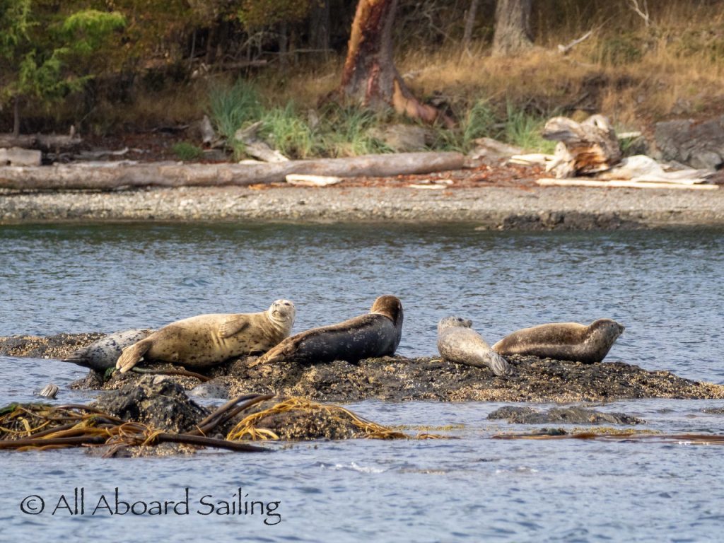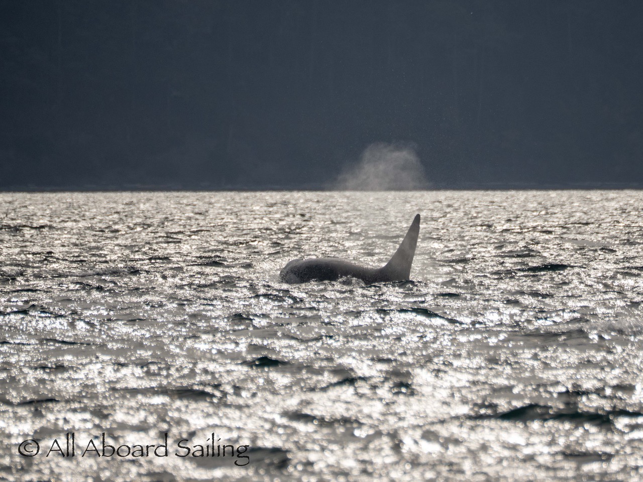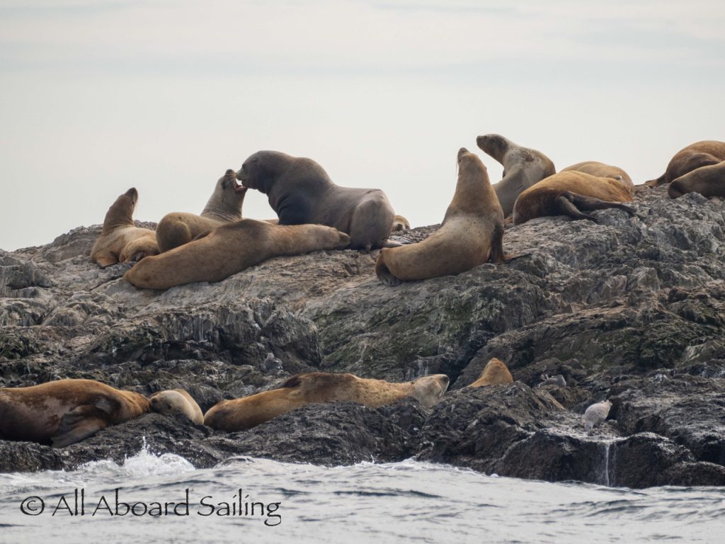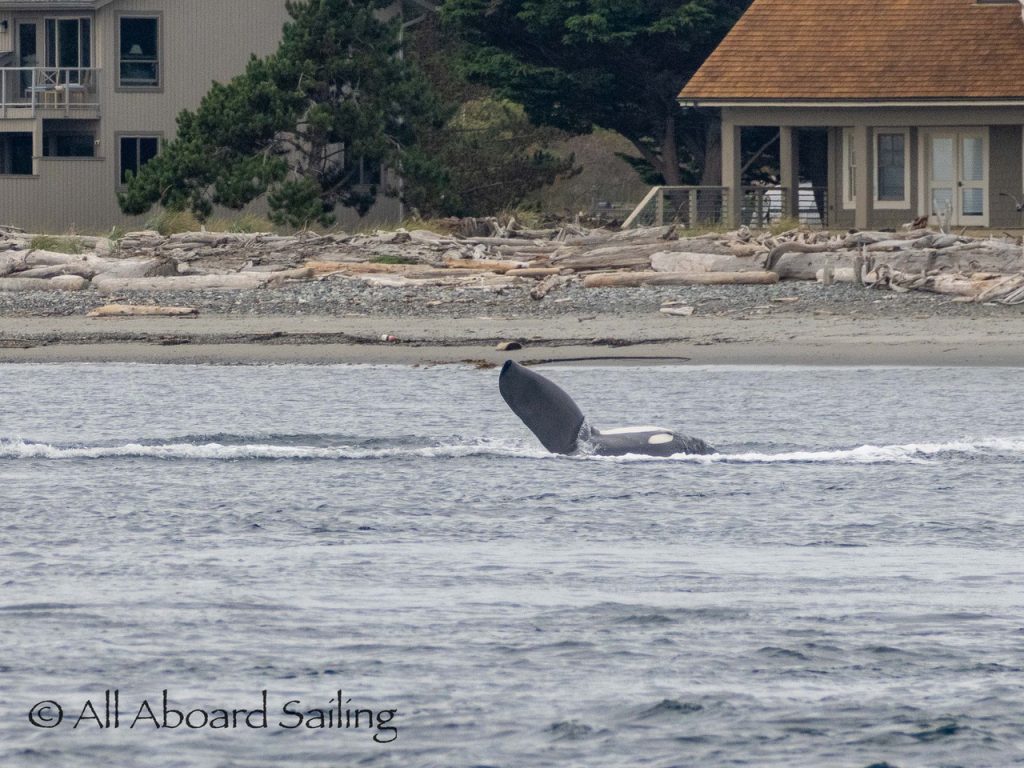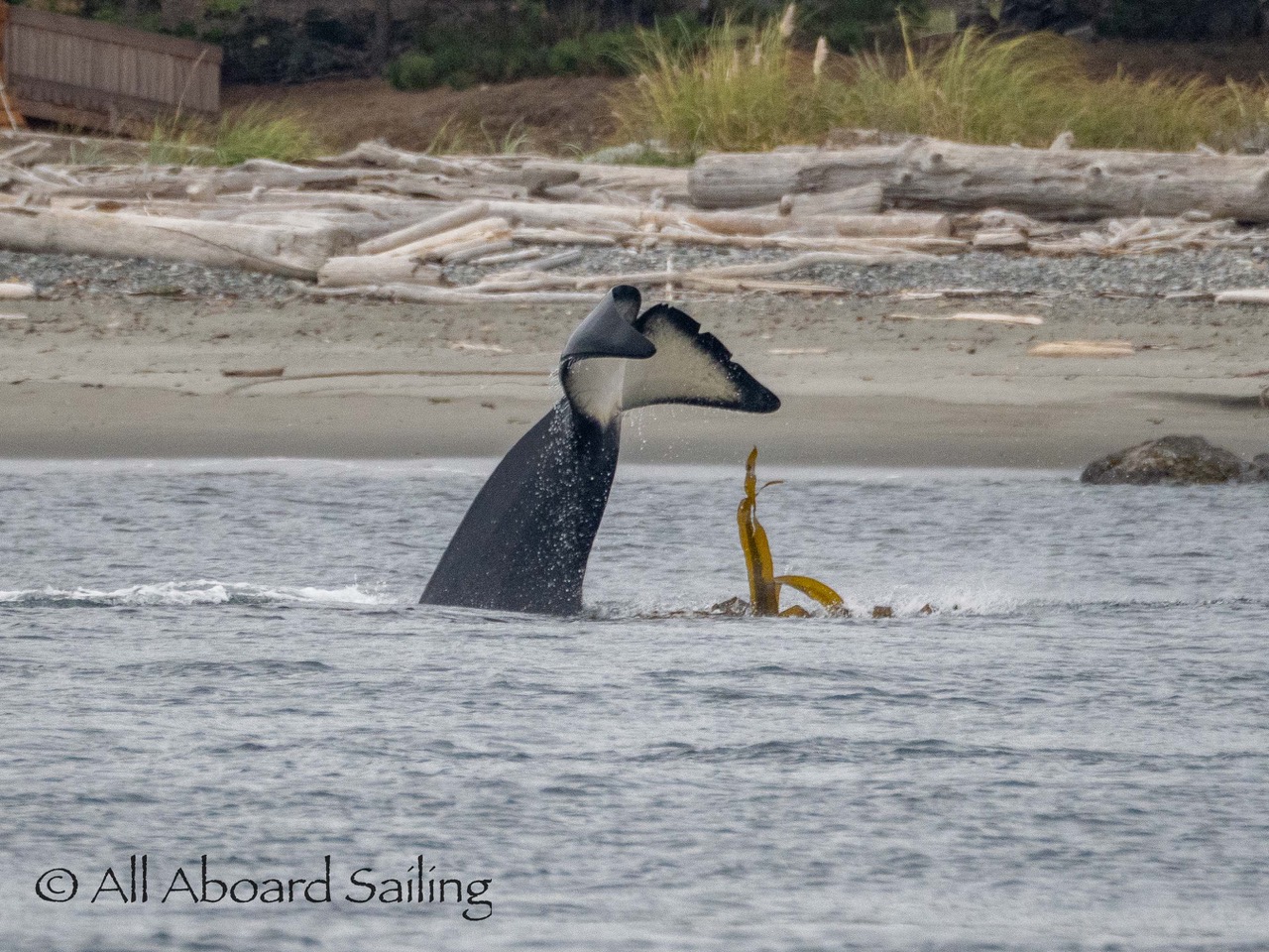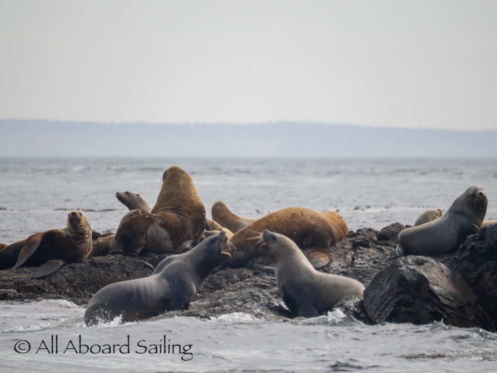 Sept 26, 2025 – We had a report Biggs/Transient orca brothers, T60D and T60E, passing Friday Harbor heading north and then again heading south. Sailing through Turn Island Pass we met them at Danger Rock and sailed alongside as they followed the coastline to Pear Pt and Dinner Island. Winds picked up and we reefed the main sail as we continued around Griffin Bay to Cattle Pass. Hunting just north of Goose Island included spy hops, tail lobs and breaches. We left them as they cleared Cattle Pt Lighthouse and we headed to Whale Rocks to view the Steller sea lions. From Long Island we sailed back to Deadman Island seeing a bald eagle and harbor seals. Wing on wing sailing back up the channel while cooking BBQ salmon with a salad lunch. A lovely day on the water.