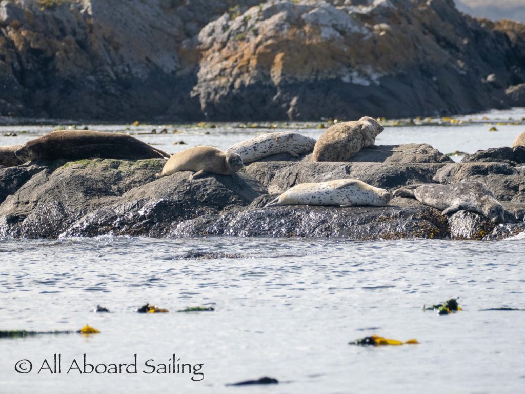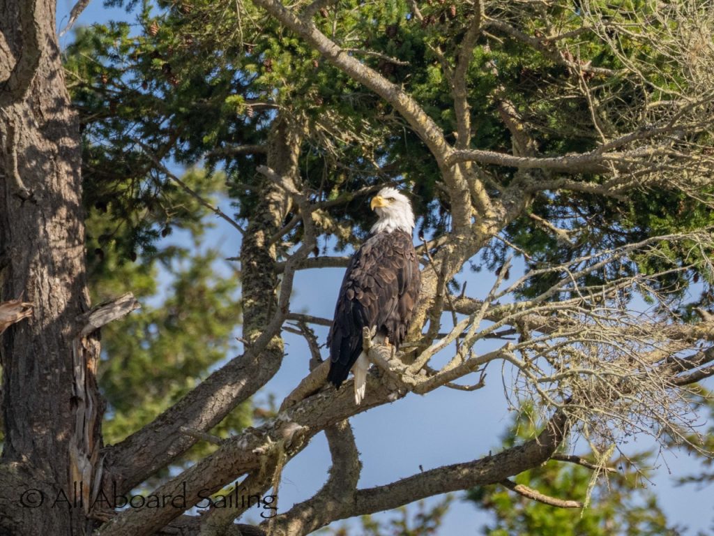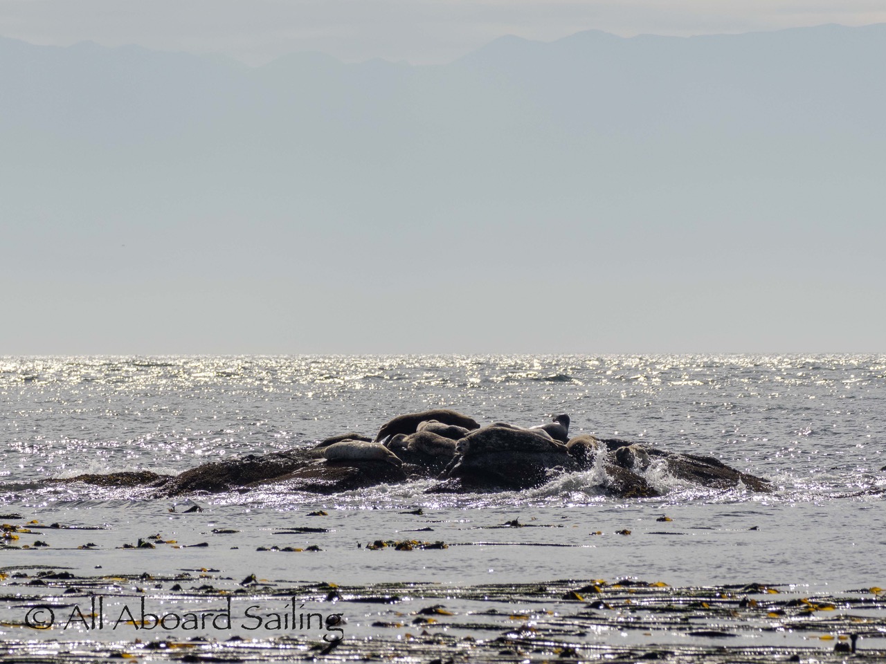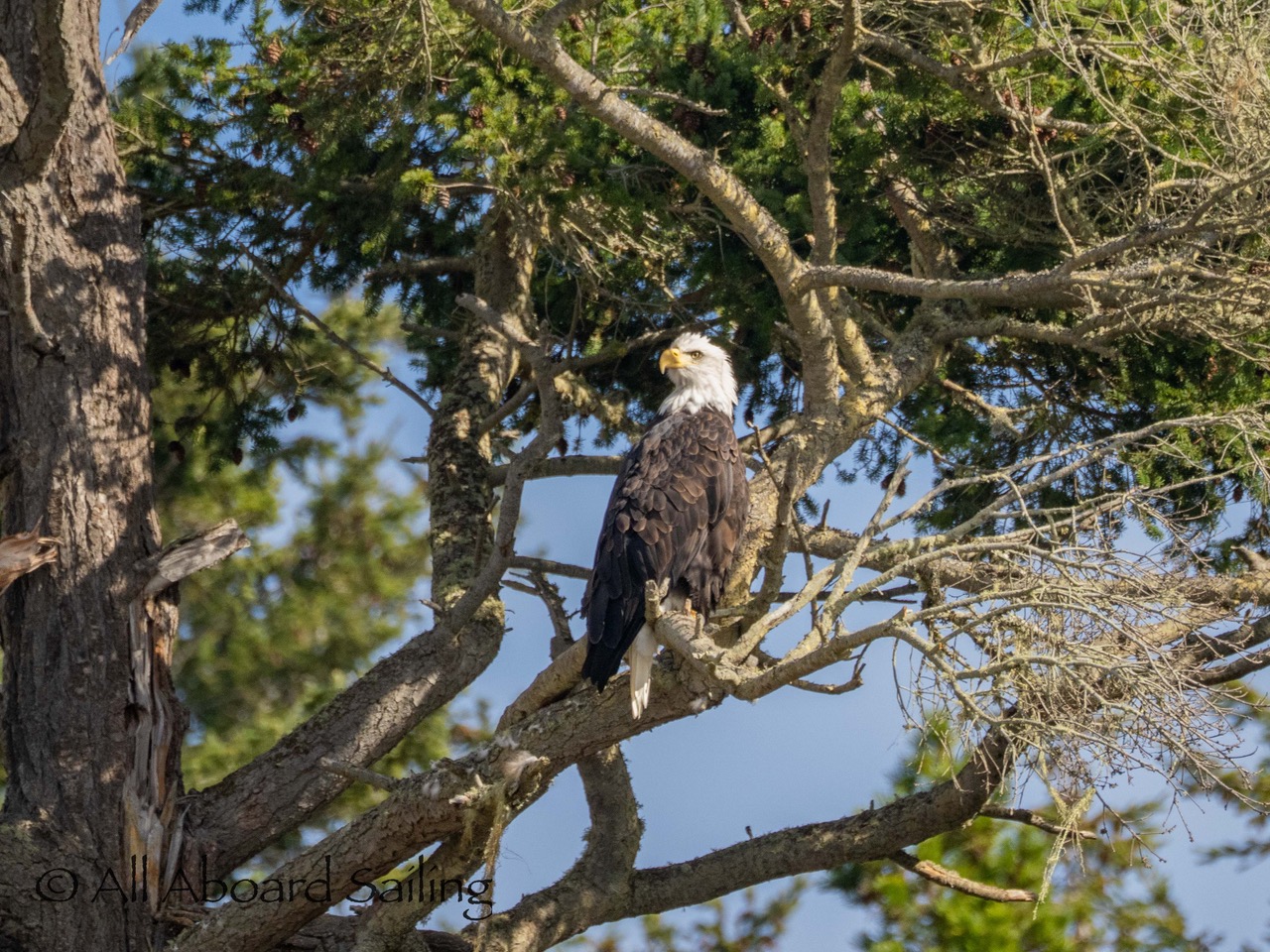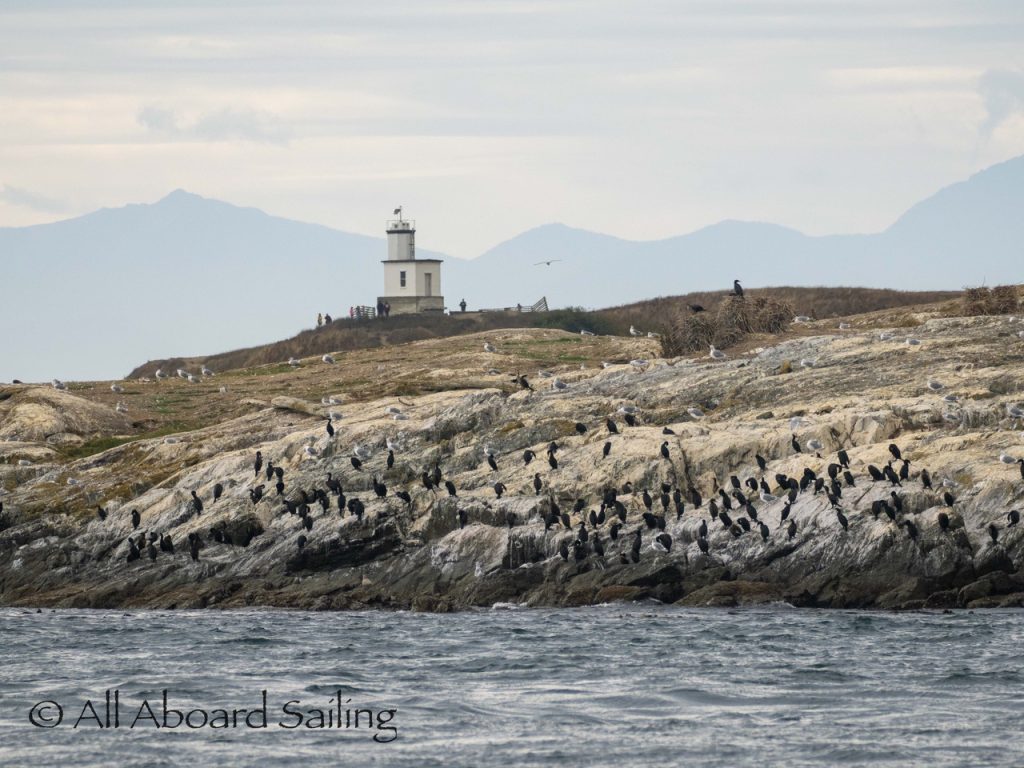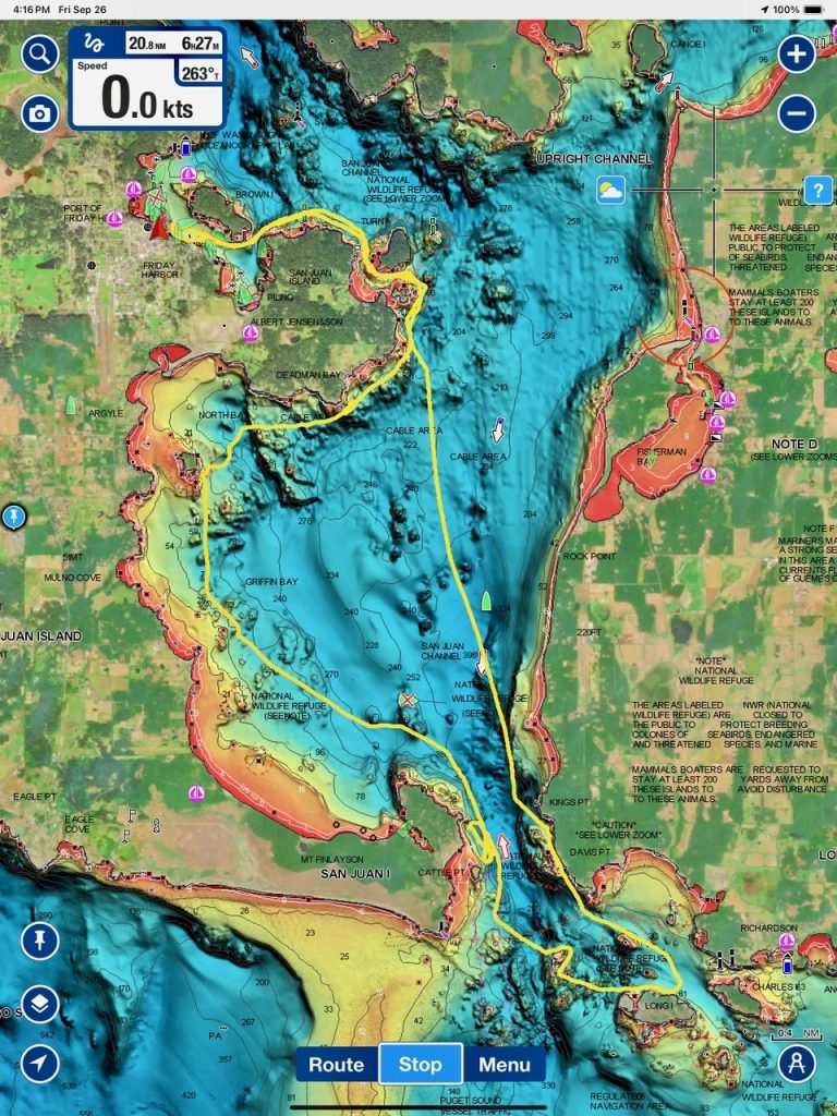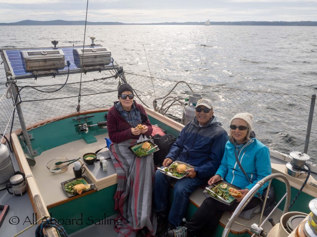 Sept 26, 2025 – We had a report Biggs/Transient orca brothers, T60D and T60E, passing Friday Harbor heading north and then again heading south. Sailing through Turn Island Pass we met them at Danger Rock and sailed alongside as they followed the coastline to Pear Pt and Dinner Island. Winds picked up and we reefed the main sail as we continued around Griffin Bay to Cattle Pass. Hunting just north of Goose Island included spy hops, tail lobs and breaches. We left them as they cleared Cattle Pt Lighthouse and we headed to Whale Rocks to view the Steller sea lions. From Long Island we sailed back to Deadman Island seeing a bald eagle and harbor seals. Wing on wing sailing back up the channel while cooking BBQ salmon with a salad lunch. A lovely day on the water.