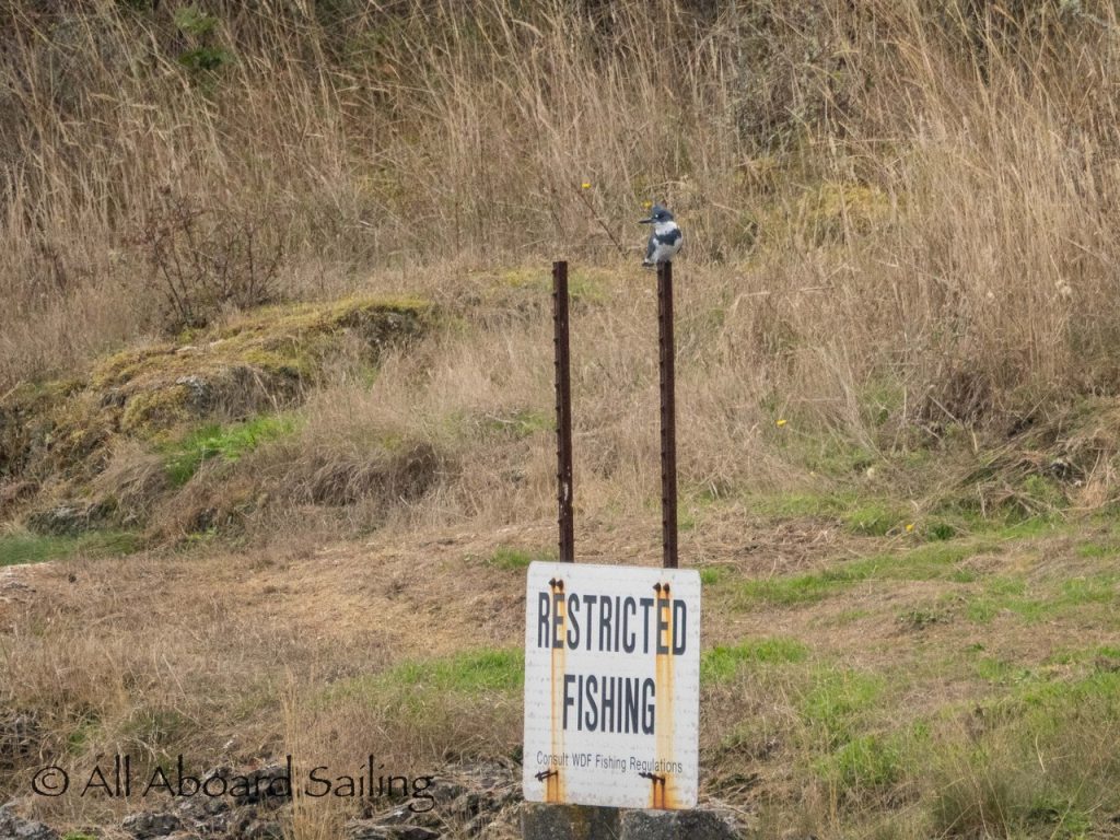 Belted kingfisher on Restricted Fishing sign