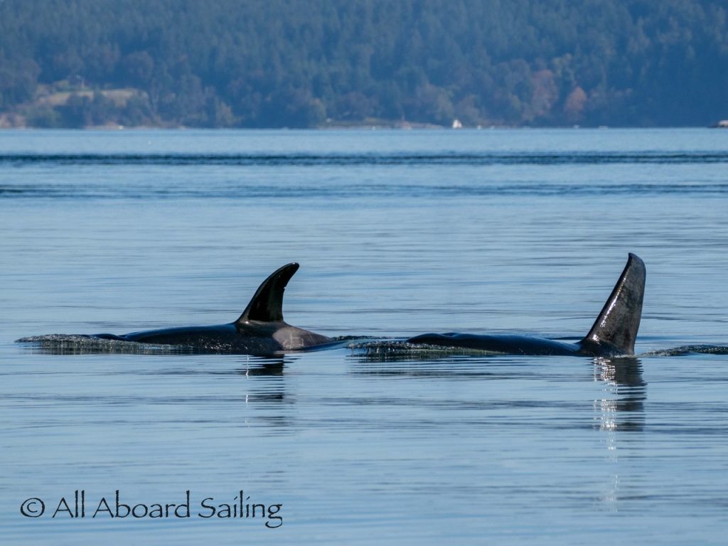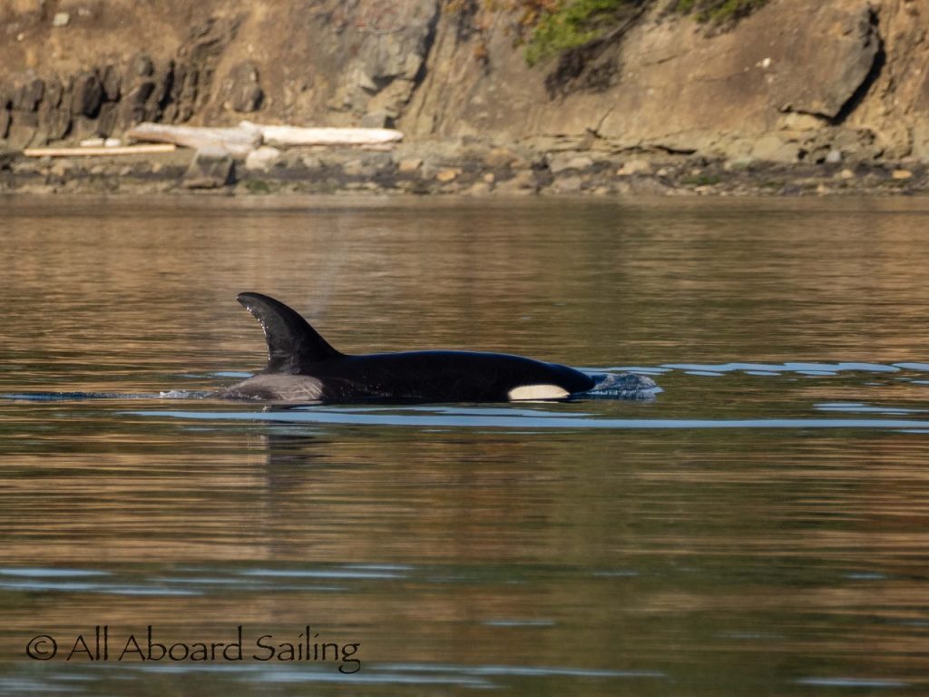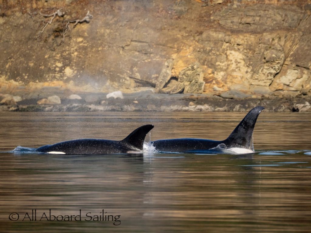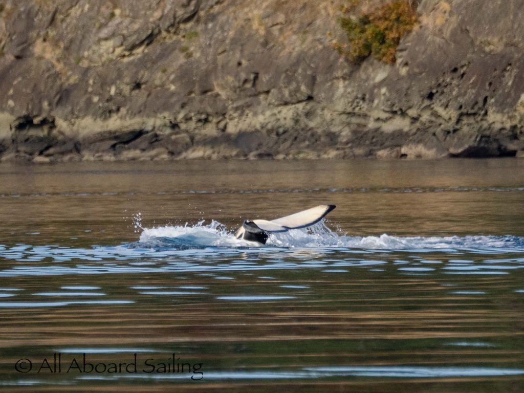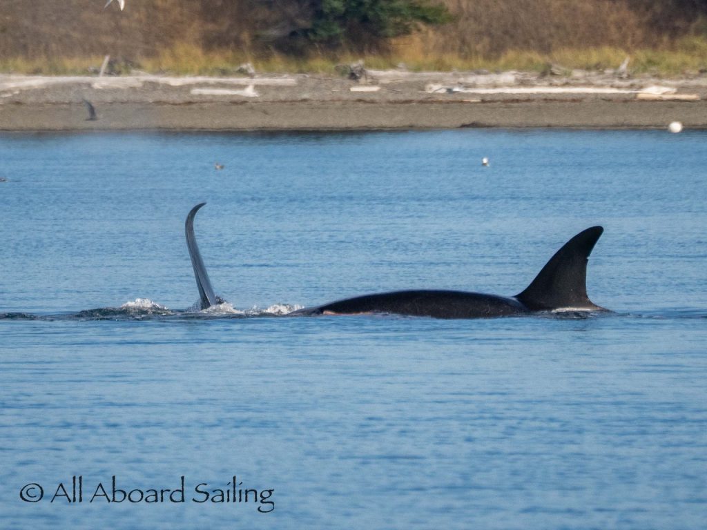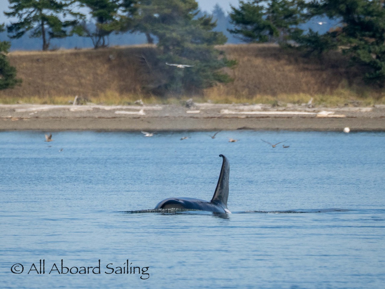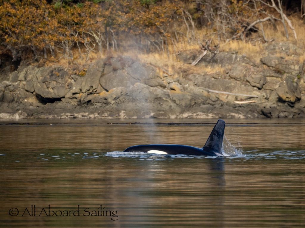 October 17, 2025 – With a report of orcas westbound out of Wasp Passage after hunting in West Sound we moved north quickly. We caught up with the two male orcas known as T49A2 (born 2007) and T65A5 (born 2014) in New Channel. Some lovely views as they socialized on the coastline of Cactus Island in fast moving mirror calm waters. After a burst of speed they were hunting near the kelp bed at Gull Reef. We left them heading west to Stuart Island and we followed the Spieden Island coastline followed by the cut through the Cactus Islands and out to Flattop Island. Returned by way of Spring Pass and the Wasp Islands with a nice close-hauled sail across San Juan Channel.