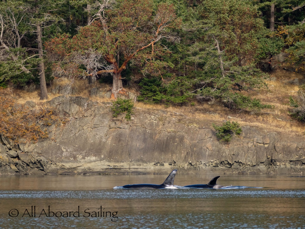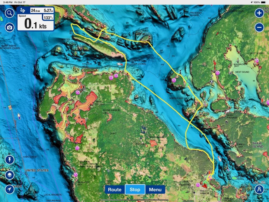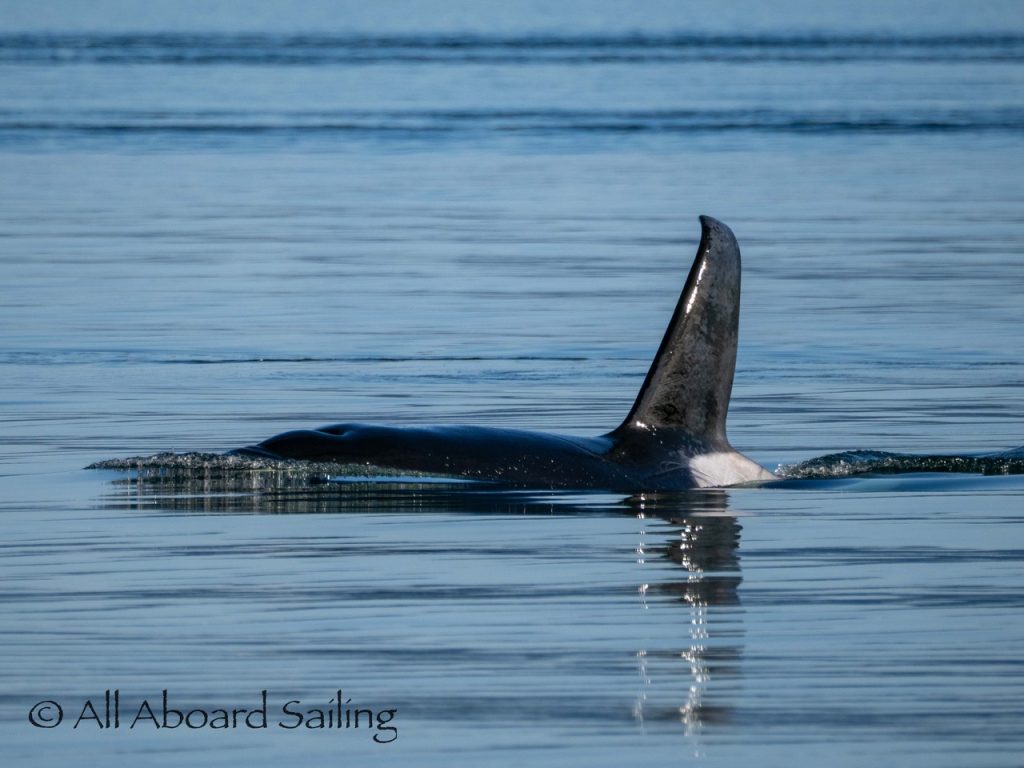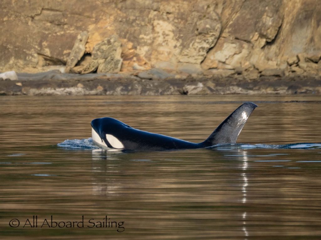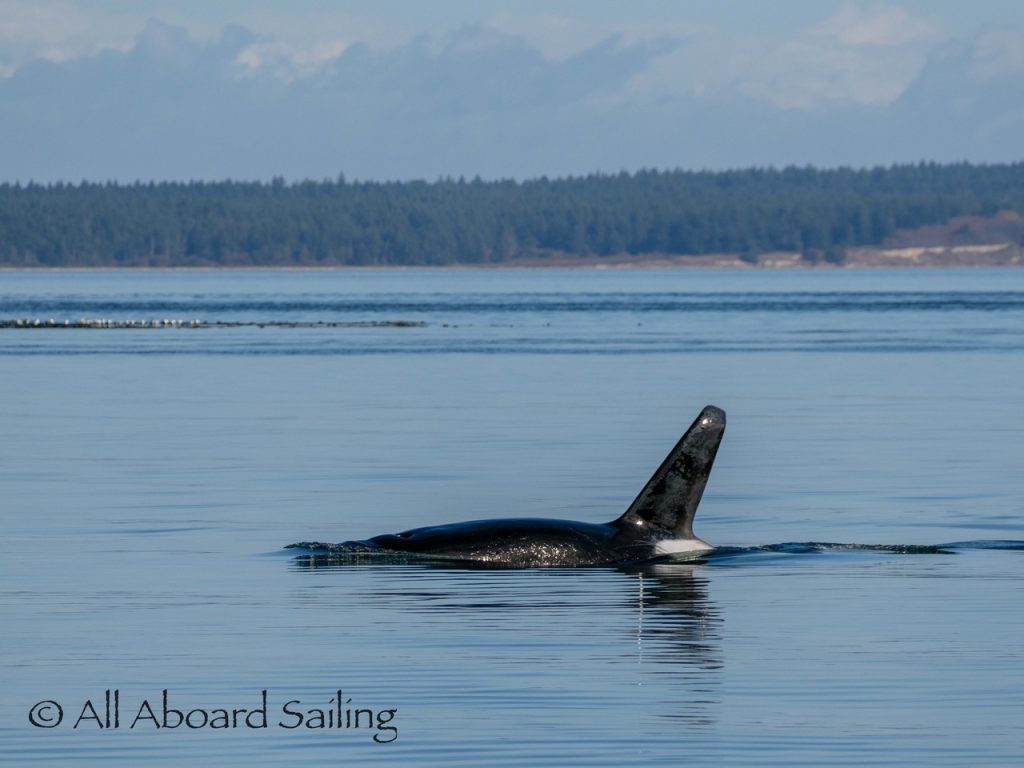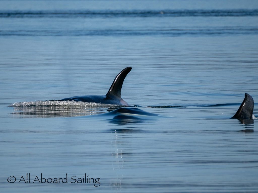 October 17, 2025 – With a report of orcas westbound out of Wasp Passage after hunting in West Sound we moved north quickly. We caught up with the two male orcas known as T49A2 (born 2007) and T65A5 (born 2014) in New Channel. Some lovely views as they socialized on the coastline of Cactus Island in fast moving mirror calm waters. After a burst of speed they were hunting near the kelp bed at Gull Reef. We left them heading west to Stuart Island and we followed the Spieden Island coastline followed by the cut through the Cactus Islands and out to Flattop Island. Returned by way of Spring Pass and the Wasp Islands with a nice close-hauled sail across San Juan Channel.