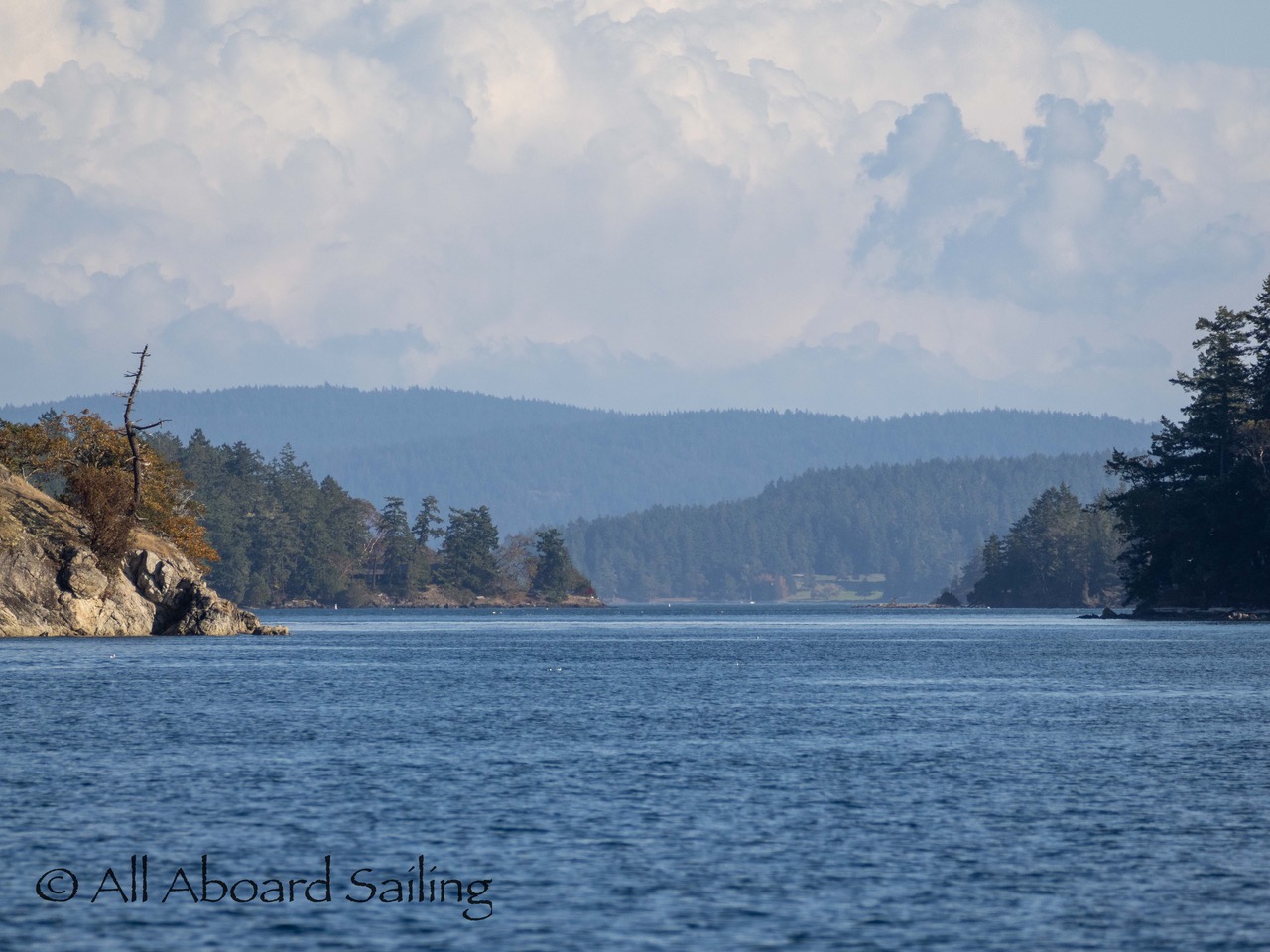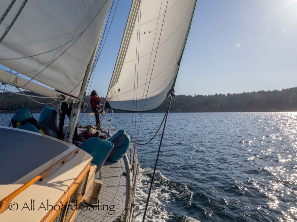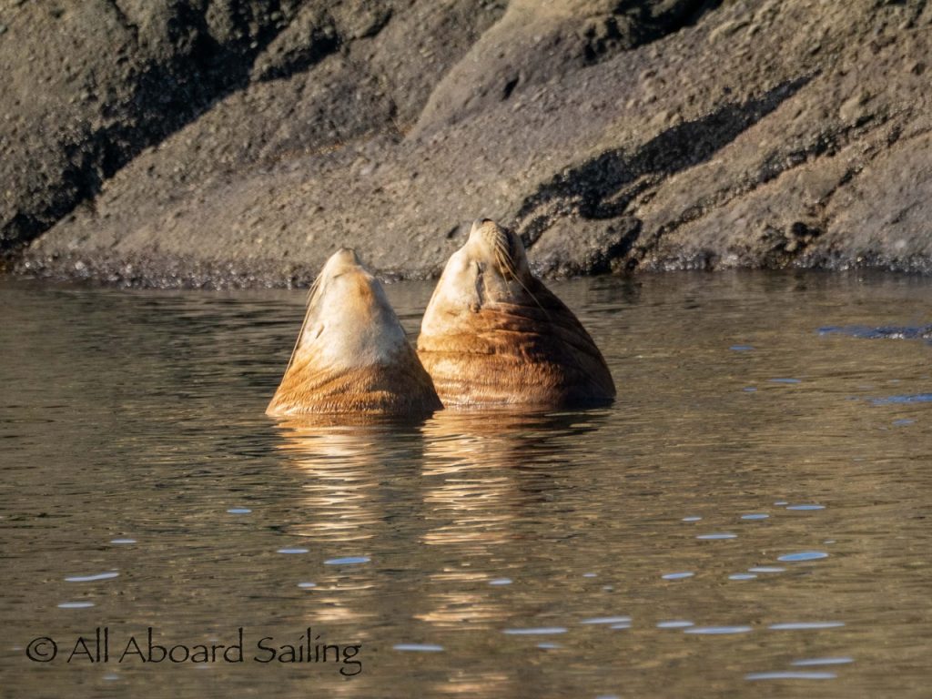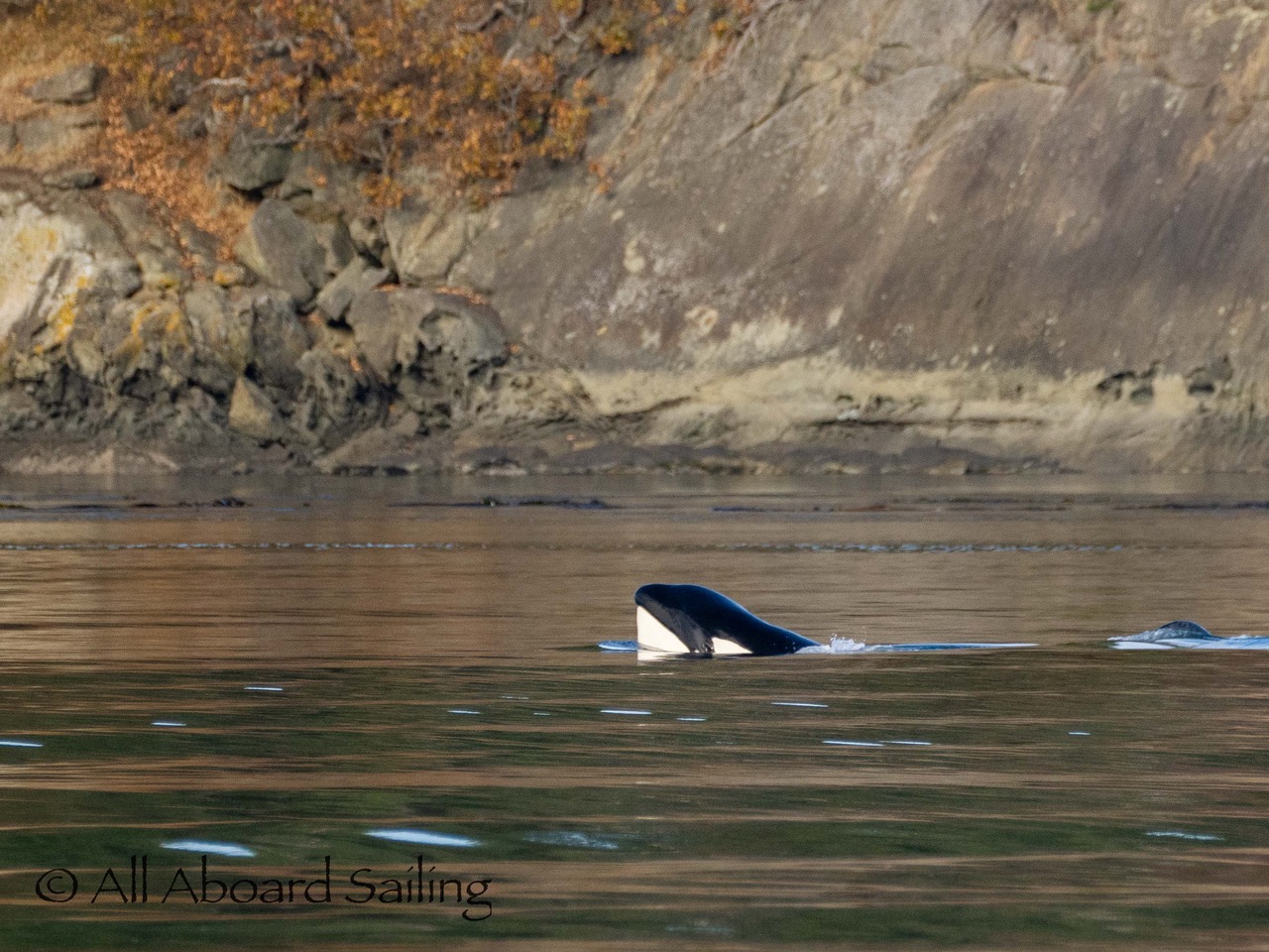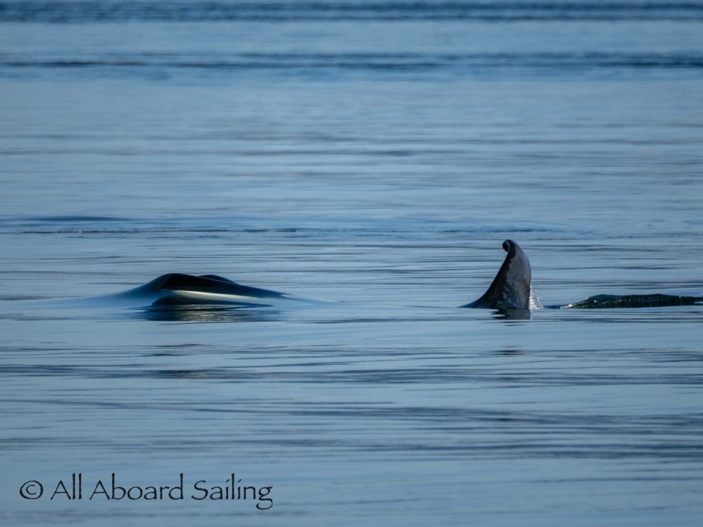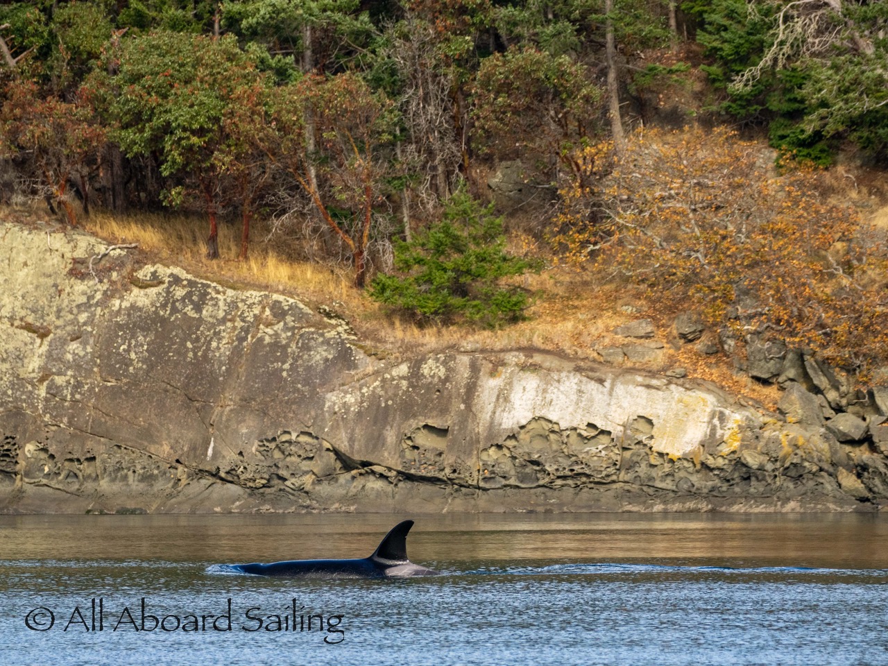 October 17, 2025 – With a report of orcas westbound out of Wasp Passage after hunting in West Sound we moved north quickly. We caught up with the two male orcas known as T49A2 (born 2007) and T65A5 (born 2014) in New Channel. Some lovely views as they socialized on the coastline of Cactus Island in fast moving mirror calm waters. After a burst of speed they were hunting near the kelp bed at Gull Reef. We left them heading west to Stuart Island and we followed the Spieden Island coastline followed by the cut through the Cactus Islands and out to Flattop Island. Returned by way of Spring Pass and the Wasp Islands with a nice close-hauled sail across San Juan Channel.