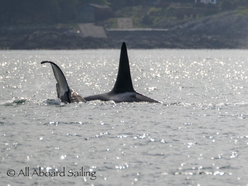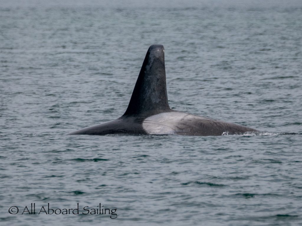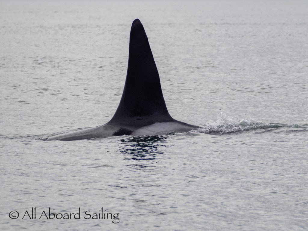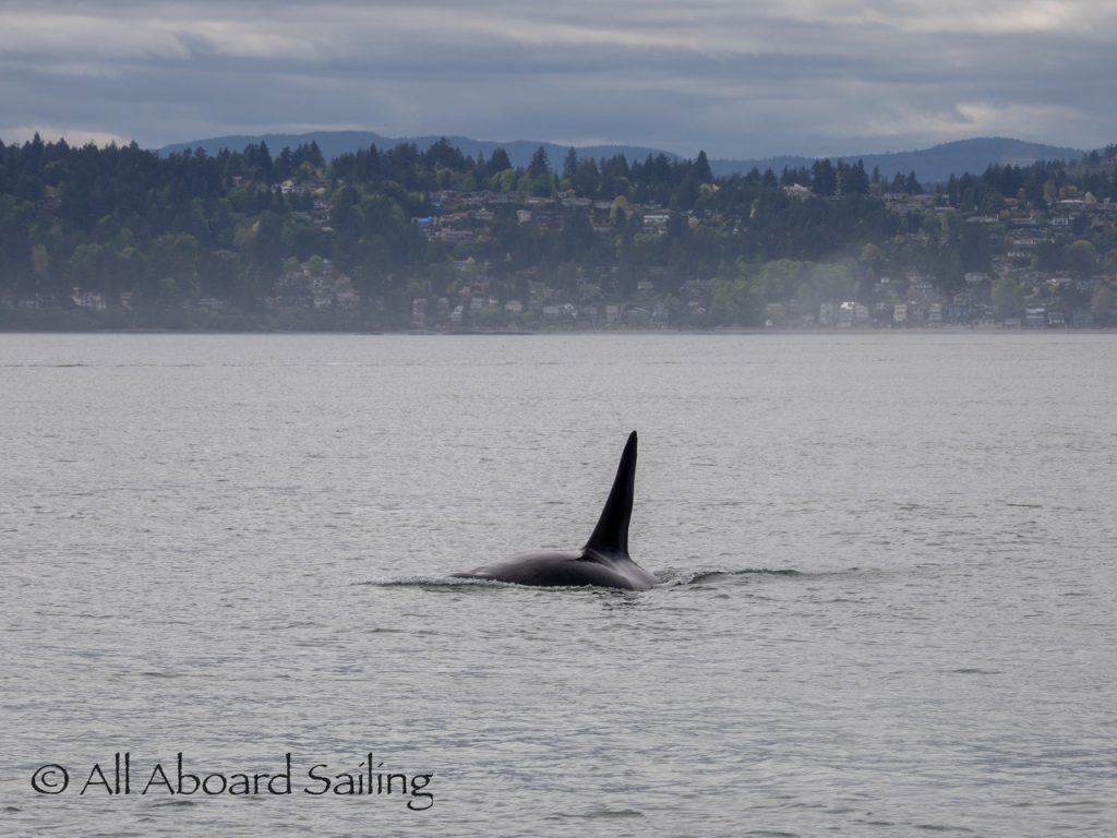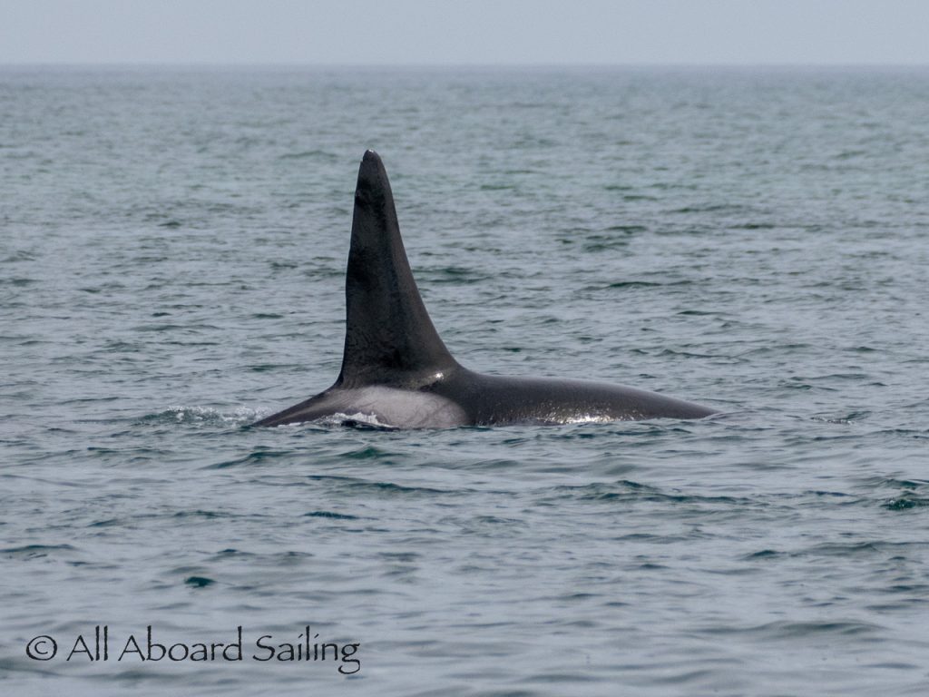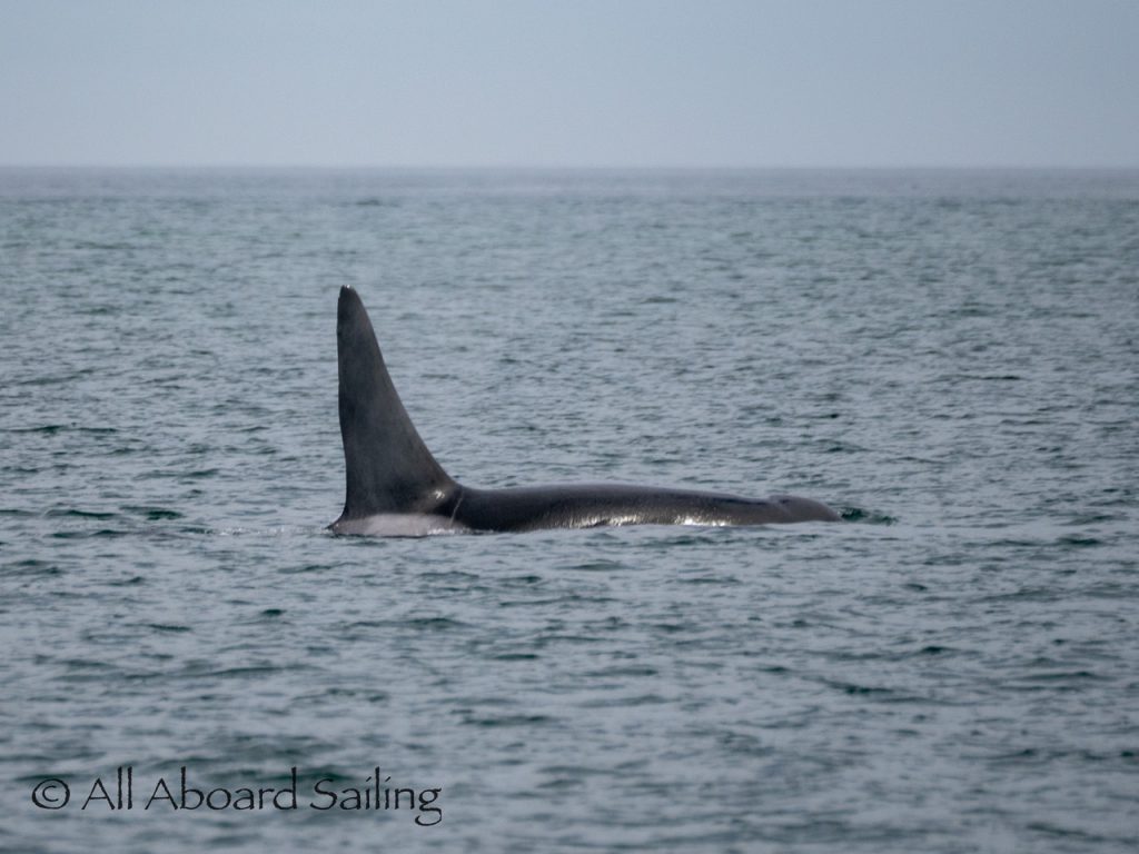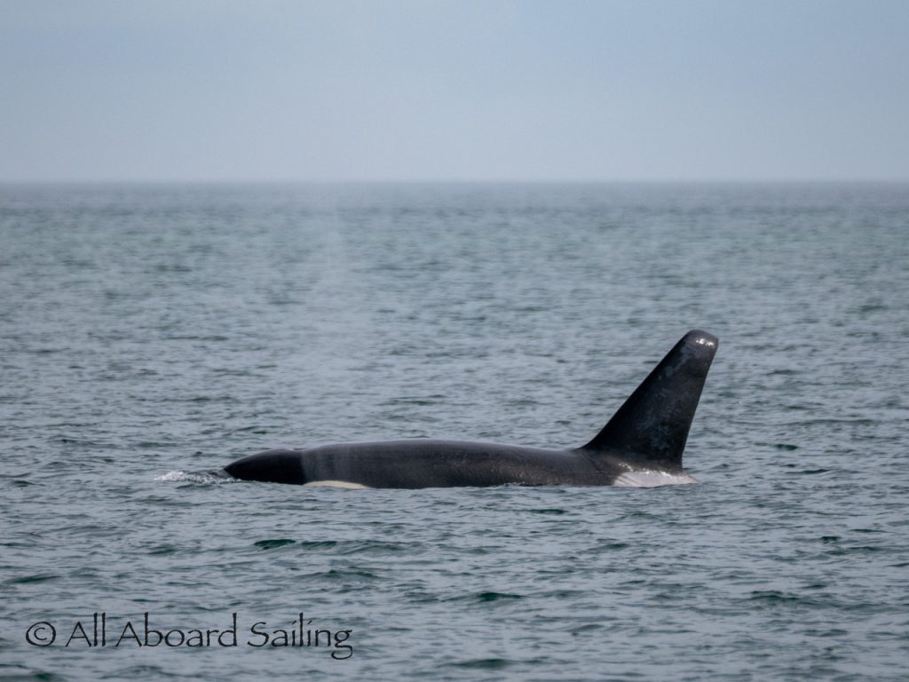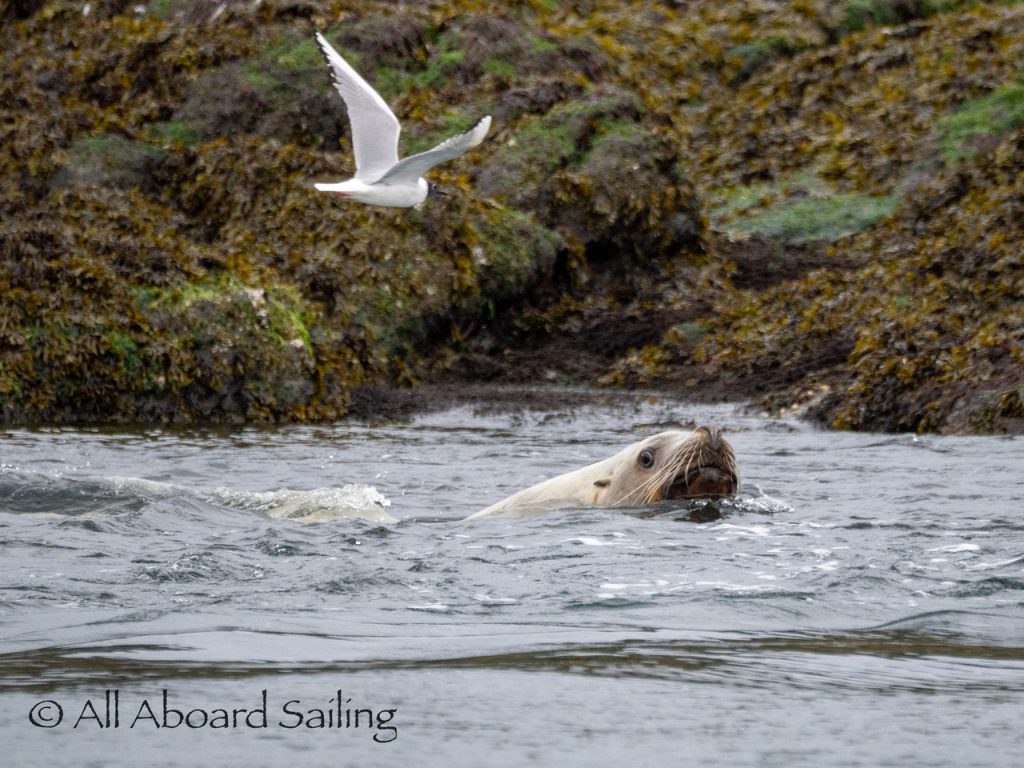April 22, 2026 – After casting off from Friday Harbor we headed North after hearing reports of two Biggs/Transient male orcas over by D’Arcy Island. They had crossed Haro from Henry Island earlier that morning. Spieden Island was full of activity today. Steller sea lions hauled out including branded sea lion “929R”, bald eagles on shore, Mouflon sheep/rams and fallow deer in large herds and loads of Bonaparte’s gulls in the channel. We had a beautiful drift in the fast moving ebb current. Harbor seals were abundant on Sentinel Rock. After sticking close to Stuart Island to stay out of the strong ebb coming down Haro we made our crossing into Canada towards the orcas. The orcas identified as T49A2 (born 2007) and T51 (born ~1981) had traveled north to the top of Sidney Channel but flipped direction heading back south. We arrived on scene near D’Arcy and had some great views as they continued south. After departing the orcas we had a fast sail about 7+ knots towards Cattle Pass where we rode in on the flood current. Sailed through the narrow pass around Turn Island before returning back to Friday Harbor.