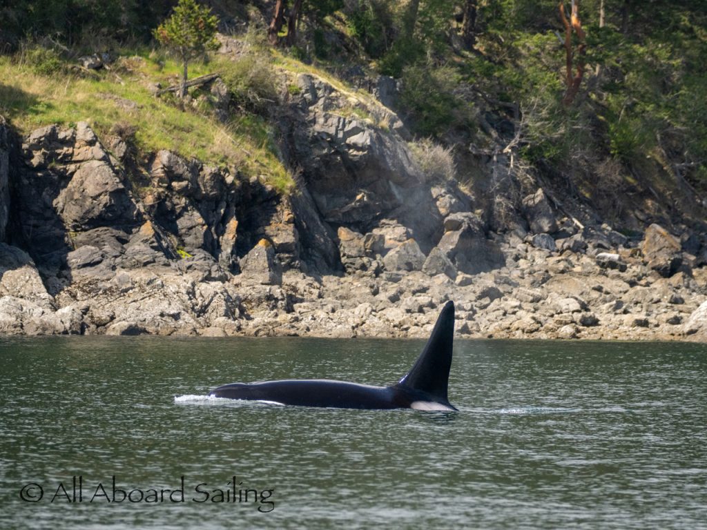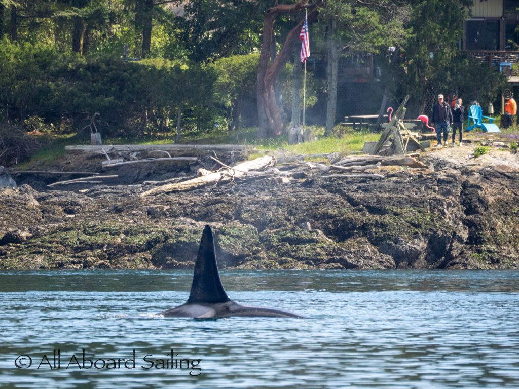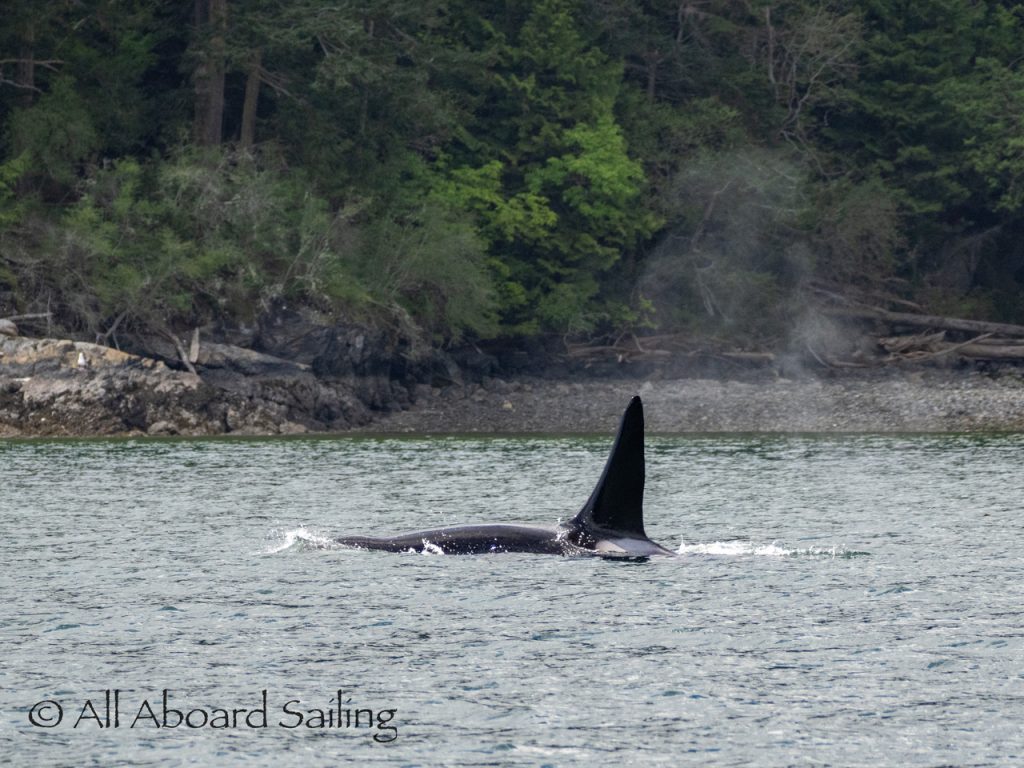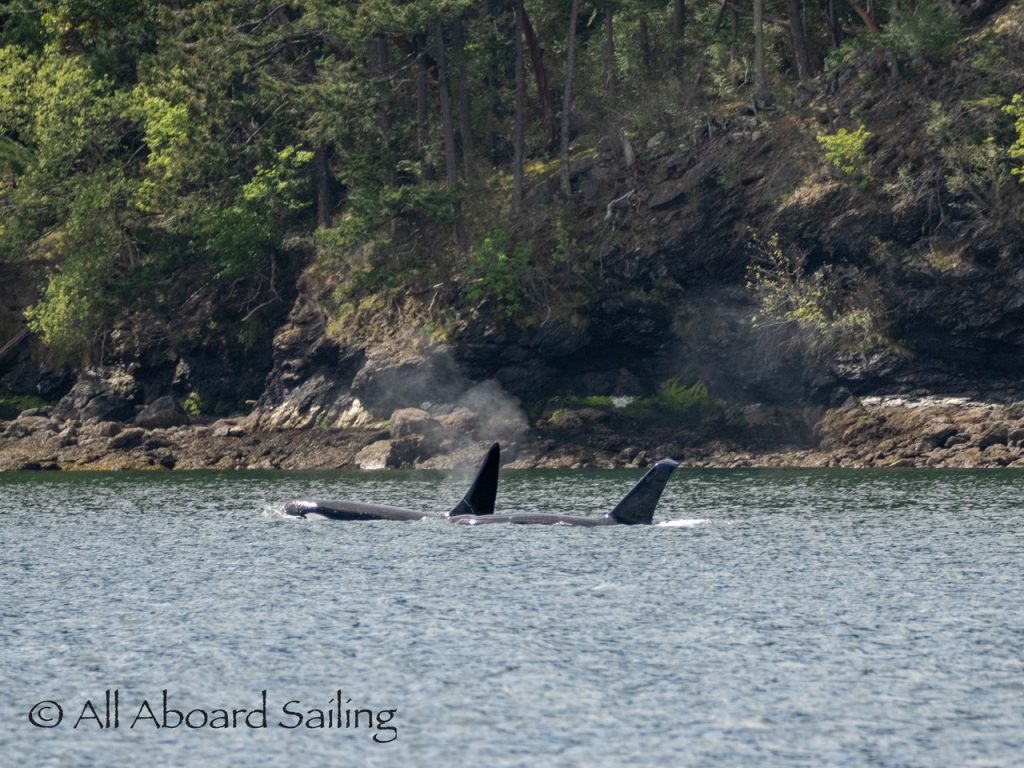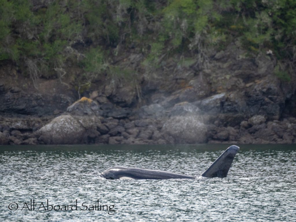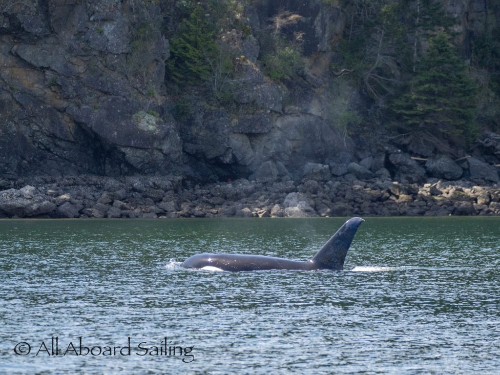 April 23, 2026 – Before casting off from Friday Harbor we had been monitoring reports of two male orcas in East Sound, Orcas Island. They were orcas we’d seen the day before southbound in Haro Strait known as T49A2 (born 2007) with T51 (born ~1981). We arrived on scene as the boys were southbound in East Sound hugging the beautiful coastline of Orcas island before taking Cayou Channel. Incredible views. Fun sailing. Birthday celebrations. A great day on the water.