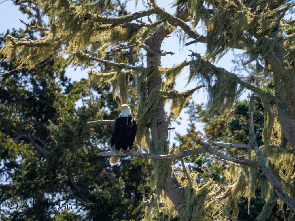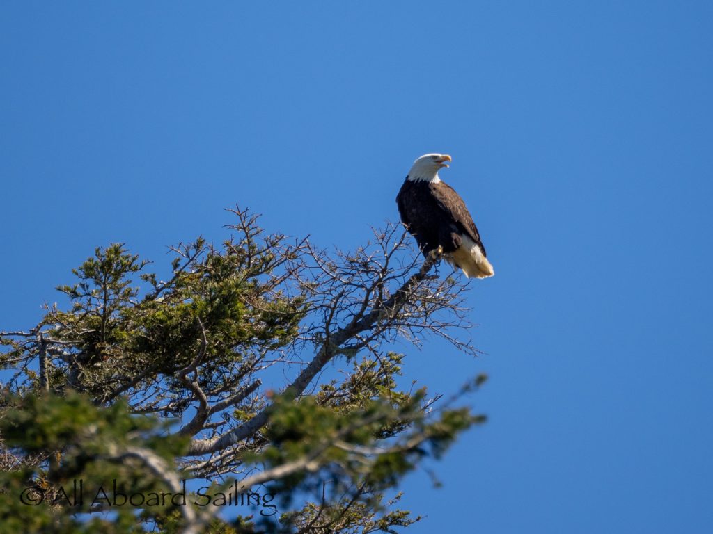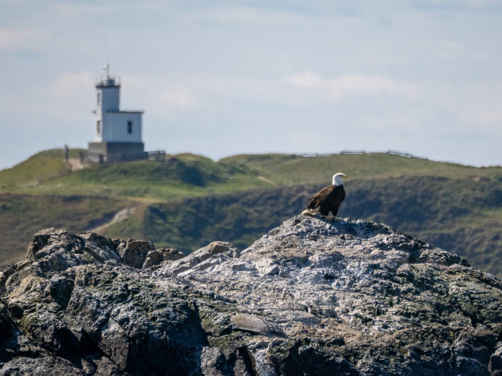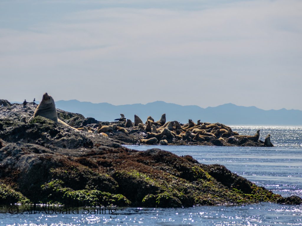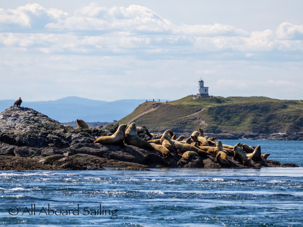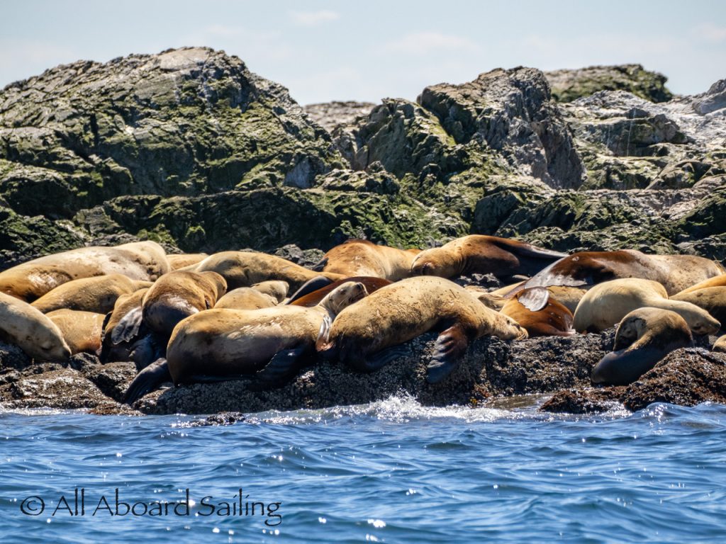 April 25, 2026 – Today we set a course for south. We drifted through the narrow channel by Turn Island passing harbor seals resting on the rocks. Near Deadman Island we saw an adult bald eagle chase a juvenile bald eagle and gave some great vocals after returning to its roost in a nearby tree. Winds were very light in San Juan Channel but picked up outside of Cattle Pass. We sailed quickly towards Whale Rocks where there were many small Steller sea lions. Presumably these are young females just returning here during their breeding season accompanied by several large males. This is a fairly new trend over the last 5 years or so. Typically all the sea lions which appear to be large males leave the area end of May and return after September. This new colony sticks around Whale Rocks for a few months.