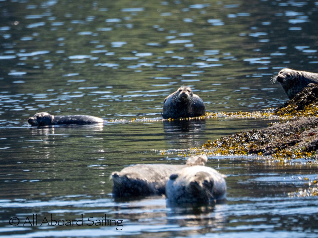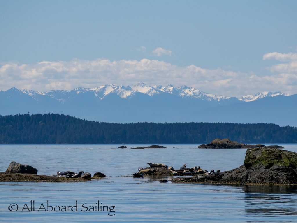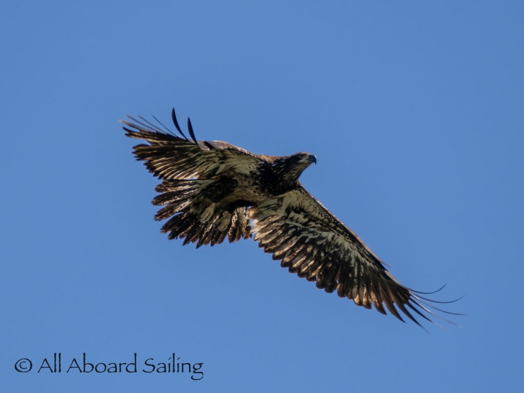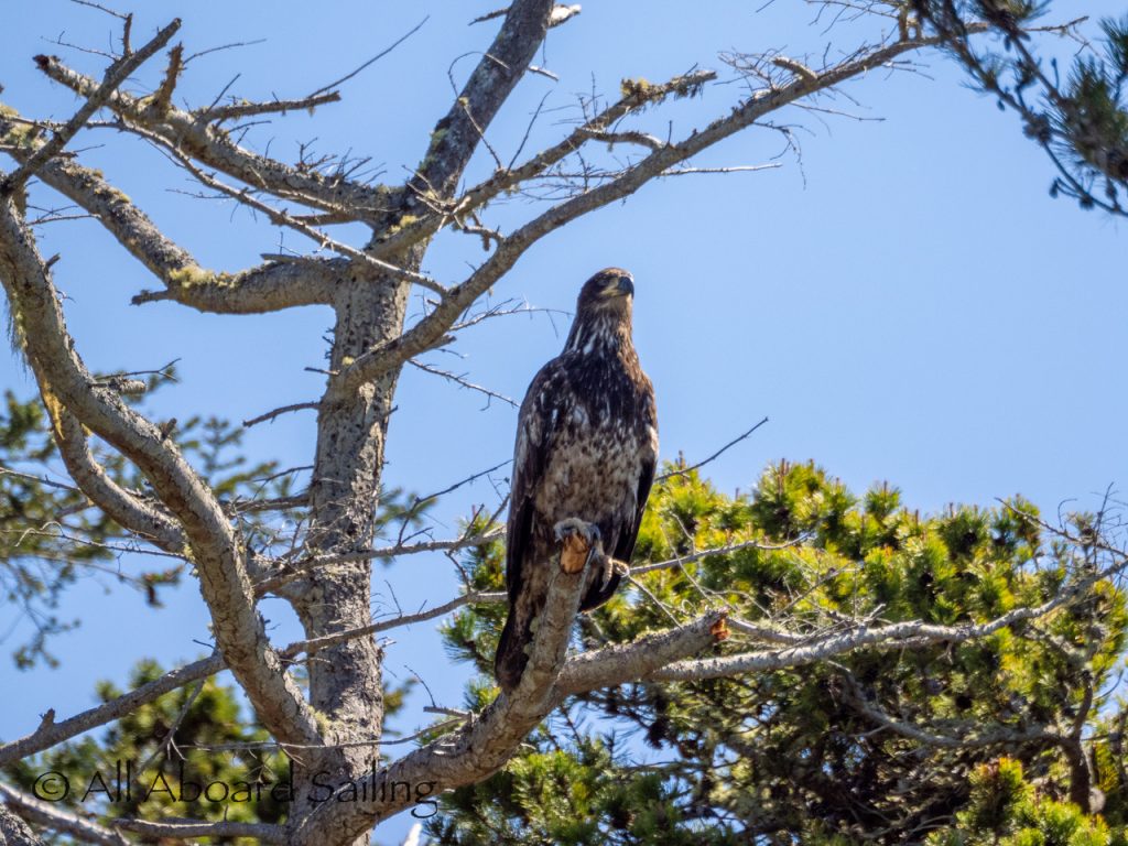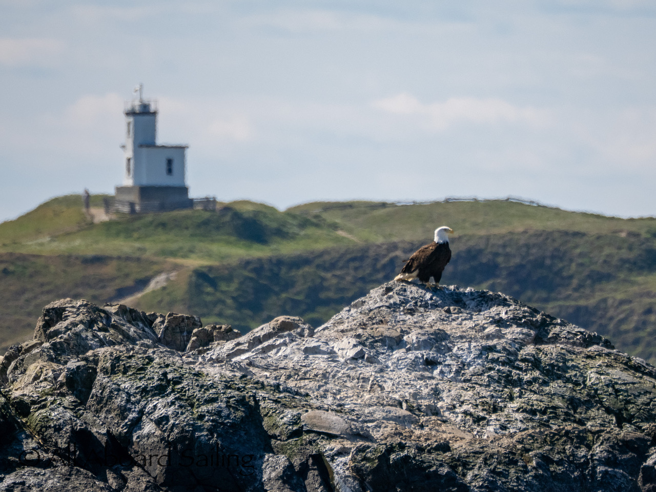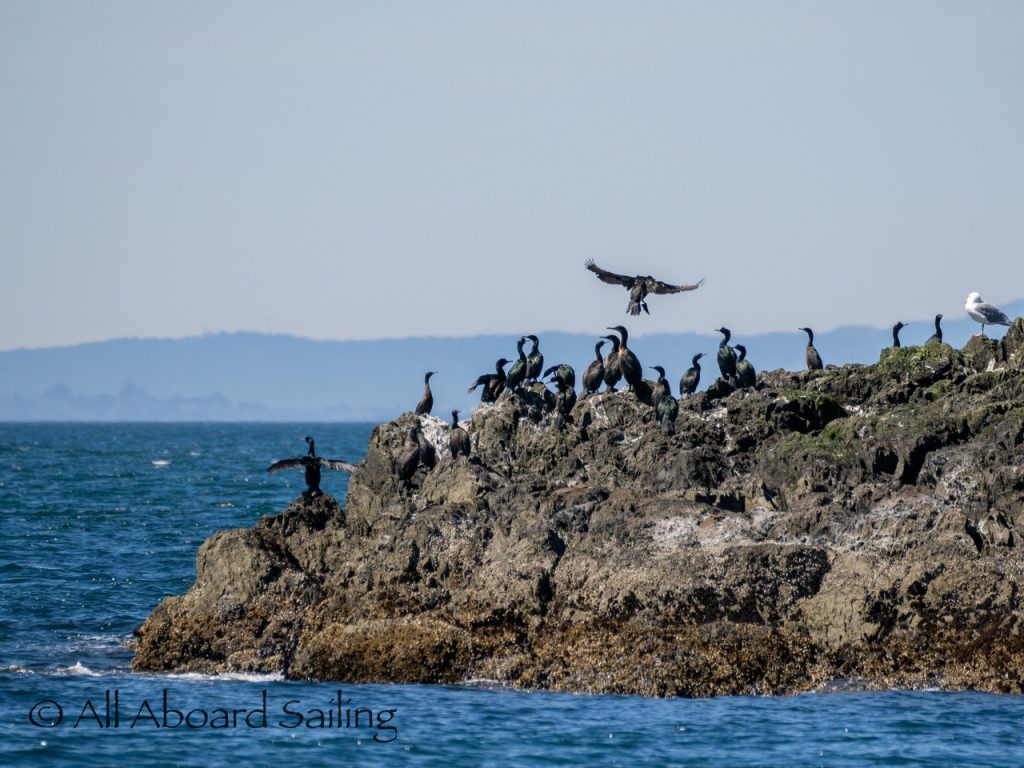 April 25, 2026 – Today we set a course for south. We drifted through the narrow channel by Turn Island passing harbor seals resting on the rocks. Near Deadman Island we saw an adult bald eagle chase a juvenile bald eagle and gave some great vocals after returning to its roost in a nearby tree. Winds were very light in San Juan Channel but picked up outside of Cattle Pass. We sailed quickly towards Whale Rocks where there were many small Steller sea lions. Presumably these are young females just returning here during their breeding season accompanied by several large males. This is a fairly new trend over the last 5 years or so. Typically all the sea lions which appear to be large males leave the area end of May and return after September. This new colony sticks around Whale Rocks for a few months.