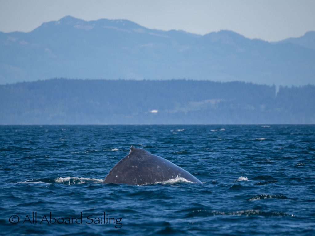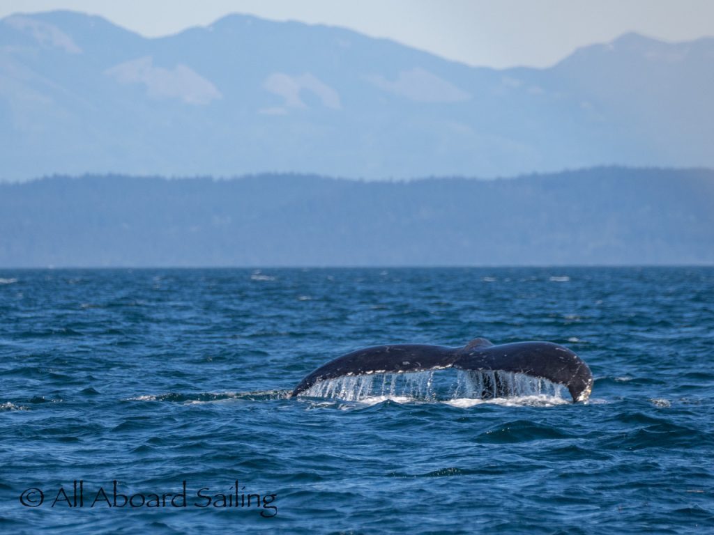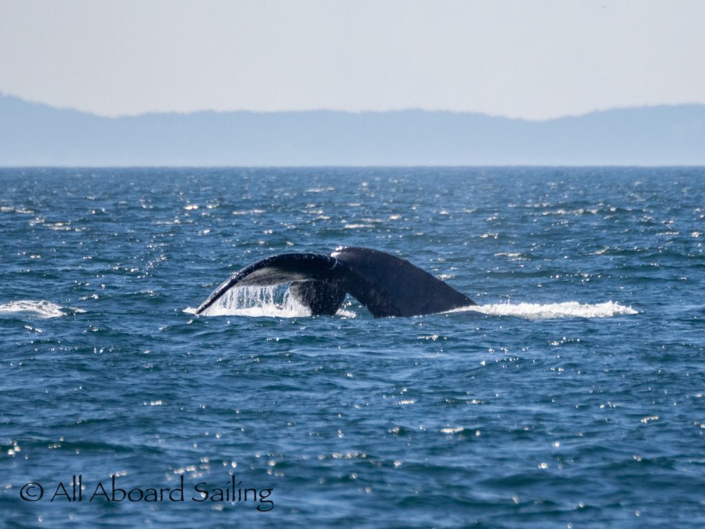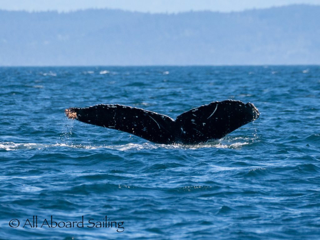 We sailed around Long Island where another eagle perched near its nest before continuing our course to MacArthur Bank in search of whales. In the distance Capt David spotted a humpback whale. It was quite tricky getting dialed in, but eventually we realised it was doing circles on the bank. The humpback whale was identified as BCX1800 “Gretzky”. We were treated to the humpback doing a beautiful cartwheel and several peduncle throws of its huge tail. Super cool! After some really nice views we left the whale to head back to Cattle Pass.