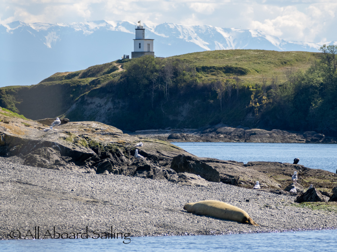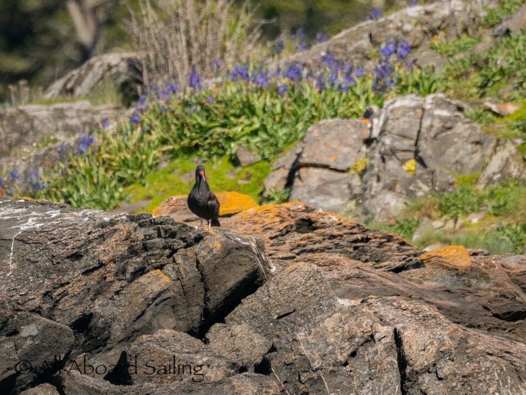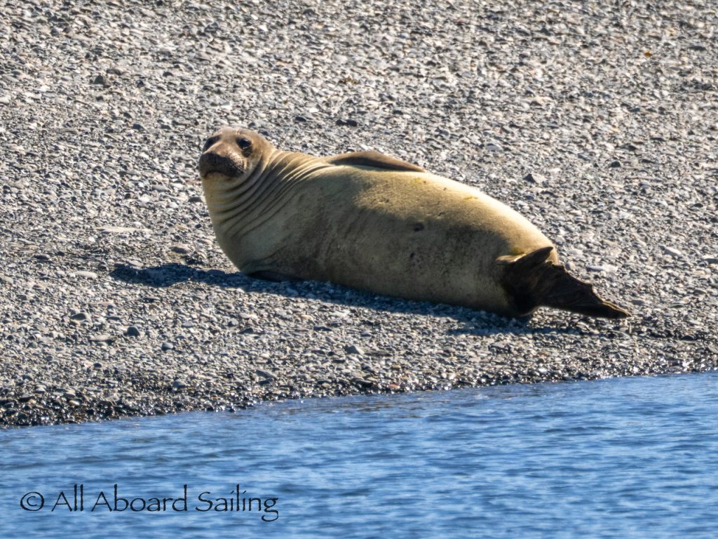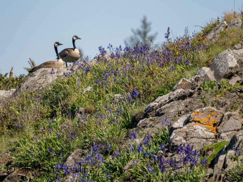 Drifted quickly by Whale Rocks where a bald eagle joined the Steller sea lions. A black oystercatcher and a pair of Canada Geese were hanging out near some great camas flowers at Deadman Island. We crossed Cattle Pass to Goose Island to see out a rare sight of an elephant seal who happened to be sleeping on the beach. We’ve had an elephant seal returning here and to Harbor Rock over the last few years. Wonder if it’s the same one… anyway this was very exciting to see. It was a great day exploring and a special birthday sail for Capt David!